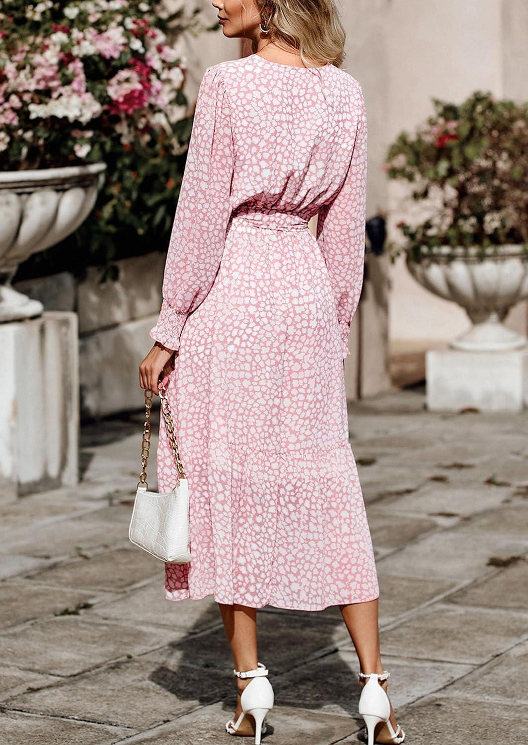 PRETTYGARDEN Women's Floral Boho Dress Fall Long Sleeve Wrap V Neck Ruffle Flowy Maxi Spring Wedding Guest Vacation Dresses(Pink)
