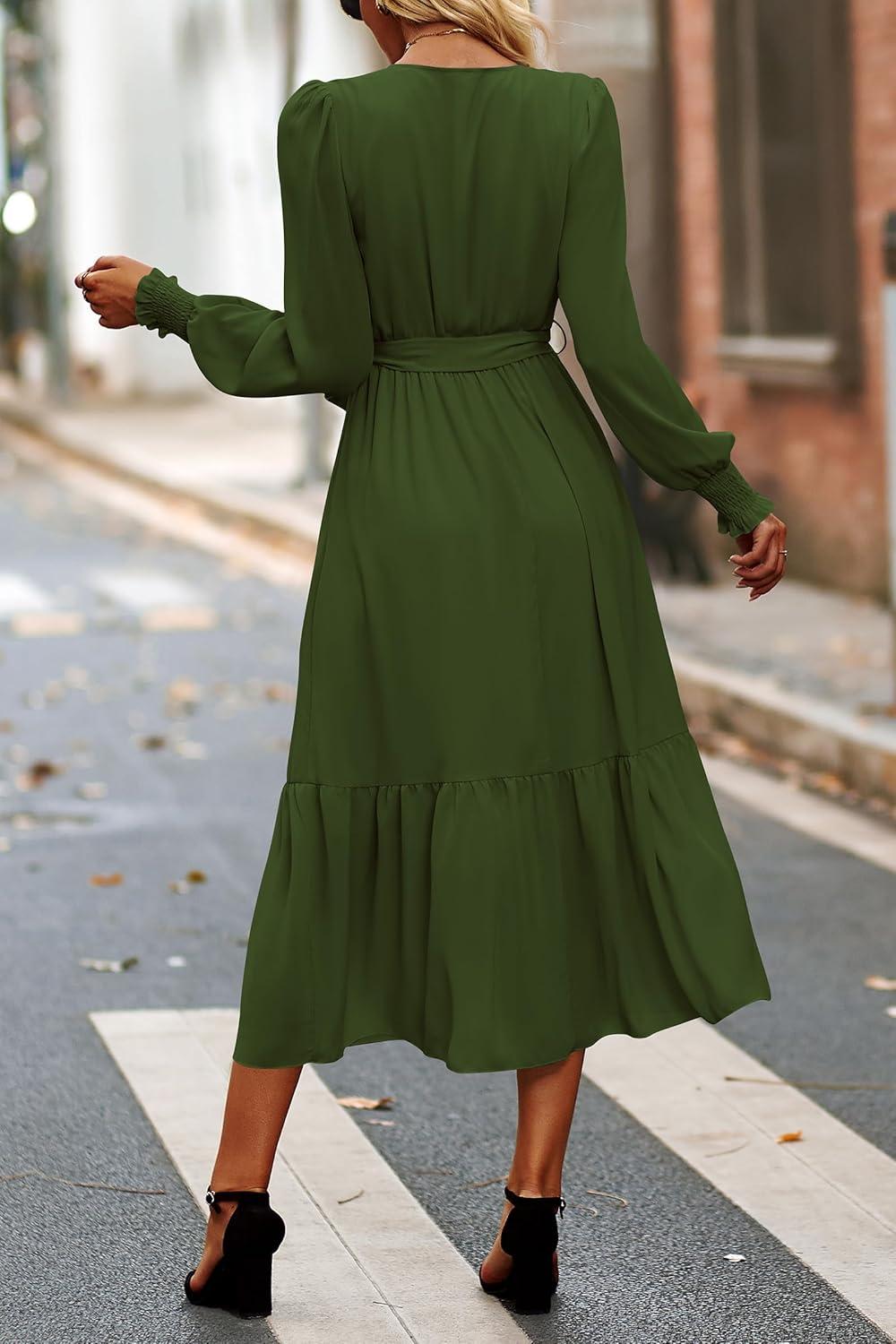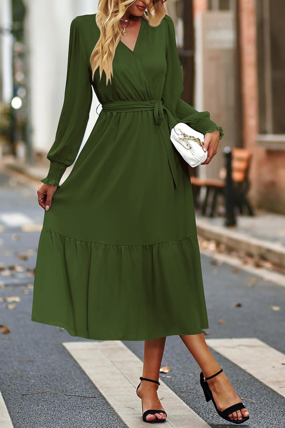 PRETTYGARDEN Women's Floral Boho Dress Fall Long Sleeve Wrap V Neck Ruffle Flowy Maxi Spring Wedding Guest Vacation Dresses(Solid Army Green)