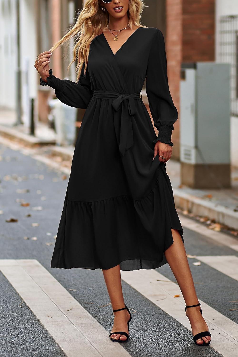PRETTYGARDEN Women’s Floral Boho Dress Fall Long Sleeve Wrap V Neck Ruffle Flowy Maxi Spring Wedding Guest Vacation Dresses(Solid Black)