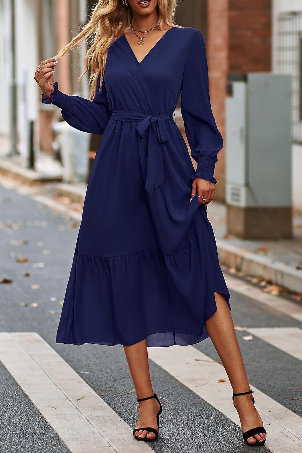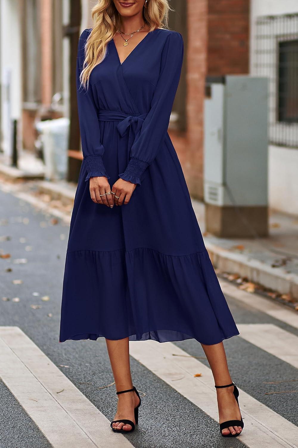 PRETTYGARDEN Women's Floral Boho Dress Fall Long Sleeve Wrap V Neck Ruffle Flowy Maxi Spring Wedding Guest Vacation Dresses(Solid Navy)