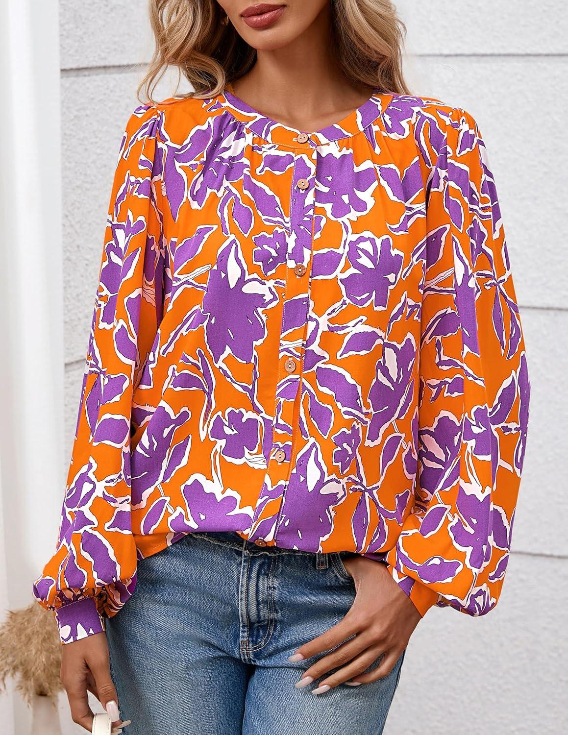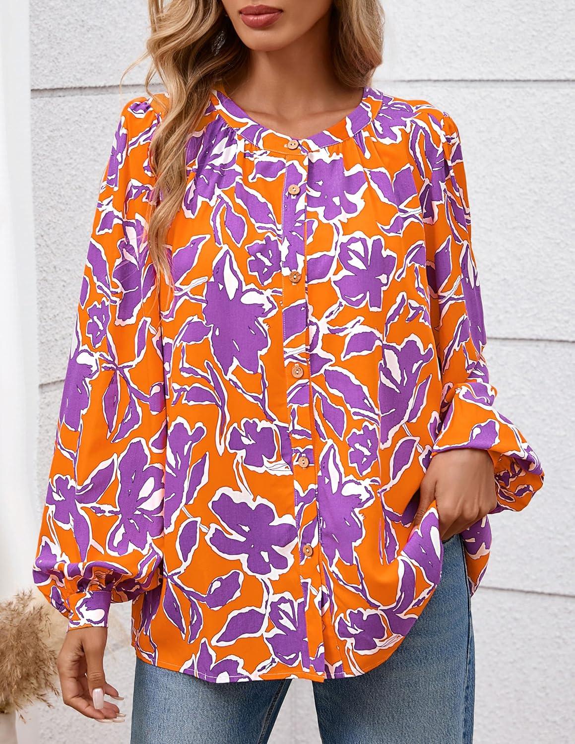 PRETTYGARDEN Women's Floral Button Down Blouse 2025 Fall Fashion Dressy Casual Long Sleeve Oversized Shirts Top Boho Clothes(Orange)