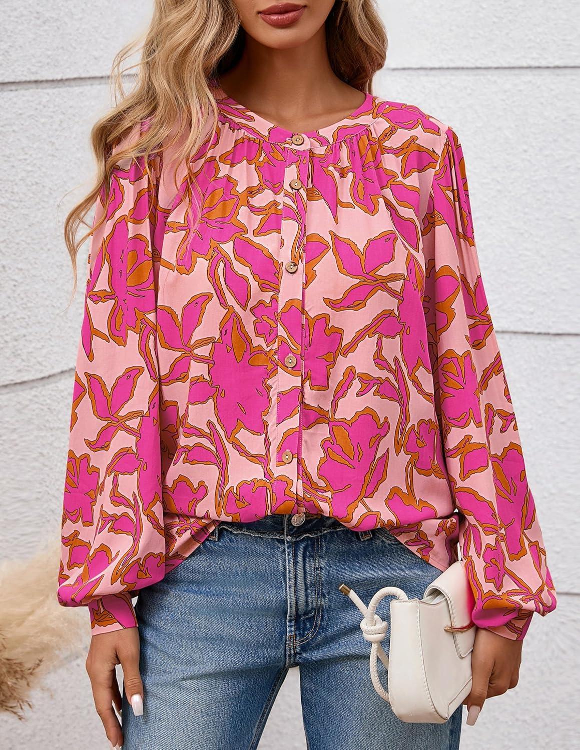 PRETTYGARDEN Women's Floral Button Down Blouse 2025 Fall Fashion Dressy Casual Long Sleeve Oversized Shirts Top Boho Clothes(Pink)