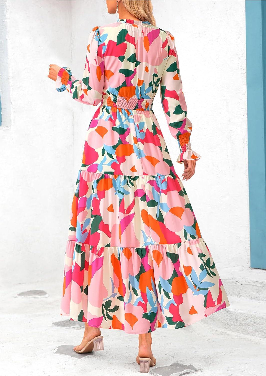PRETTYGARDEN Women's Floral Maxi Dress 2025 Fall Long Sleeve V Neck Casual A Line Long Flowy Boho Party Dresses(Floral Apricot Rose Red)
