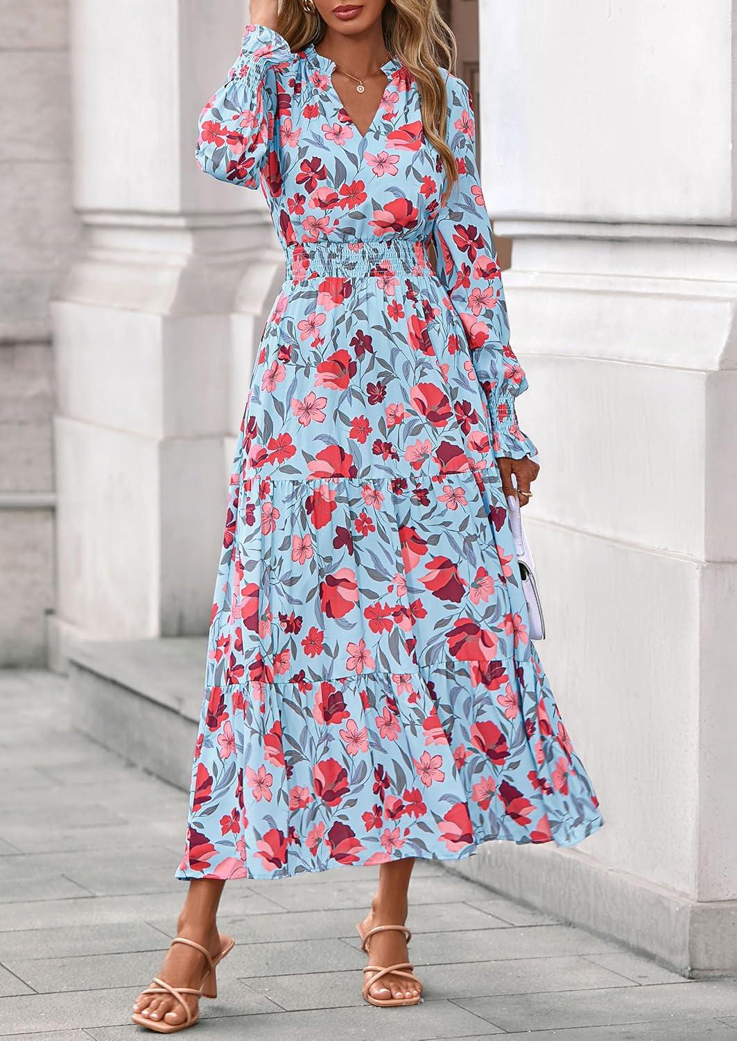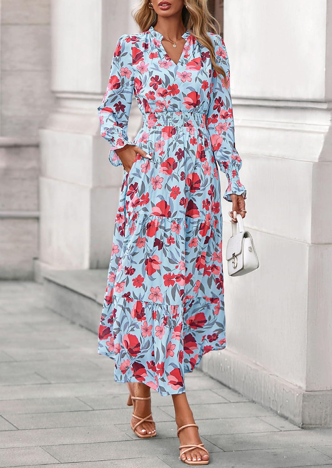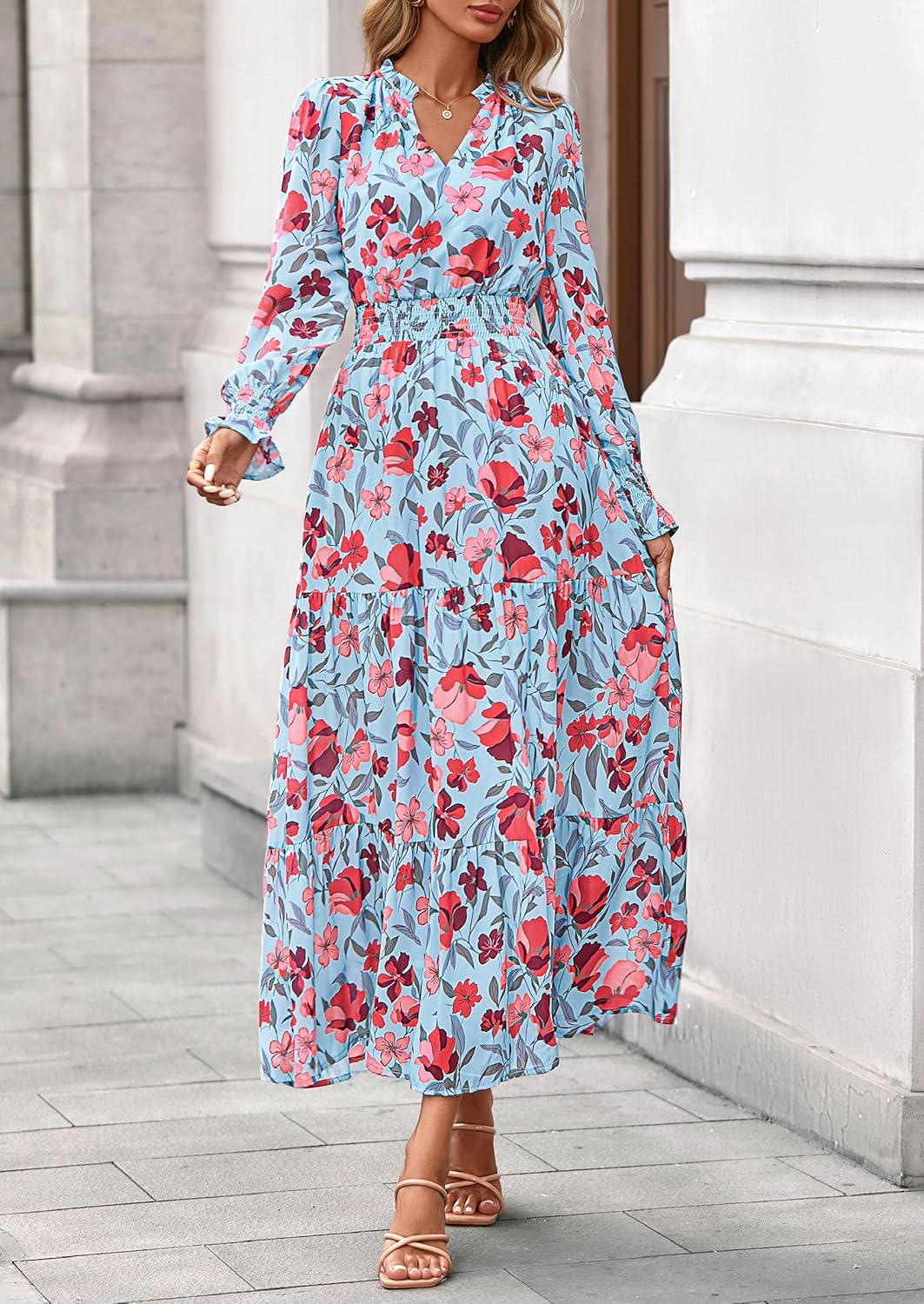 PRETTYGARDEN Women's Floral Maxi Dress 2025 Fall Long Sleeve V Neck Casual A Line Long Flowy Boho Party Dresses(Floral Blue Red)