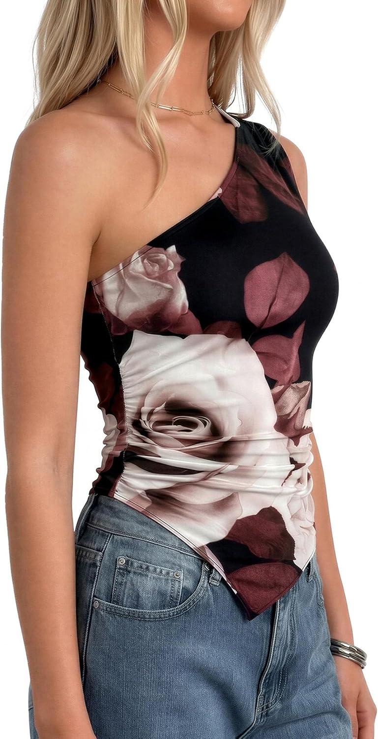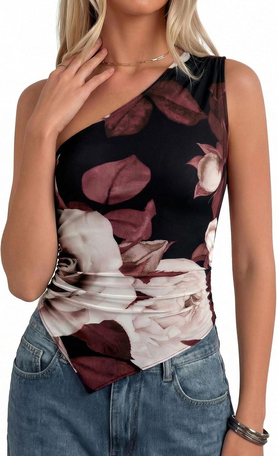 PRETTYGARDEN Women’s Floral Mesh Tops 2026 Summer Asymmetrical One Shoulder Sleeveless Ruched Shirts Spring Going Out Clothes(Black Apricot Floral)