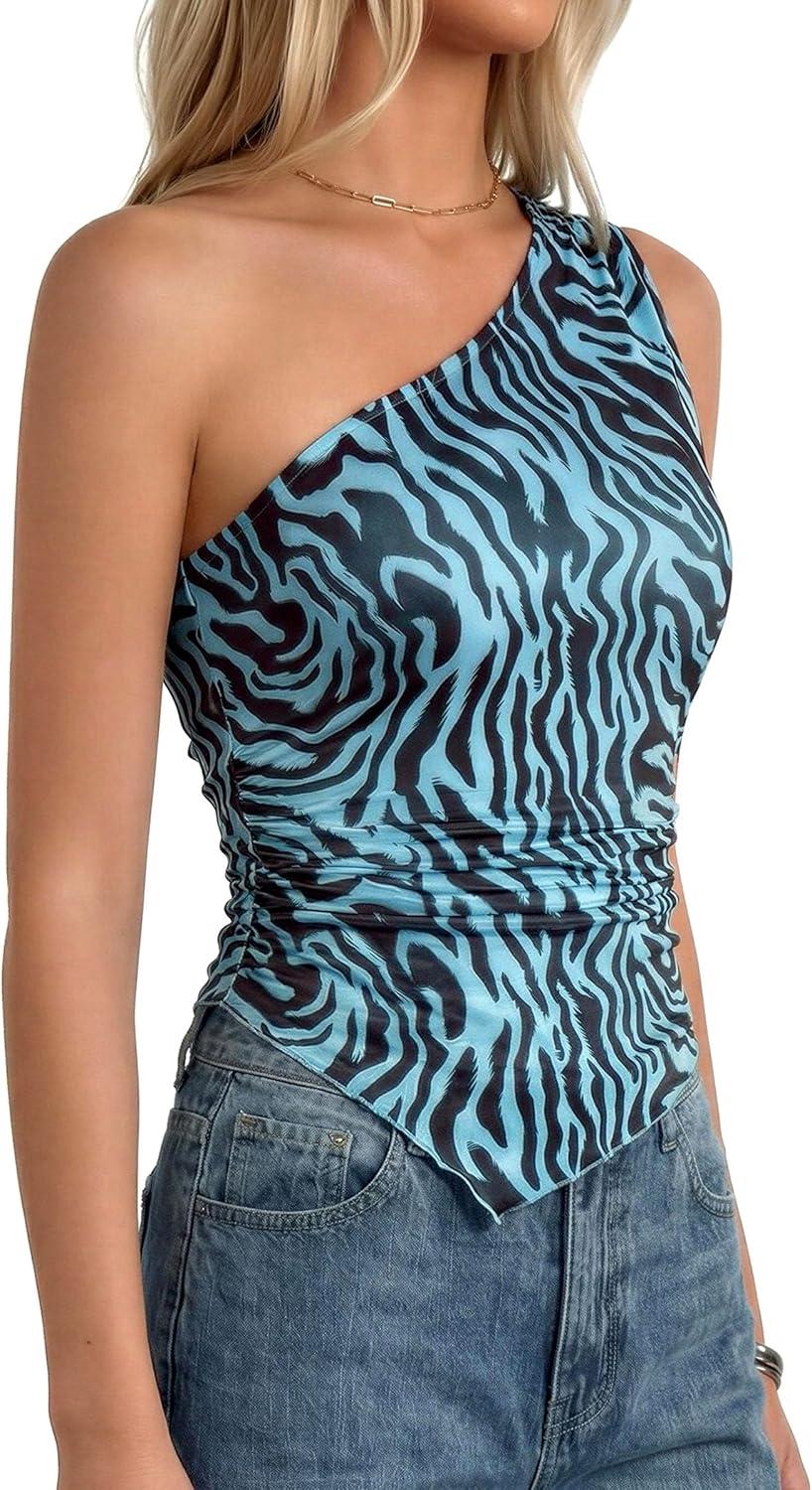 PRETTYGARDEN Women's Floral Mesh Tops 2026 Summer Asymmetrical One Shoulder Sleeveless Ruched Shirts Spring Going Out Clothes(Brown Zebra Print)