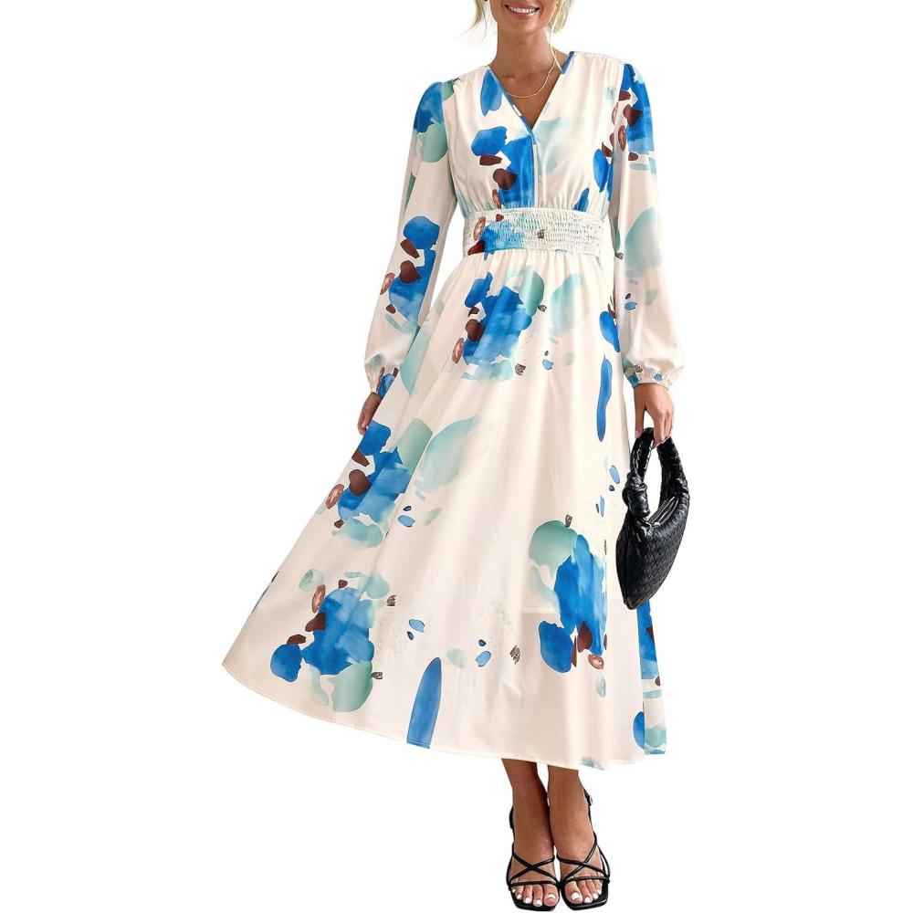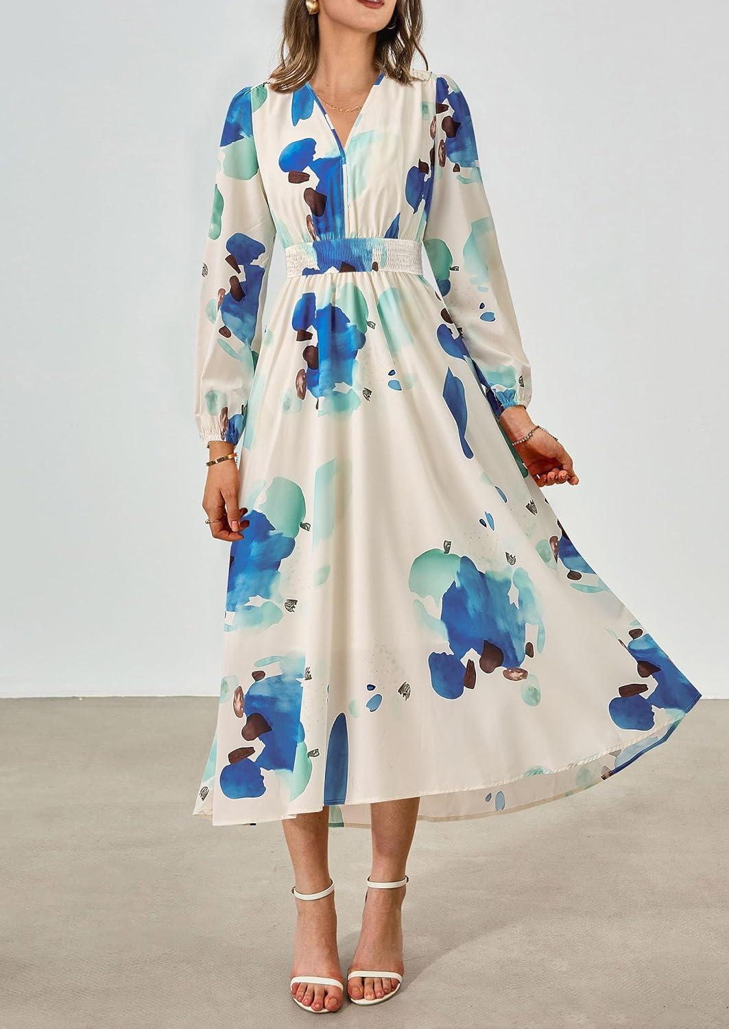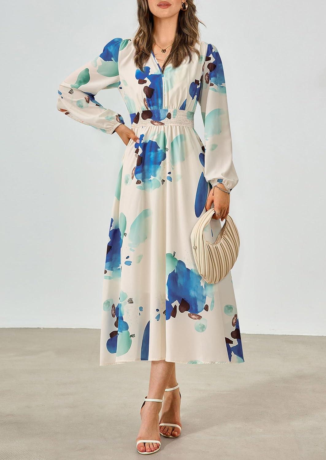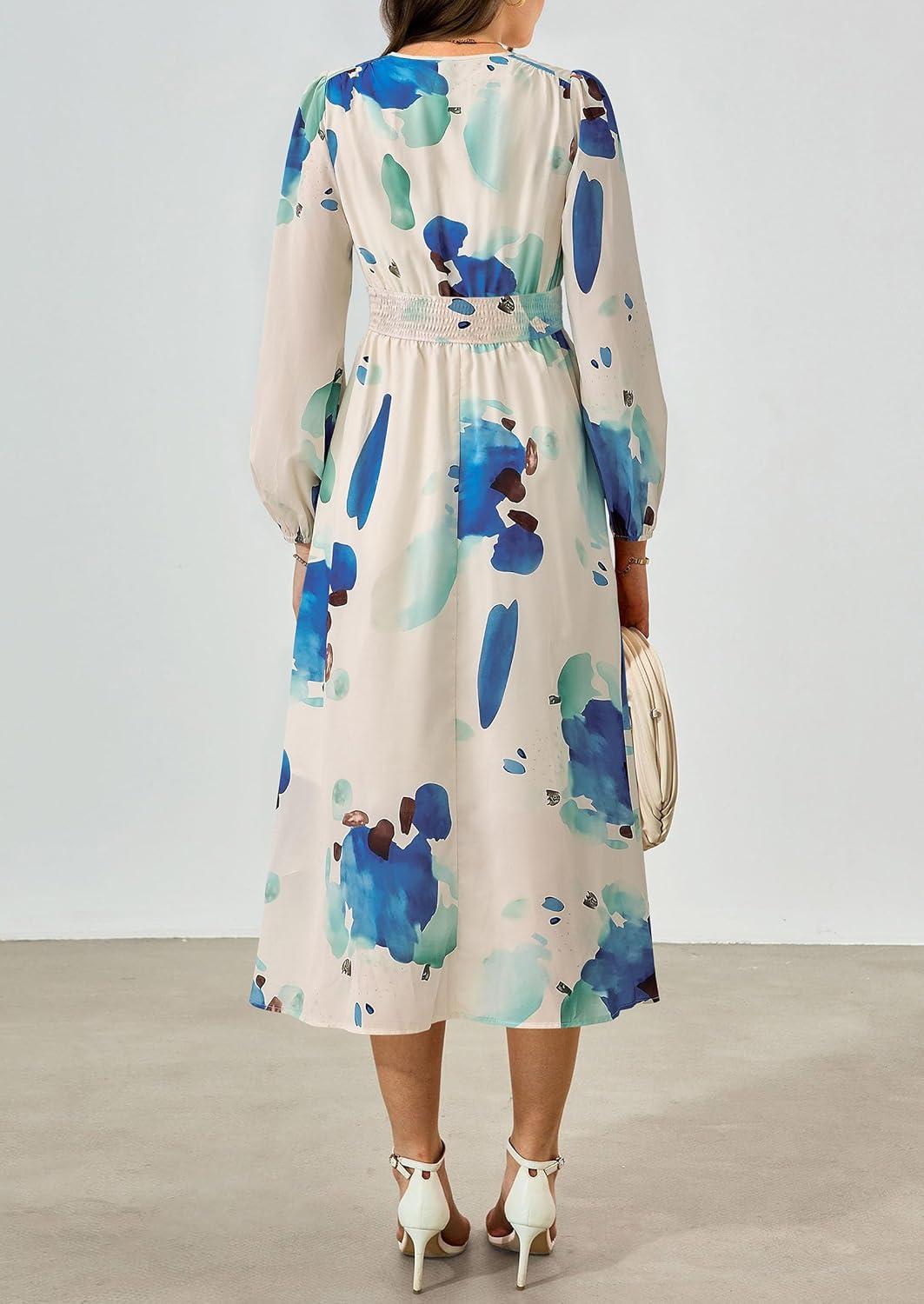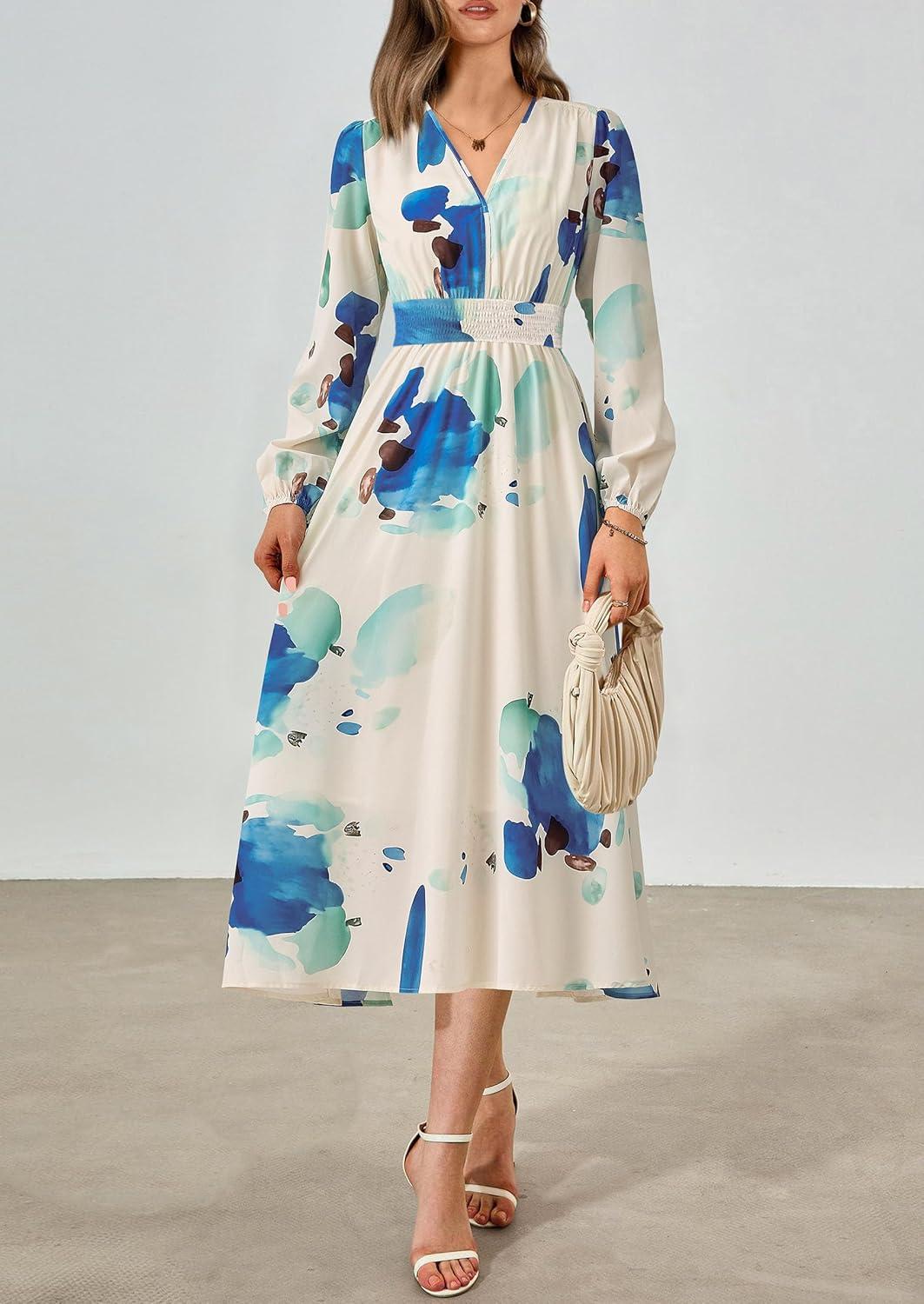 PRETTYGARDEN Women’s Floral Midi Dress Casual Fall V Neck Long Sleeve Flowy Spring Beach Wedding Guest Vacation Dresses(Blue Watercolour)