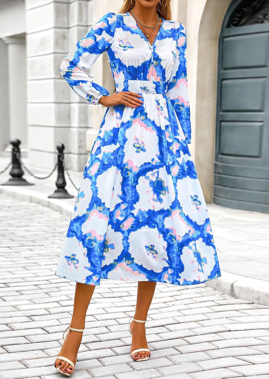 PRETTYGARDEN Women’s Floral Midi Dress Casual Fall V Neck Long Sleeve Flowy Spring Beach Wedding Guest Vacation Dresses(Blue White Floral)