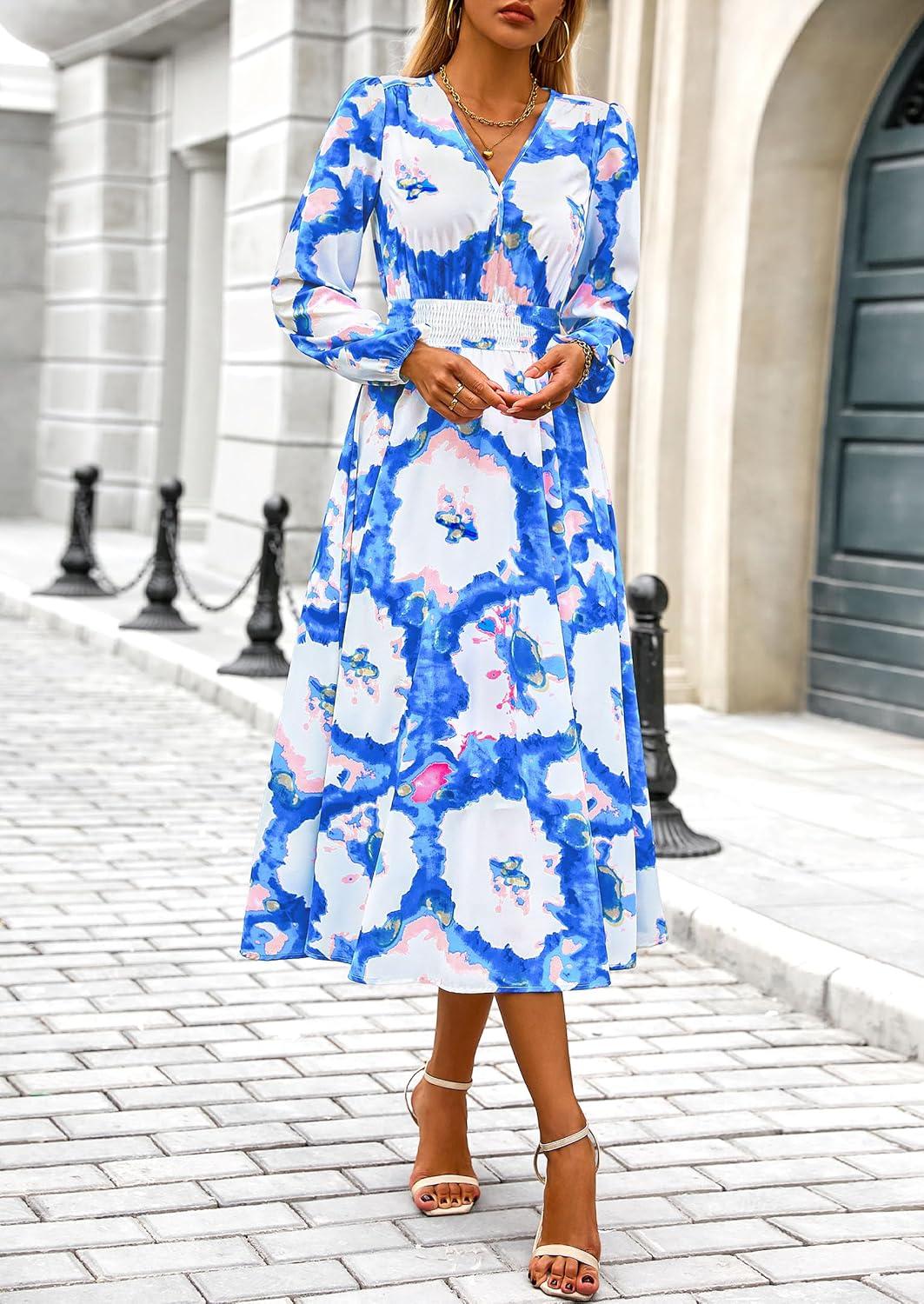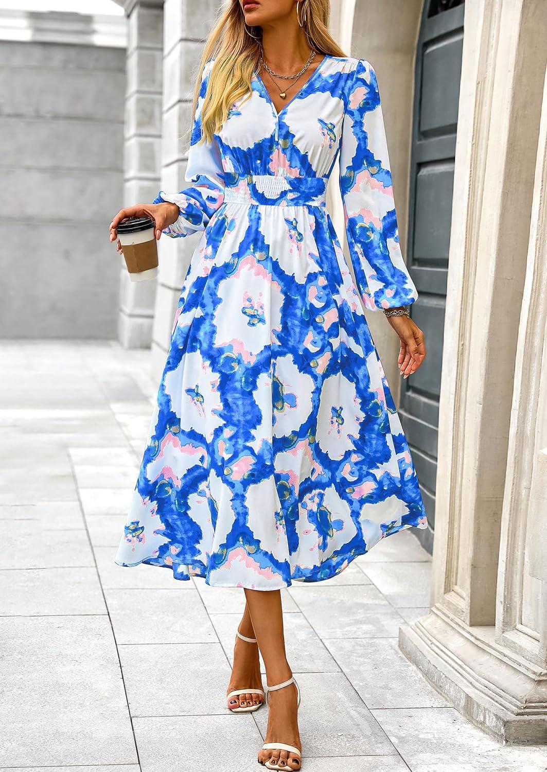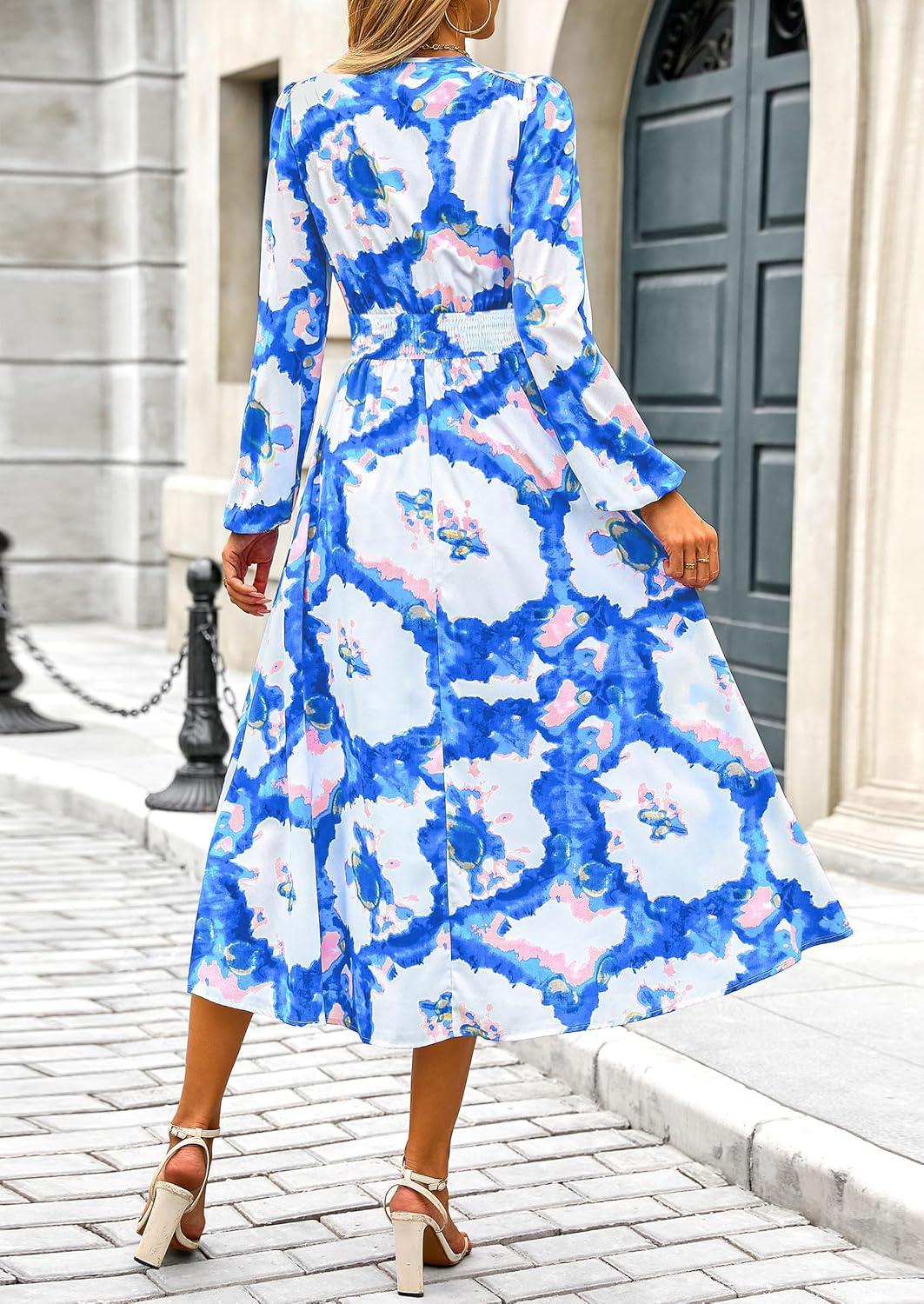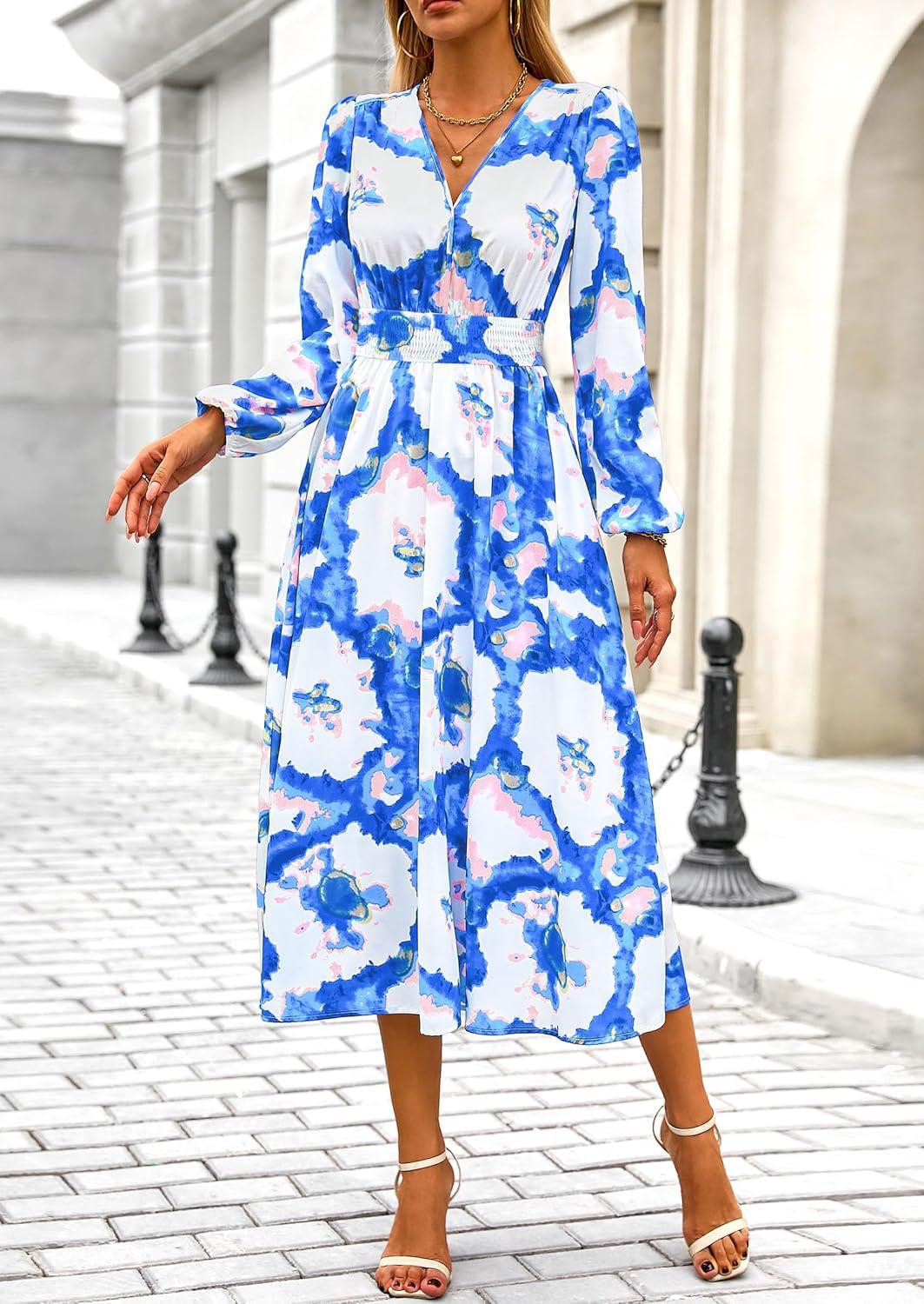 PRETTYGARDEN Women's Floral Midi Dress Casual Fall V Neck Long Sleeve Flowy Spring Beach Wedding Guest Vacation Dresses(Blue White Watercolour)