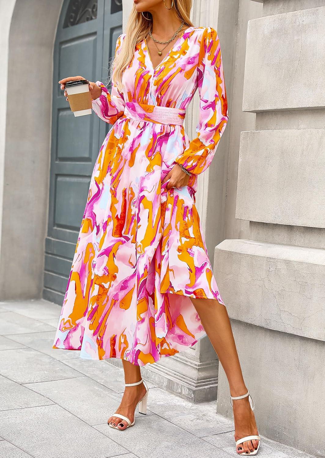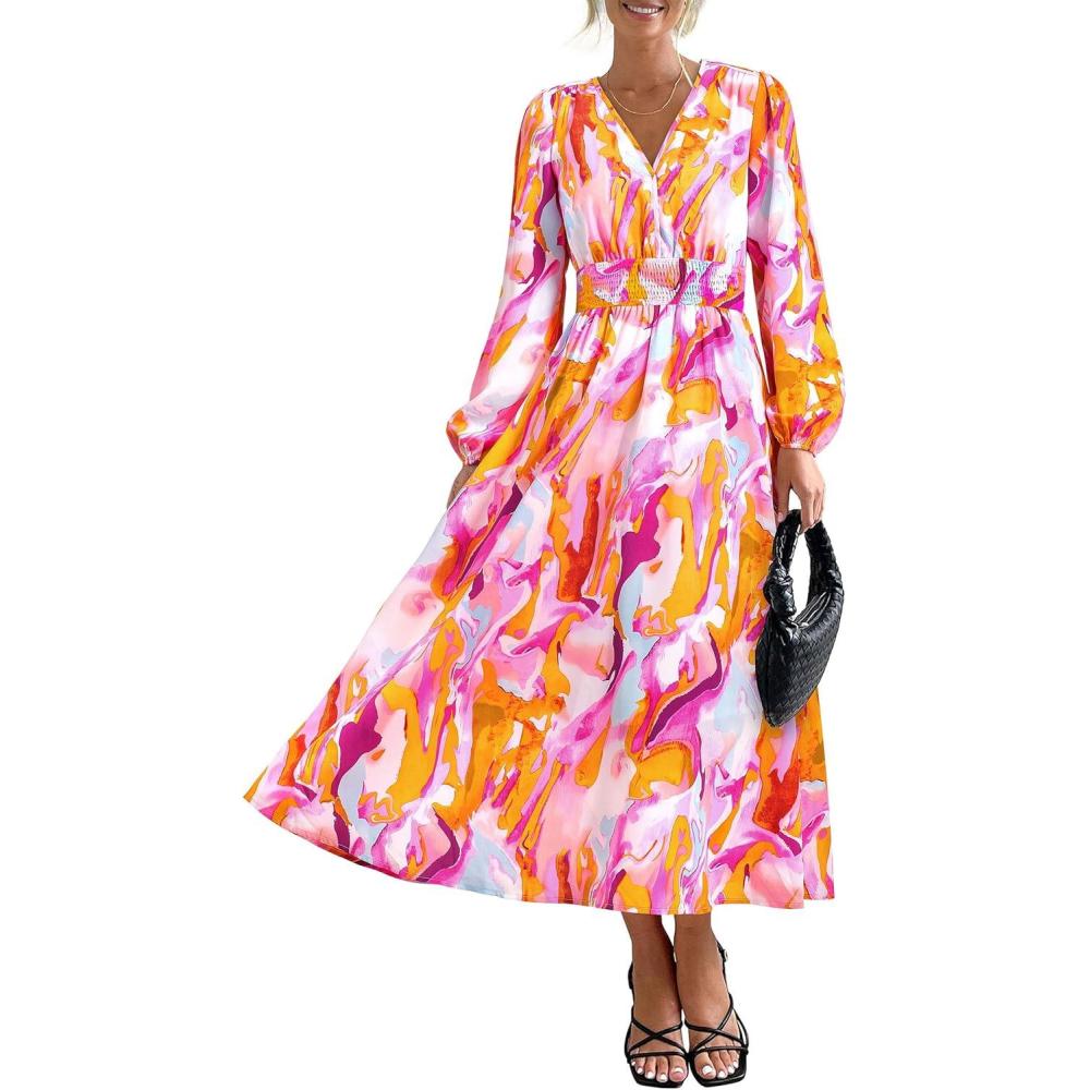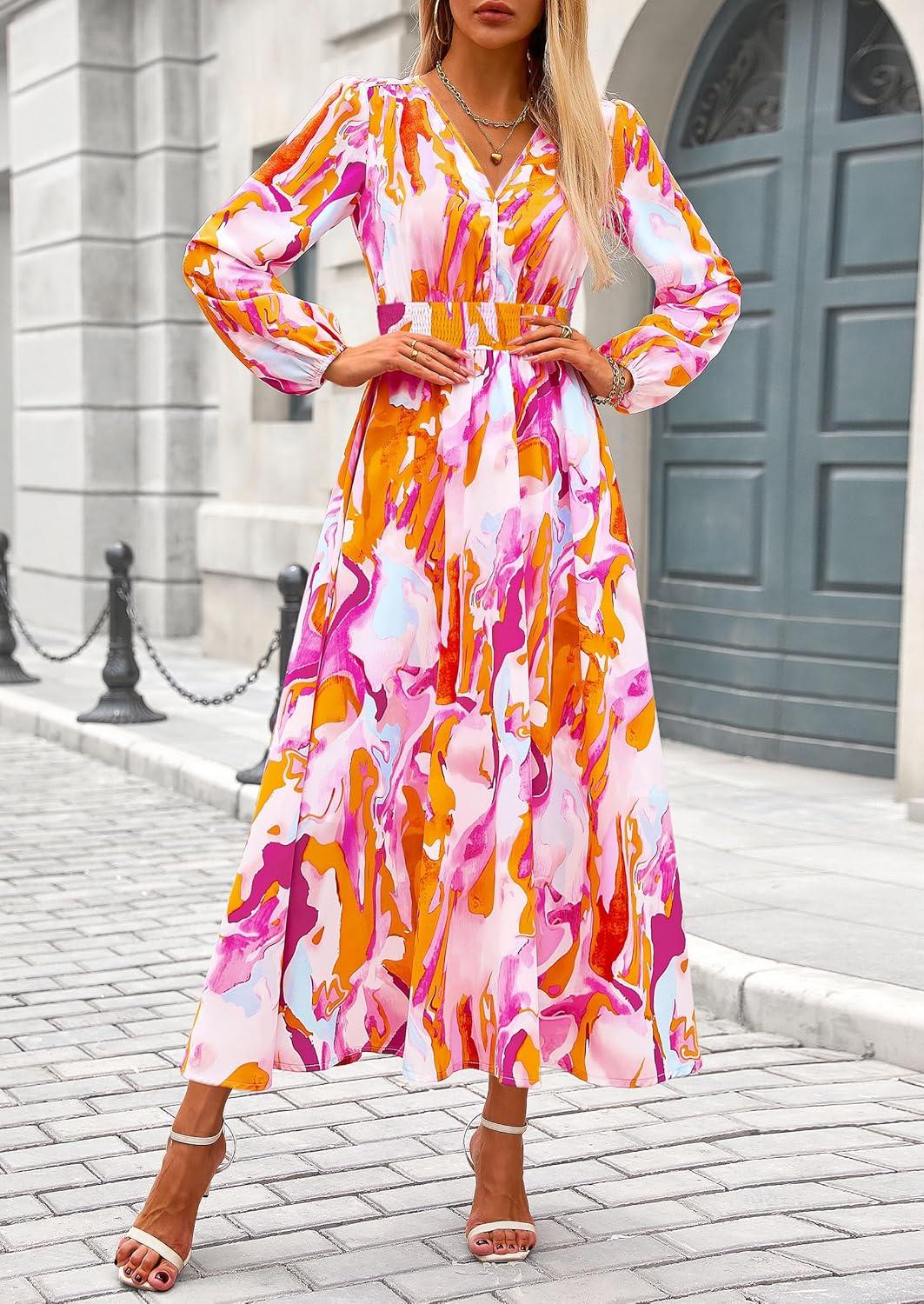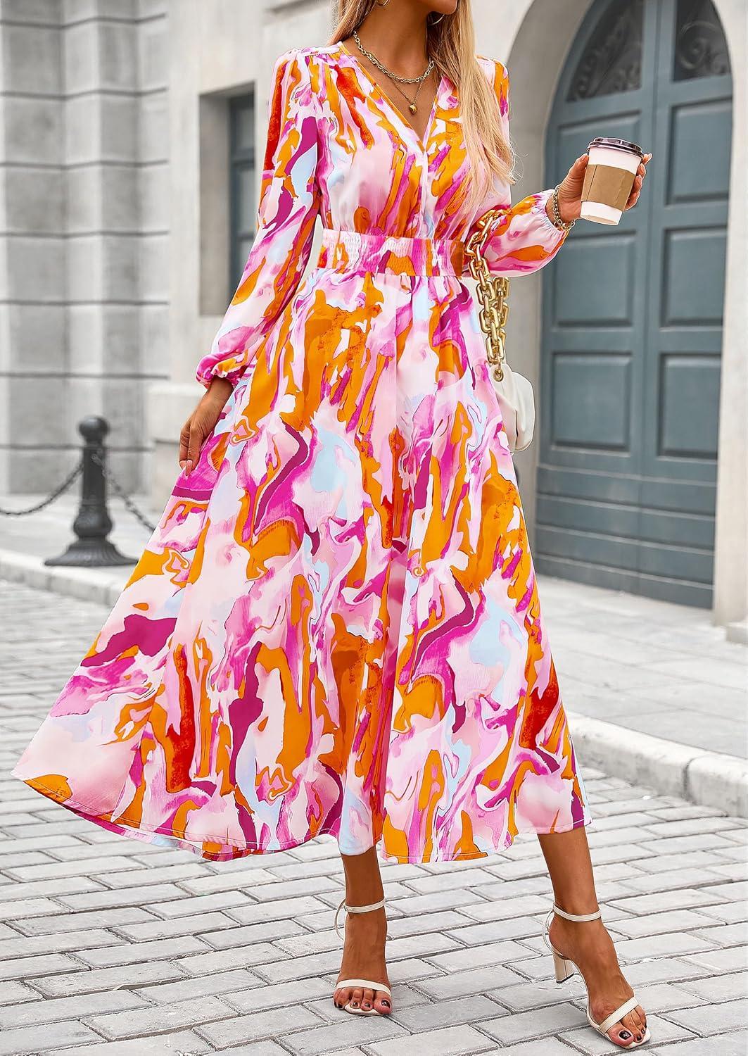 PRETTYGARDEN Women's Floral Midi Dress Casual Fall V Neck Long Sleeve Flowy Spring Beach Wedding Guest Vacation Dresses(Multicolored Print)