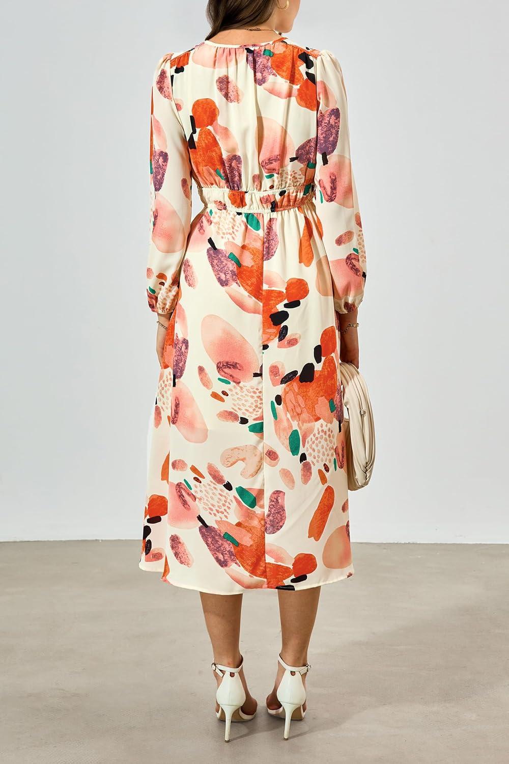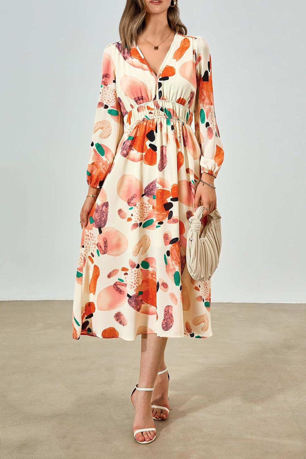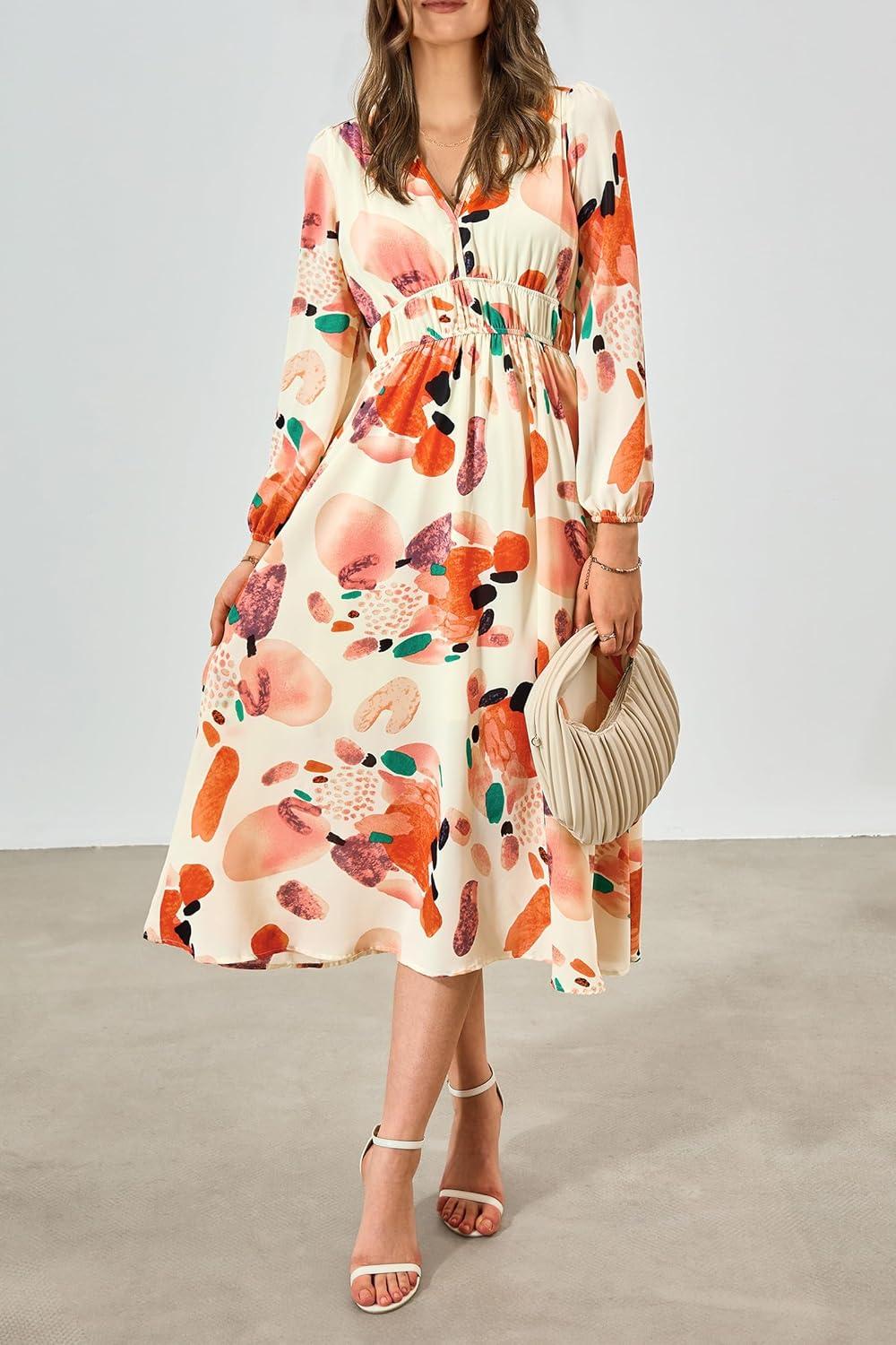 PRETTYGARDEN Women’s Floral Midi Dress Casual Fall V Neck Long Sleeve Flowy Spring Beach Wedding Guest Vacation Dresses(Orange Watercolour)