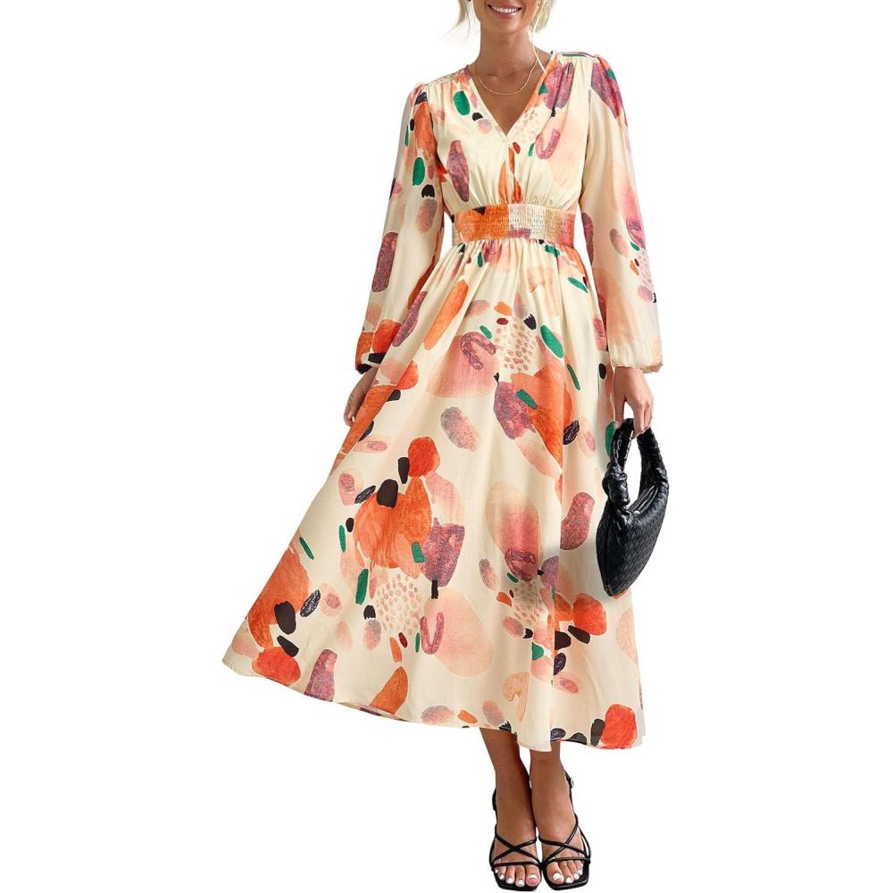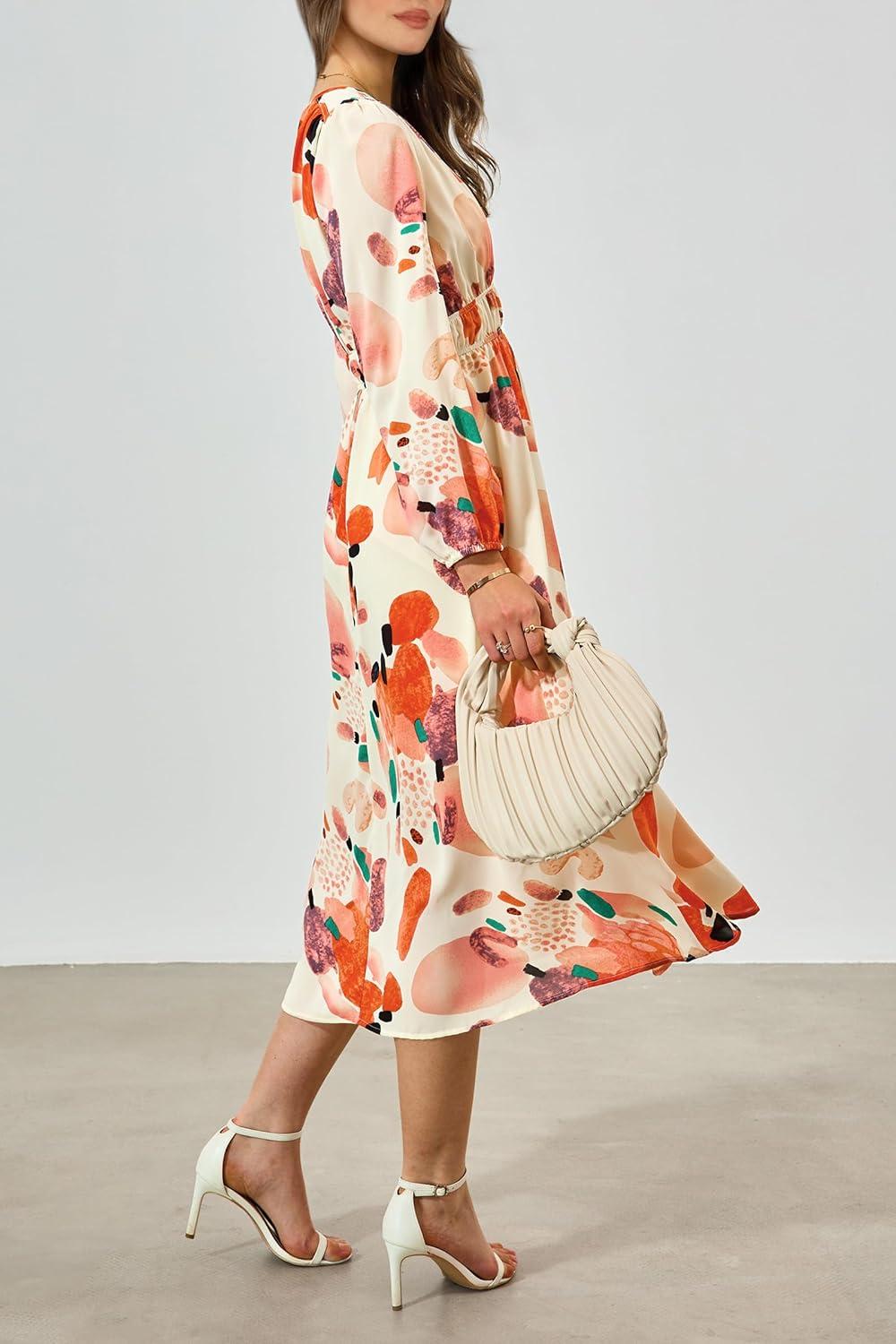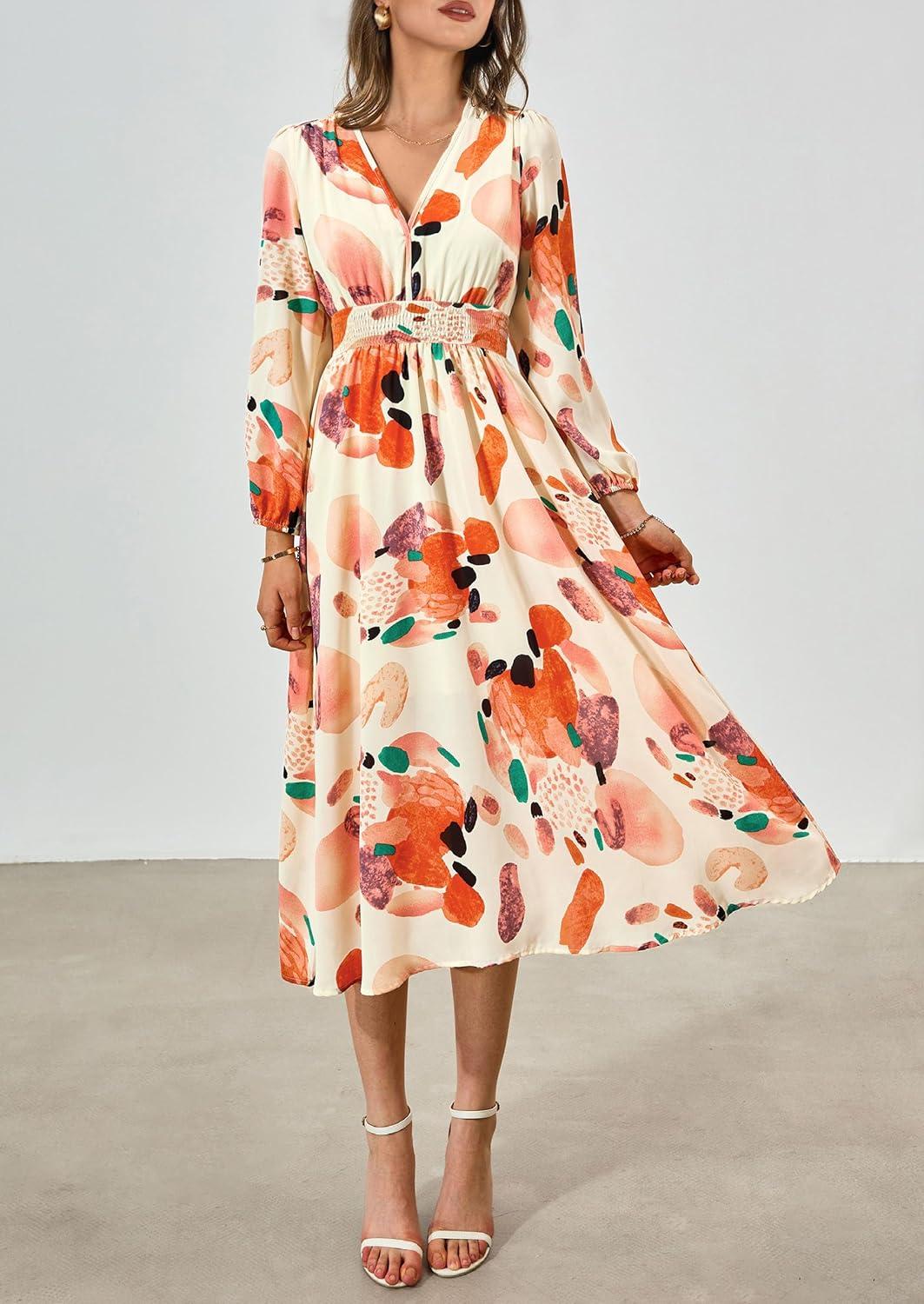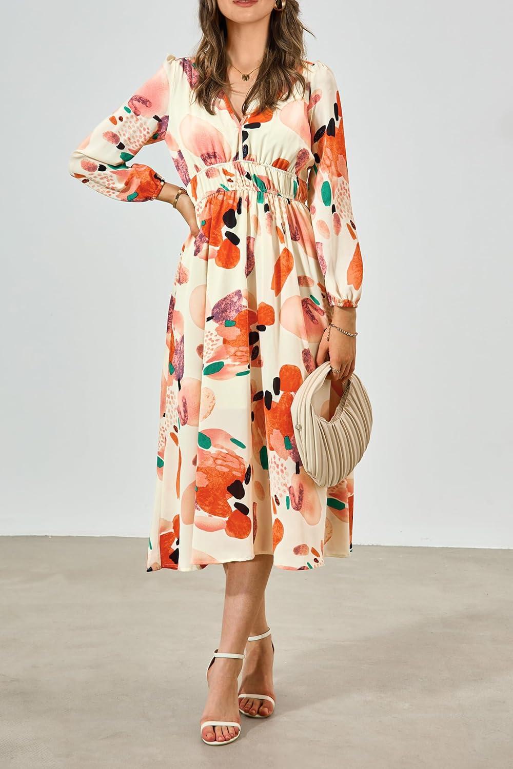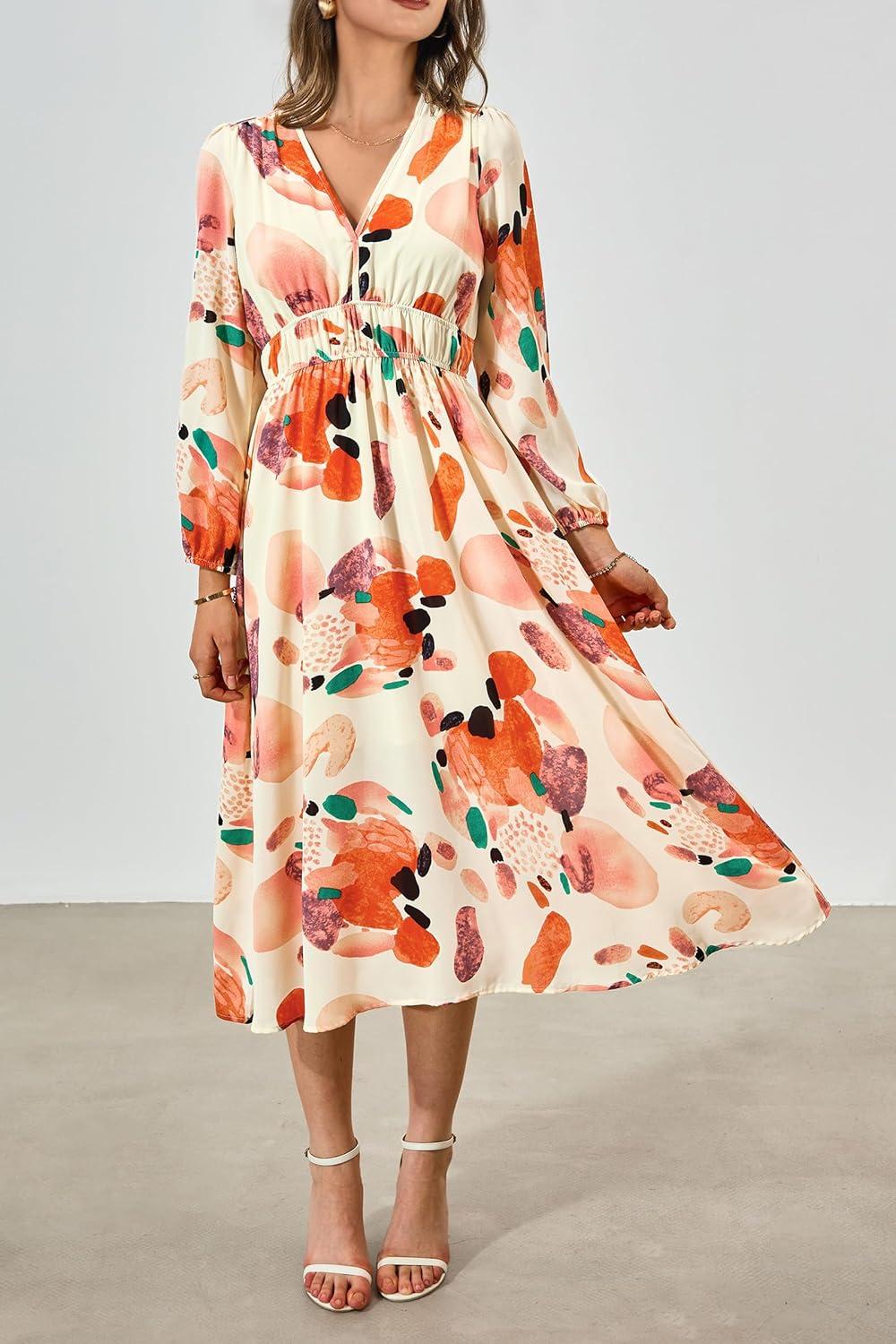 PRETTYGARDEN Women's Floral Midi Dress Casual Fall V Neck Long Sleeve Flowy Spring Beach Wedding Guest Vacation Dresses(Orange Watercolour)