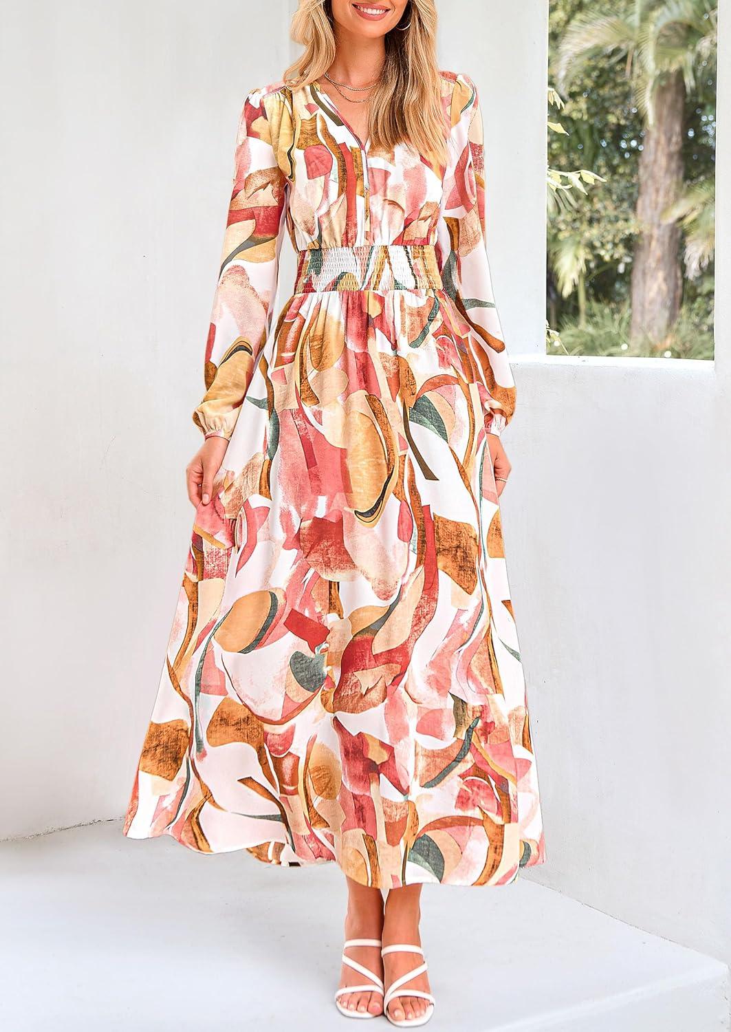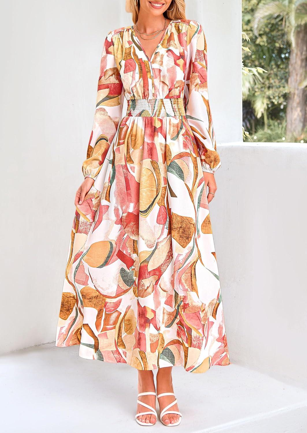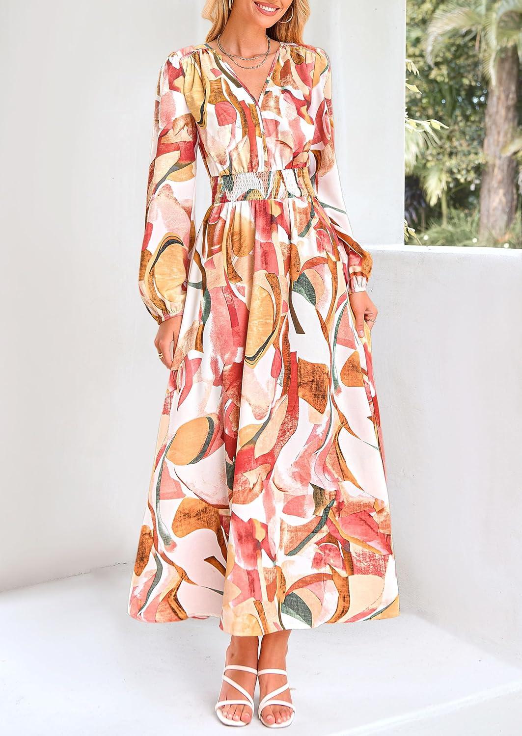 PRETTYGARDEN Women’s Floral Midi Dress Casual Fall V Neck Long Sleeve Flowy Spring Beach Wedding Guest Vacation Dresses(Orange Watercolour)