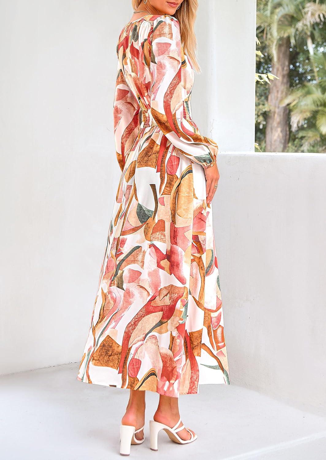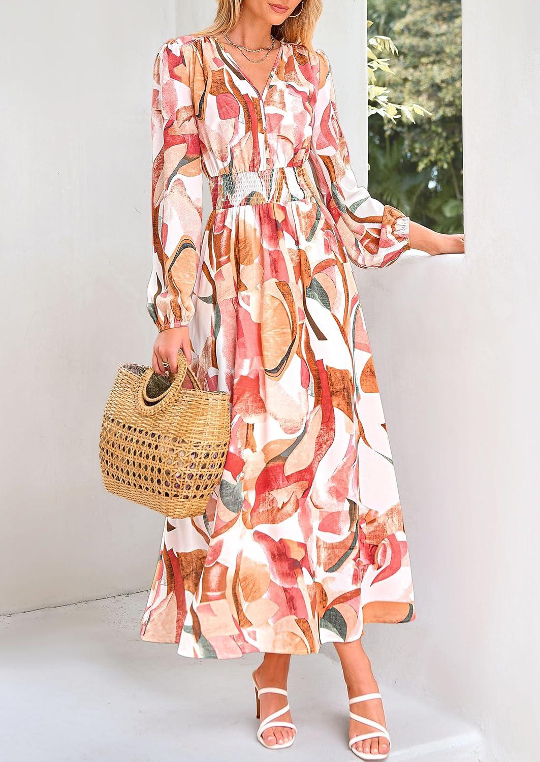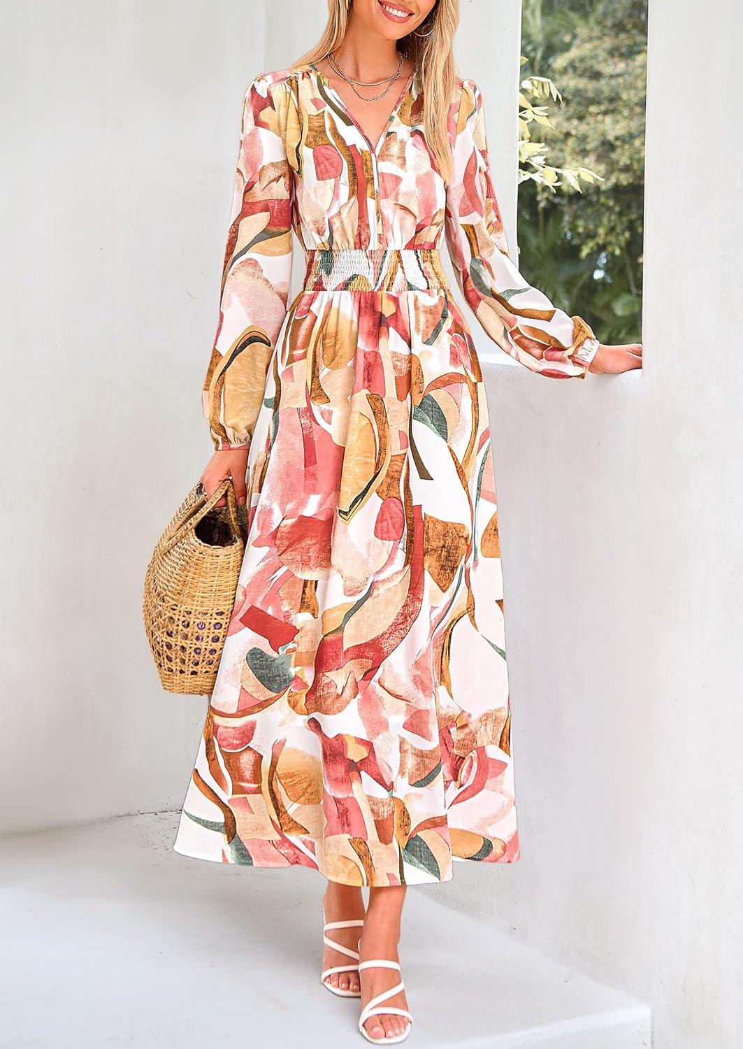 PRETTYGARDEN Women’s Floral Midi Dress Casual Fall V Neck Long Sleeve Flowy Spring Beach Wedding Guest Vacation Dresses(Orange Watercolour)