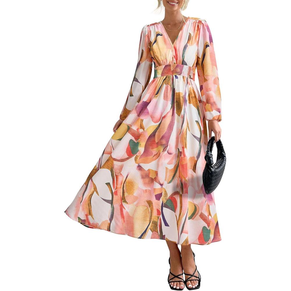 PRETTYGARDEN Women’s Floral Midi Dress Casual Fall V Neck Long Sleeve Flowy Spring Beach Wedding Guest Vacation Dresses(Pink Watercolour)