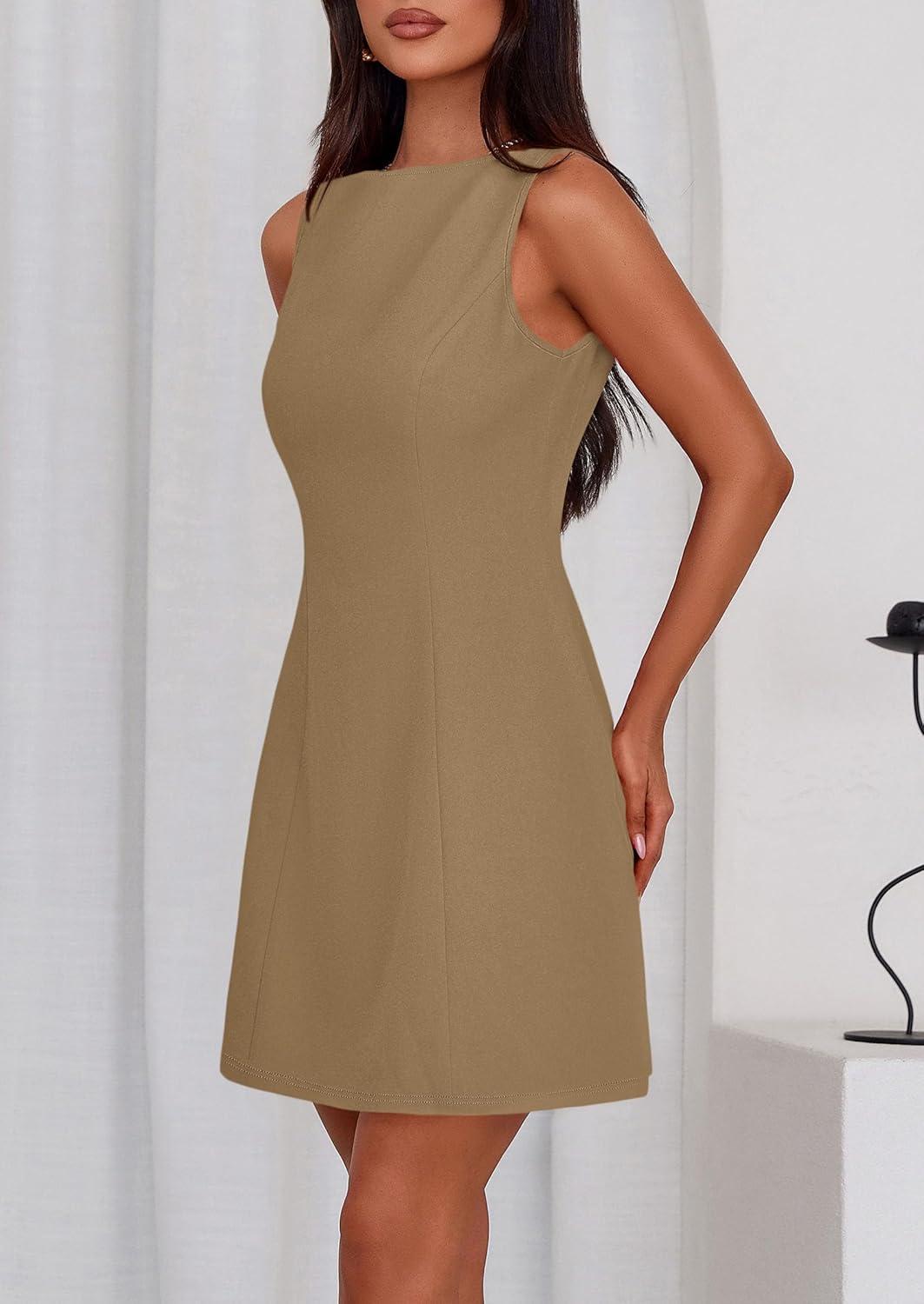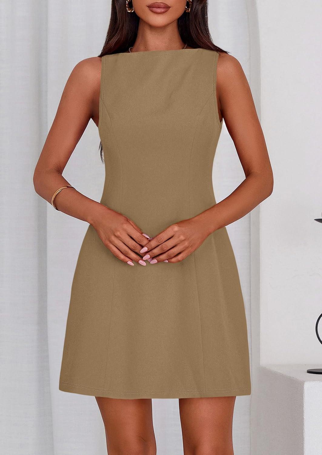 PRETTYGARDEN Womens Formal Short Dresses 2026 Summer Sleeveless Boat Neck A Line Elegant Mini Cocktail Party Dress(Dark Khaki)