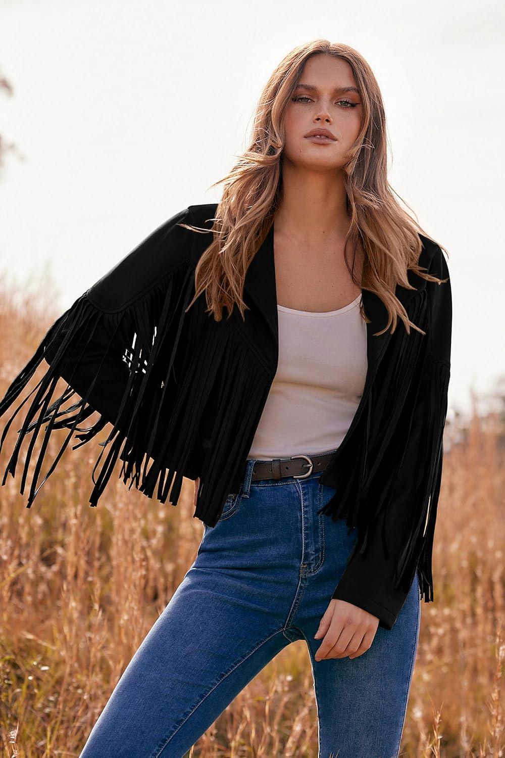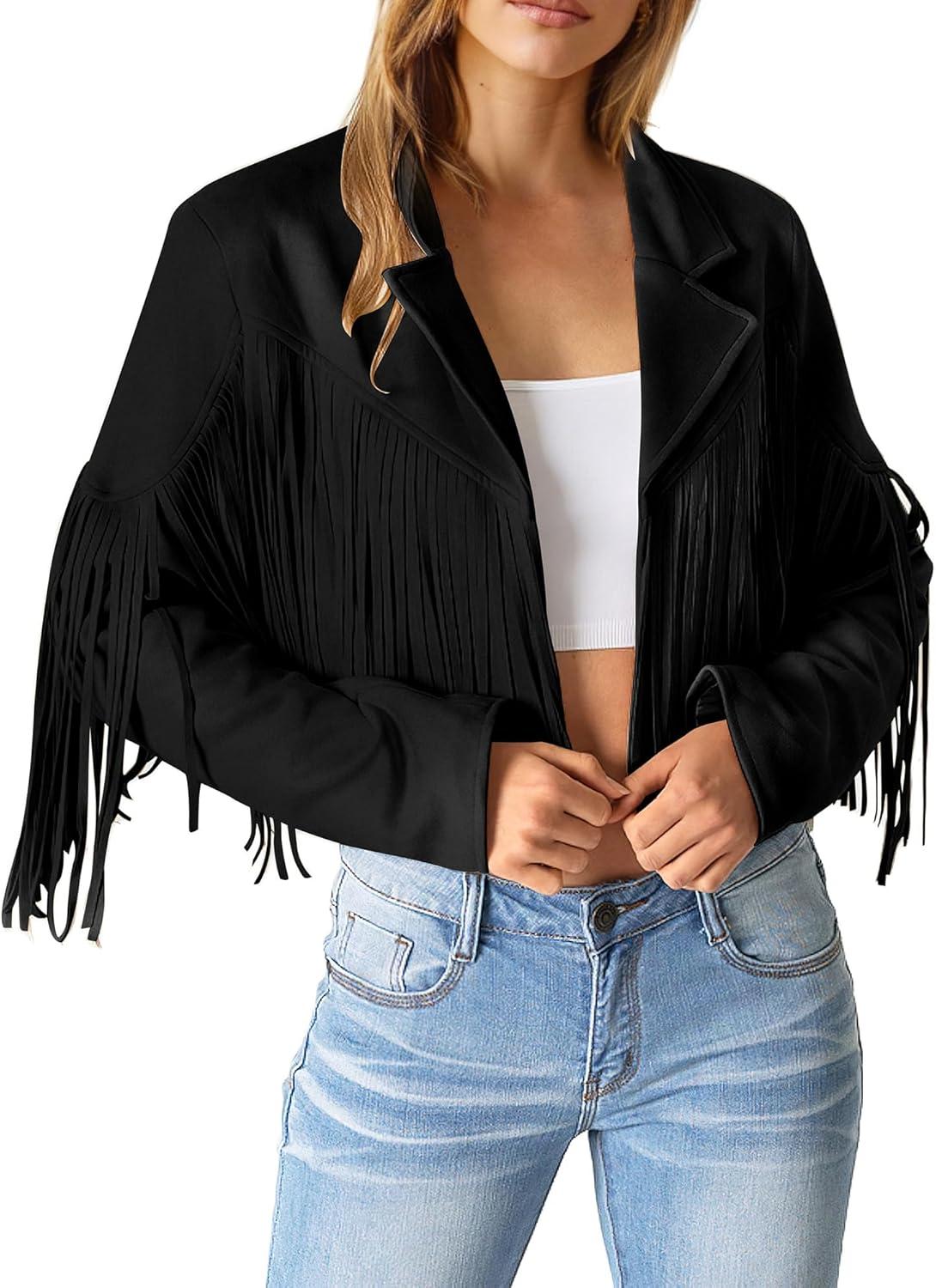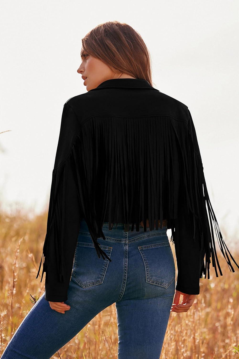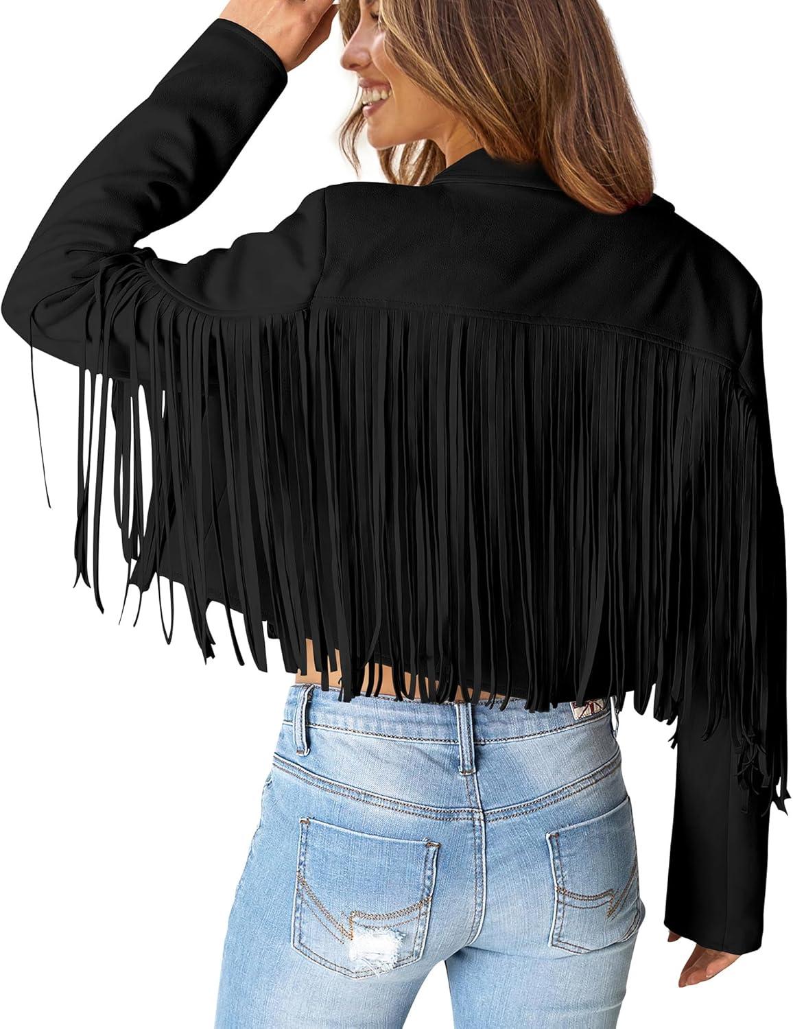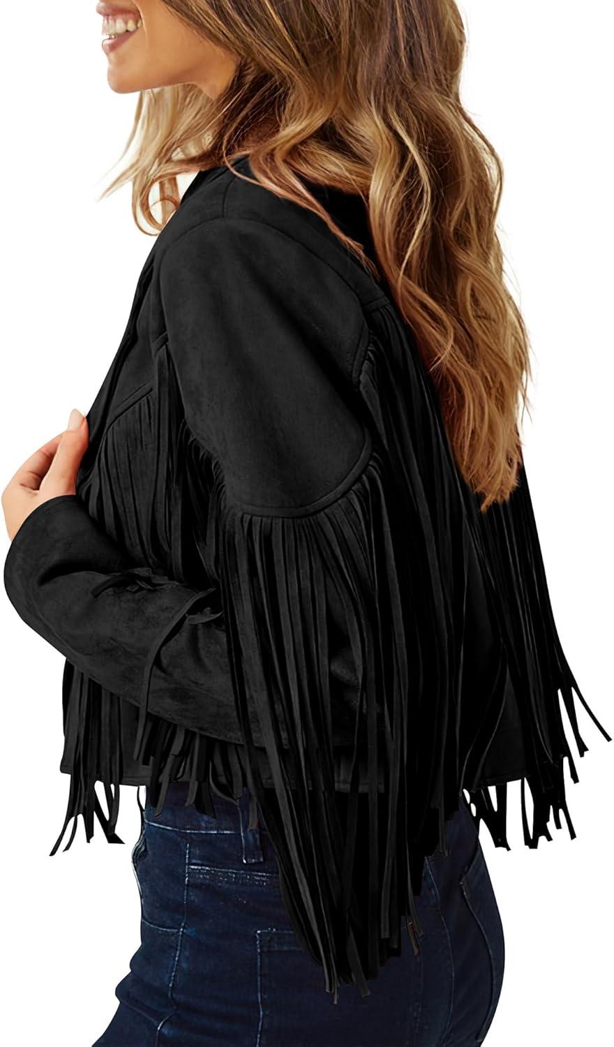 PRETTYGARDEN Women's Fringe Faux Suede Leather Jackets Fall Fashion 2025 Tassel Motorcycle Cropped Coats(Black)