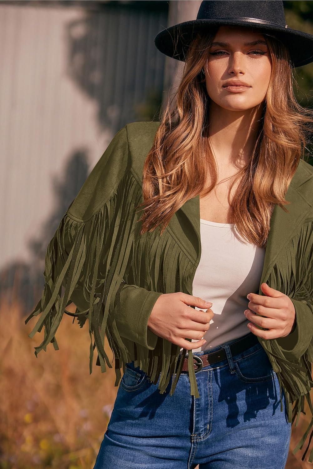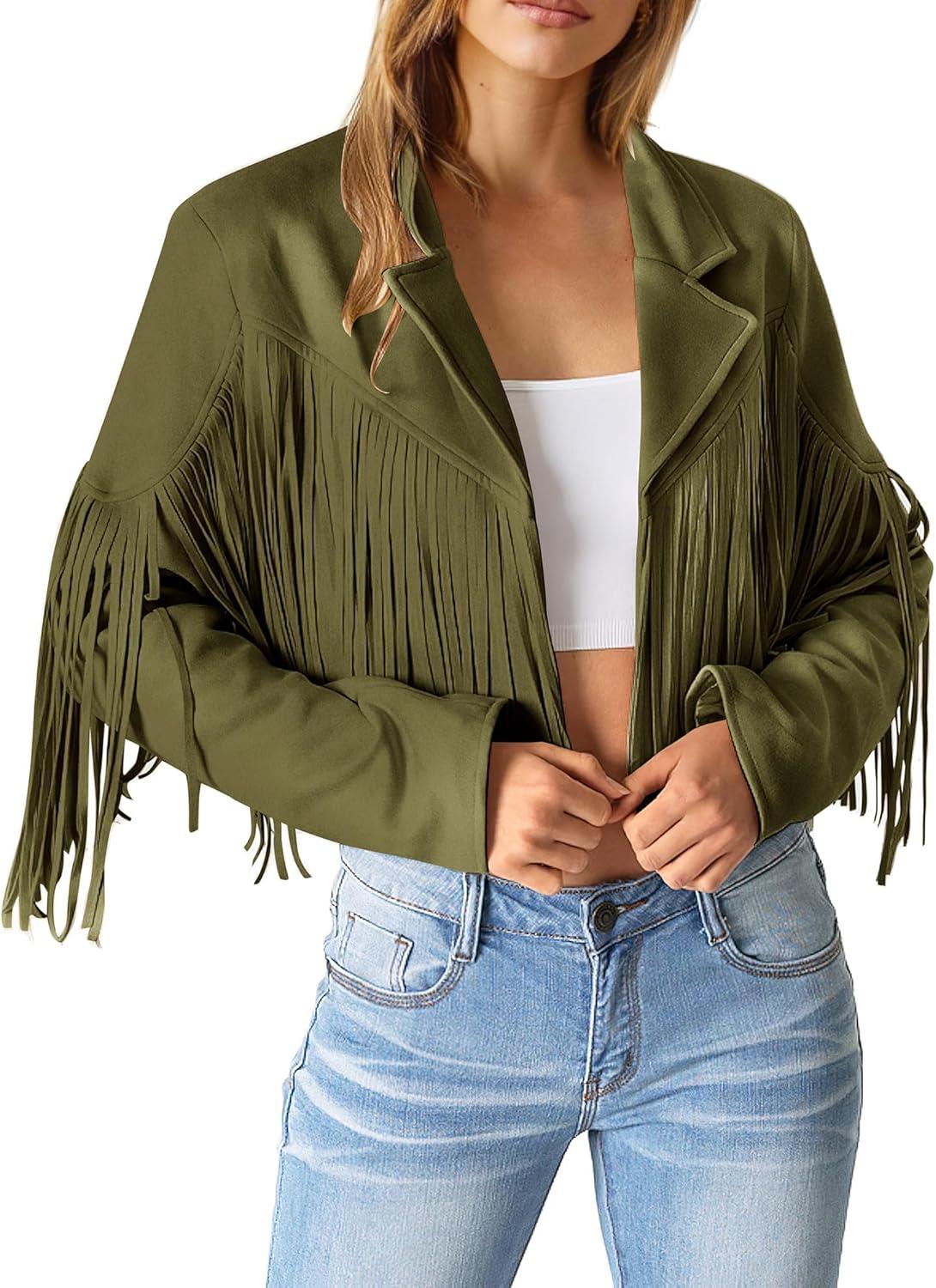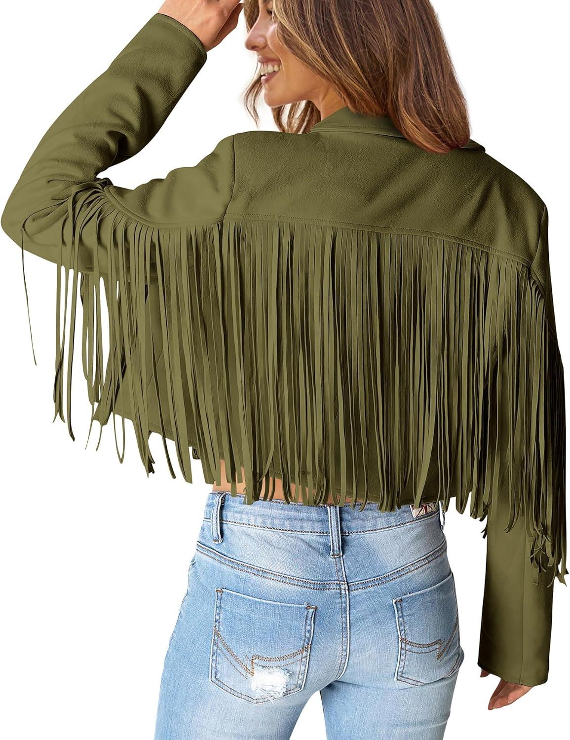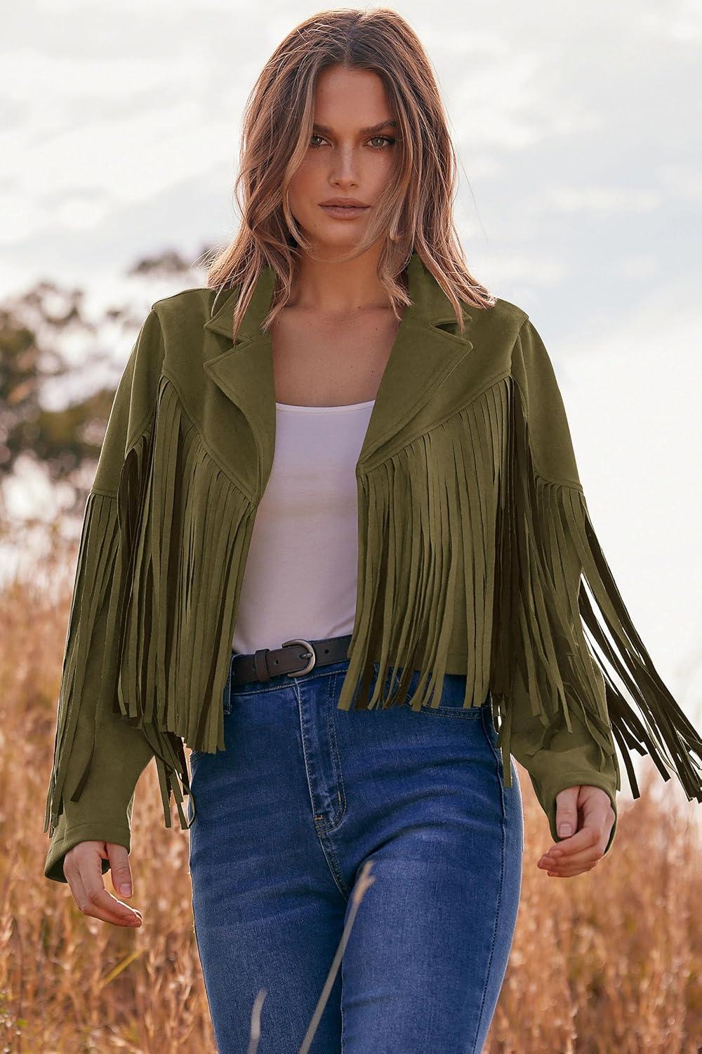 PRETTYGARDEN Women's Fringe Faux Suede Leather Jackets Fall Fashion 2025 Tassel Motorcycle Cropped Coats(Dark Army Green)