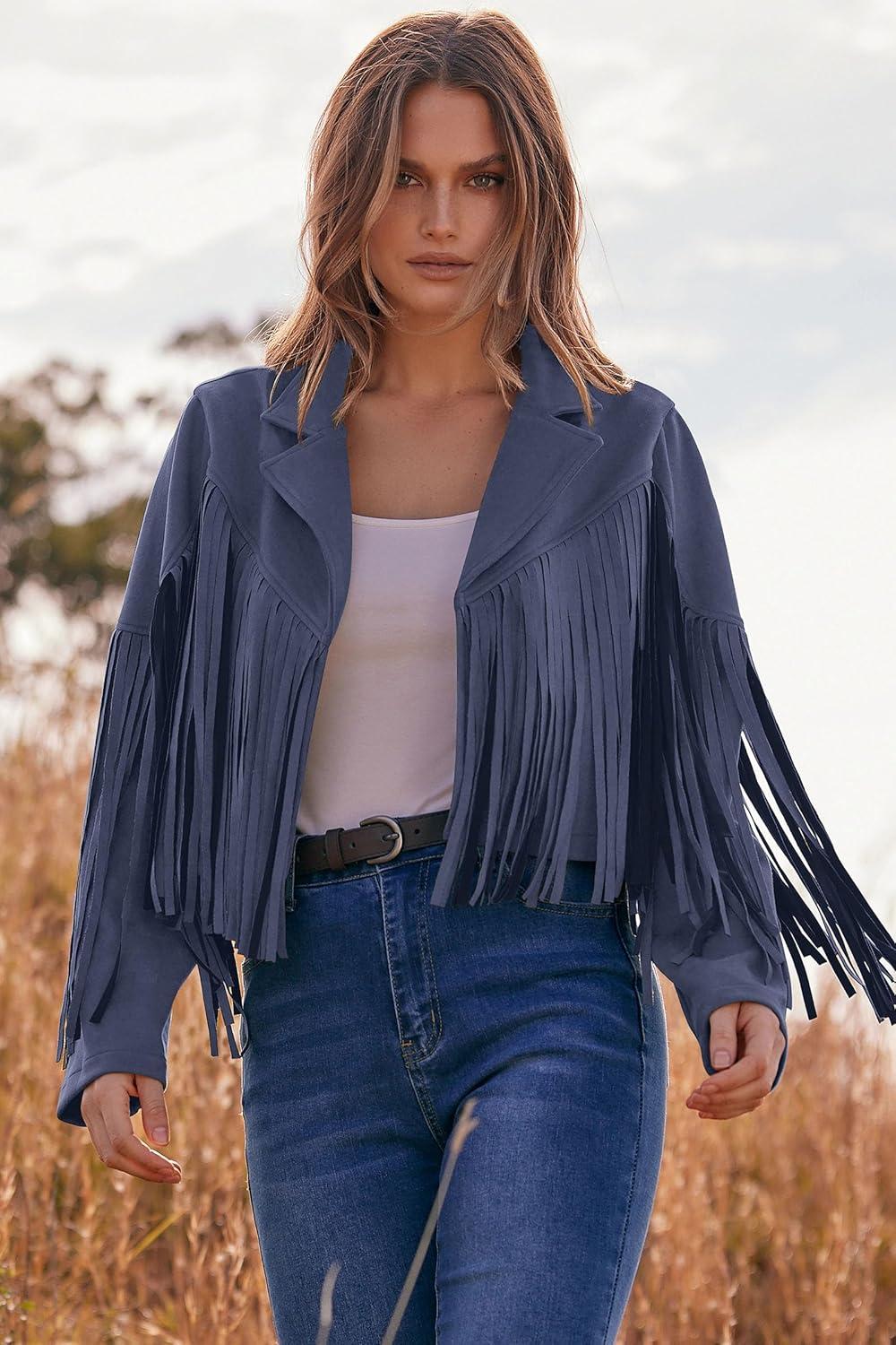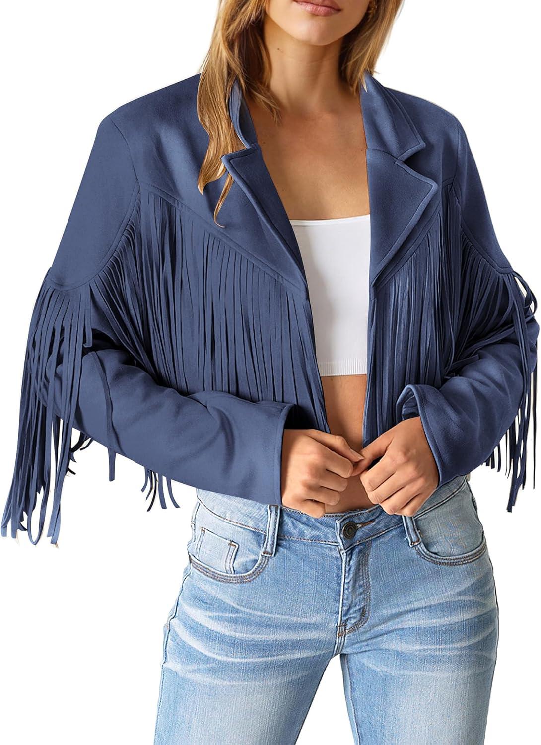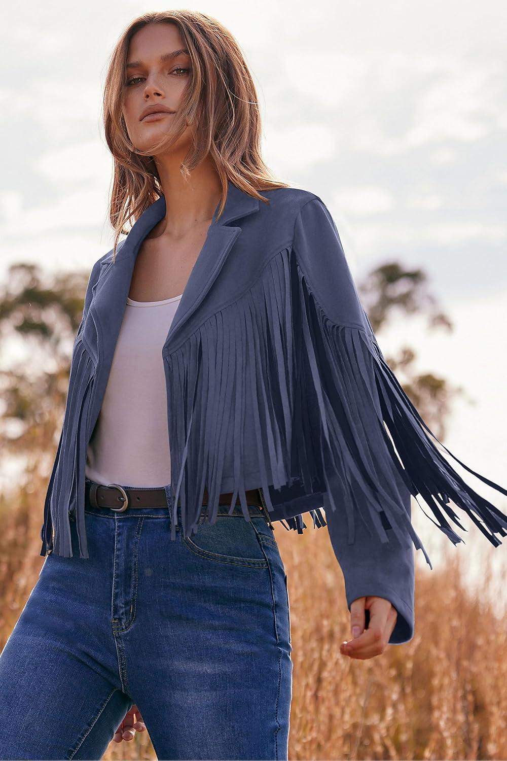 PRETTYGARDEN Women's Fringe Faux Suede Leather Jackets Fall Fashion 2025 Tassel Motorcycle Cropped Coats(Haze Blue)