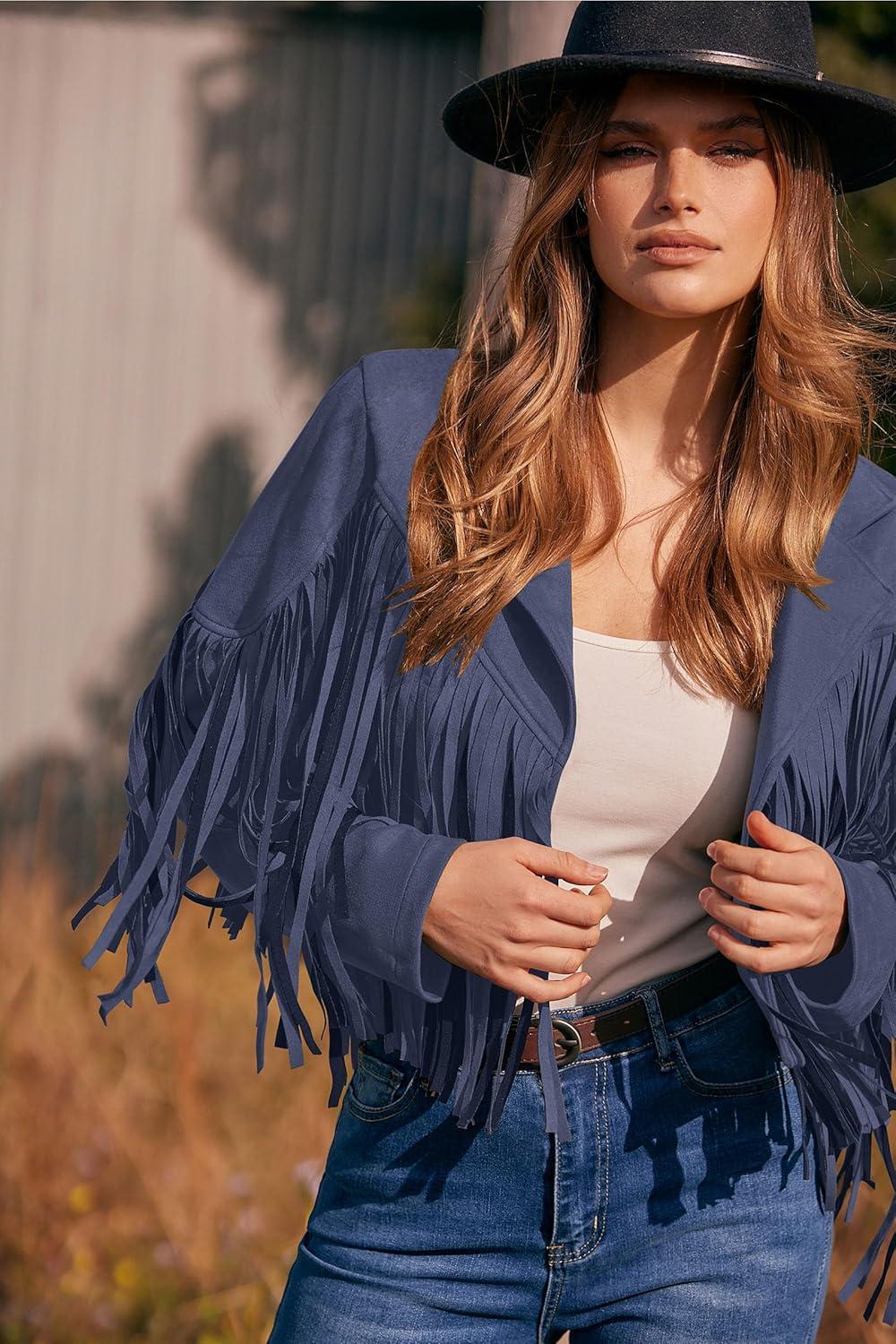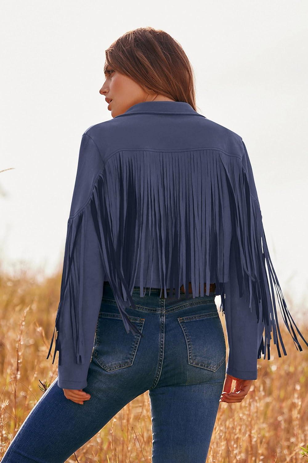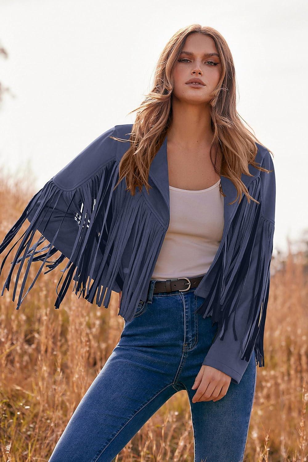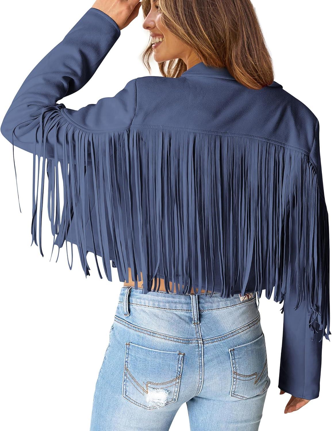PRETTYGARDEN Women's Fringe Faux Suede Leather Jackets Fall Fashion 2025 Tassel Motorcycle Cropped Coats(Haze Blue)