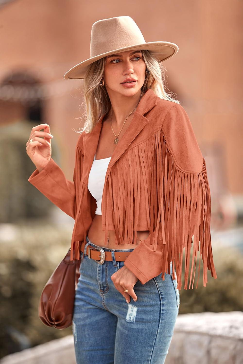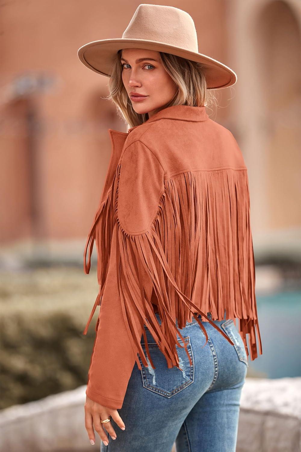 PRETTYGARDEN Women's Fringe Faux Suede Leather Jackets Fall Fashion 2025 Tassel Motorcycle Cropped Coats(Orange)
