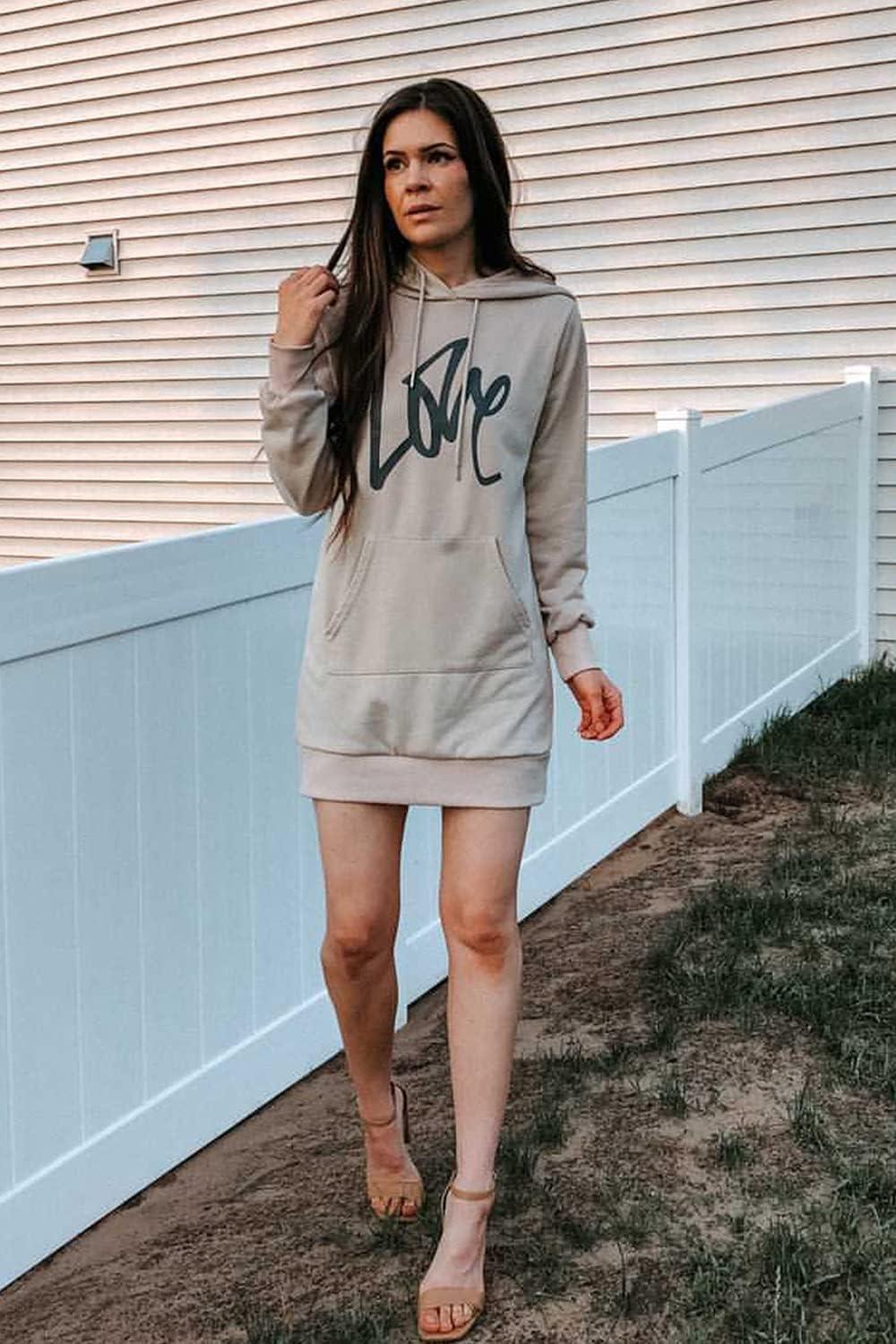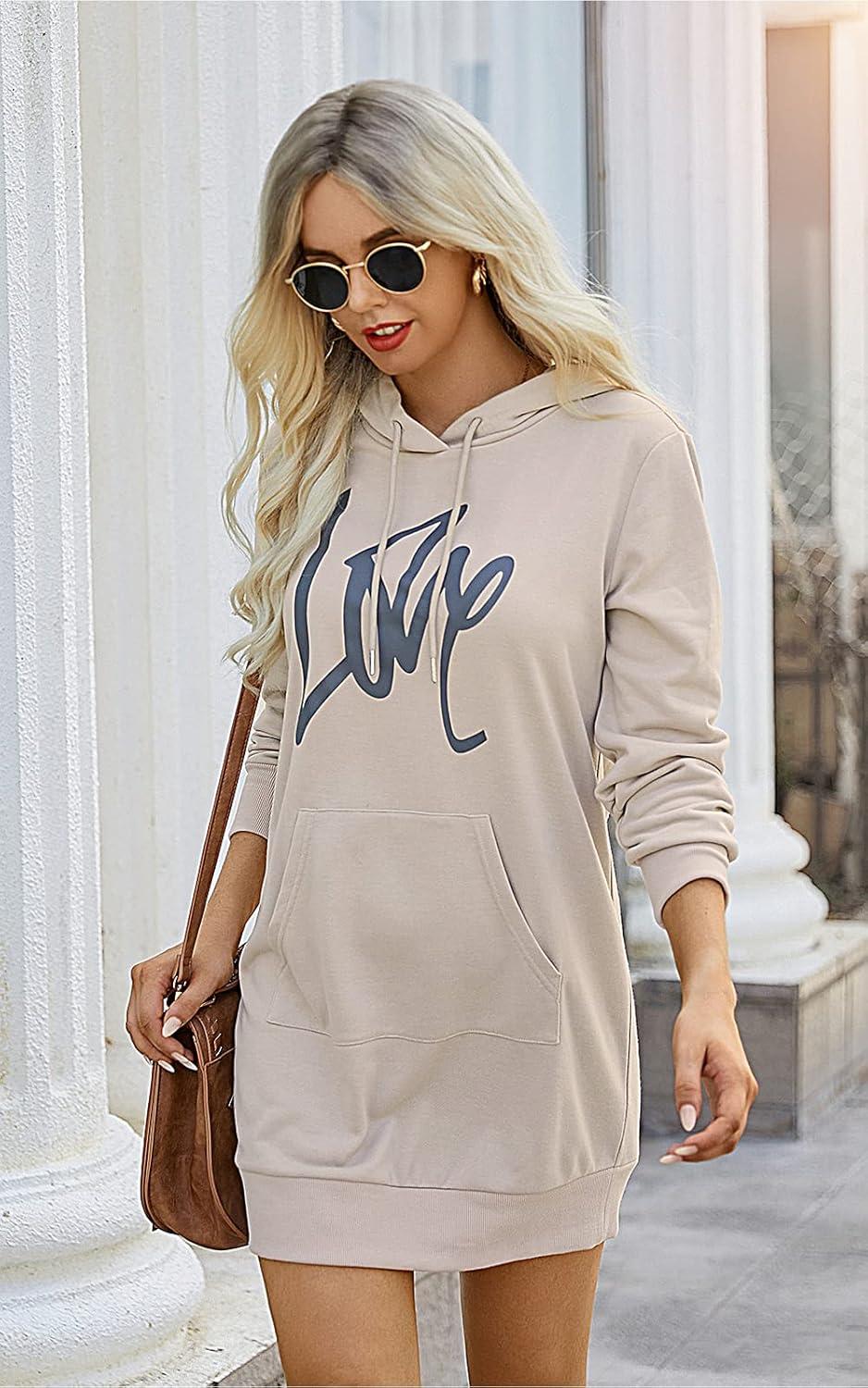 PRETTYGARDEN Women’s Hooded Sweatshirt Fall Fashion Drawstring Lightweight Long Sleeve Pullover Hoodie Dress(Apricot)