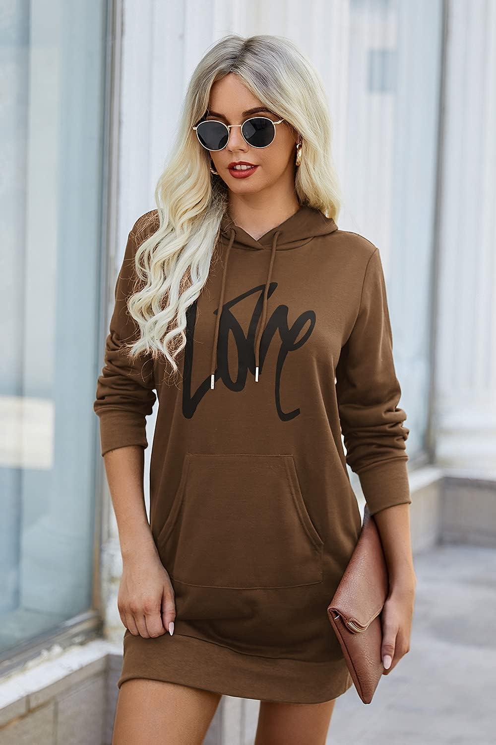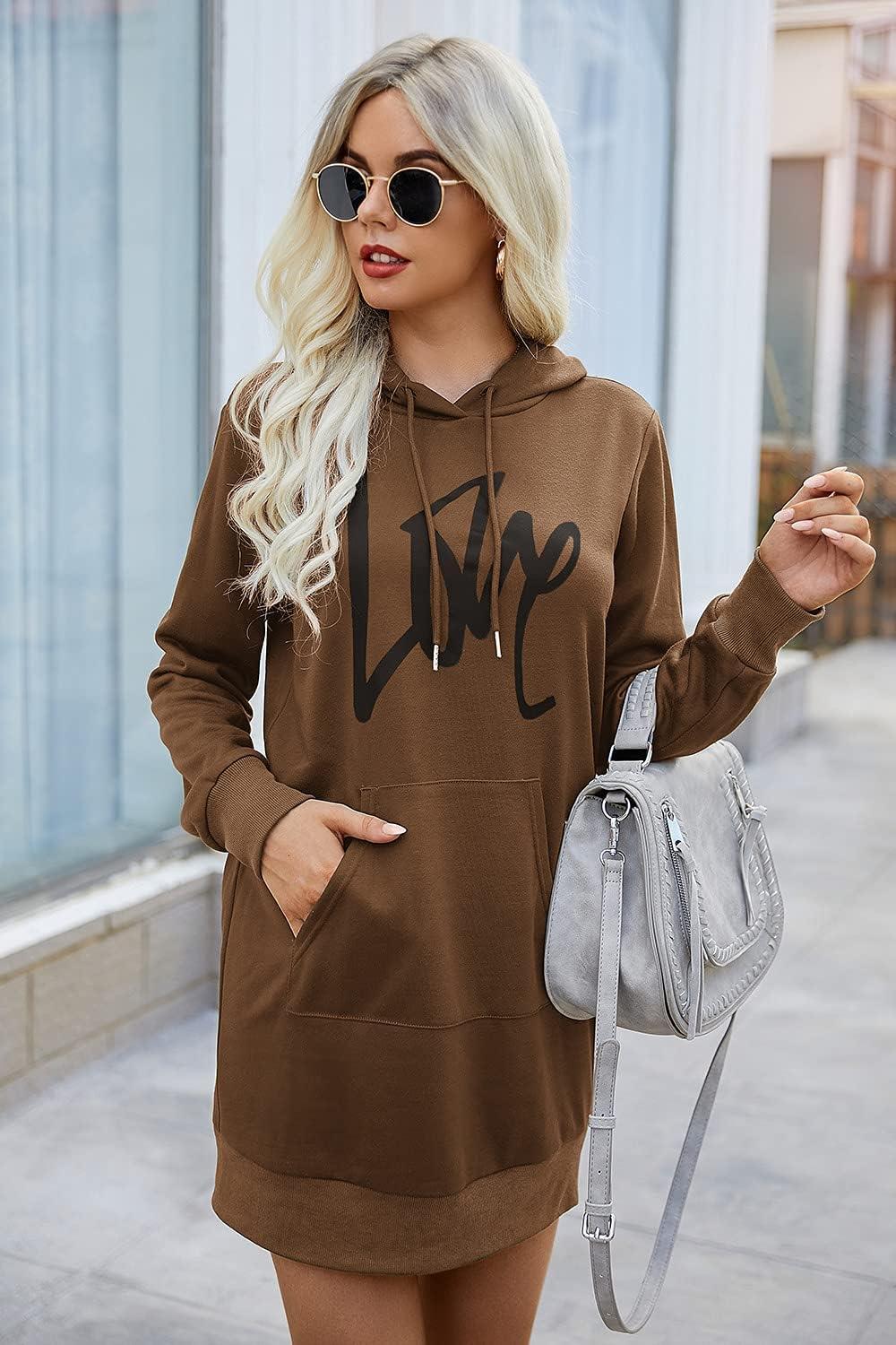 PRETTYGARDEN Women's Hooded Sweatshirt Fall Fashion Drawstring Lightweight Long Sleeve Pullover Hoodie Dress(Brown)