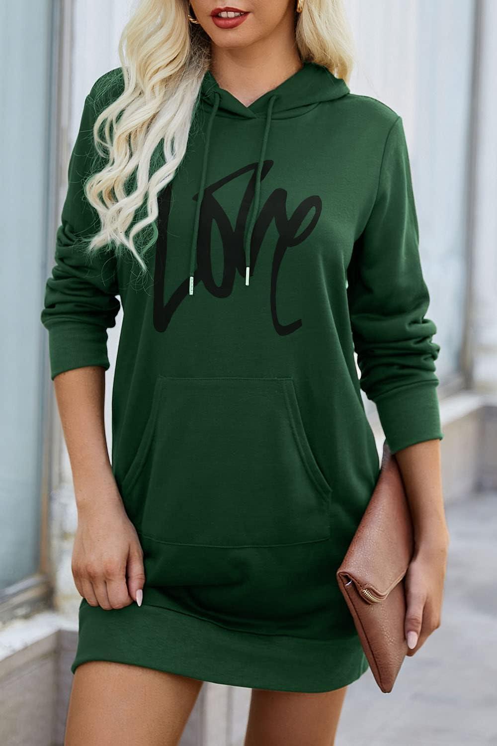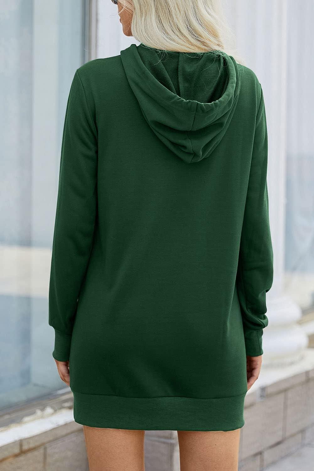PRETTYGARDEN Women's Hooded Sweatshirt Fall Fashion Drawstring Lightweight Long Sleeve Pullover Hoodie Dress(Dark Green)