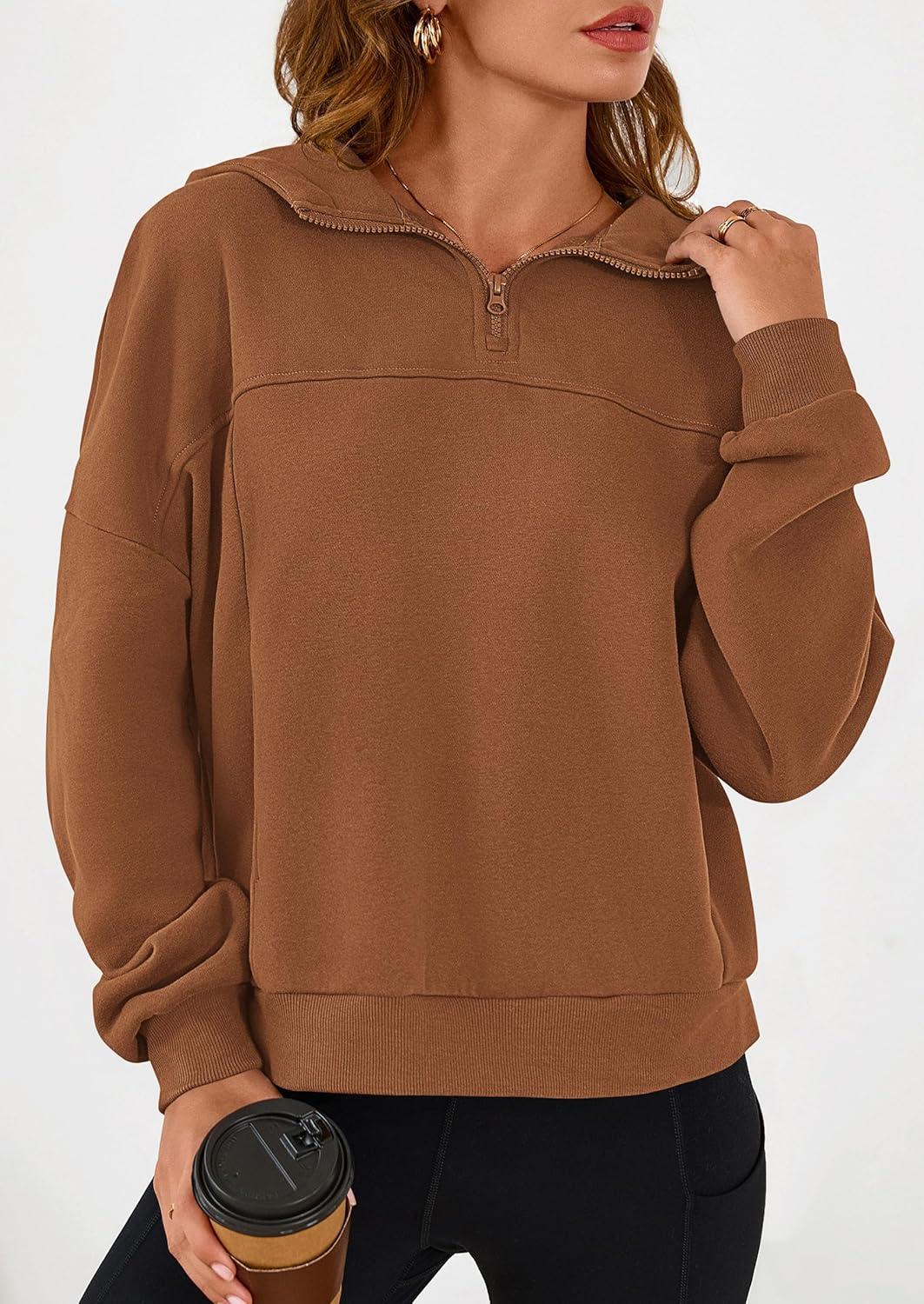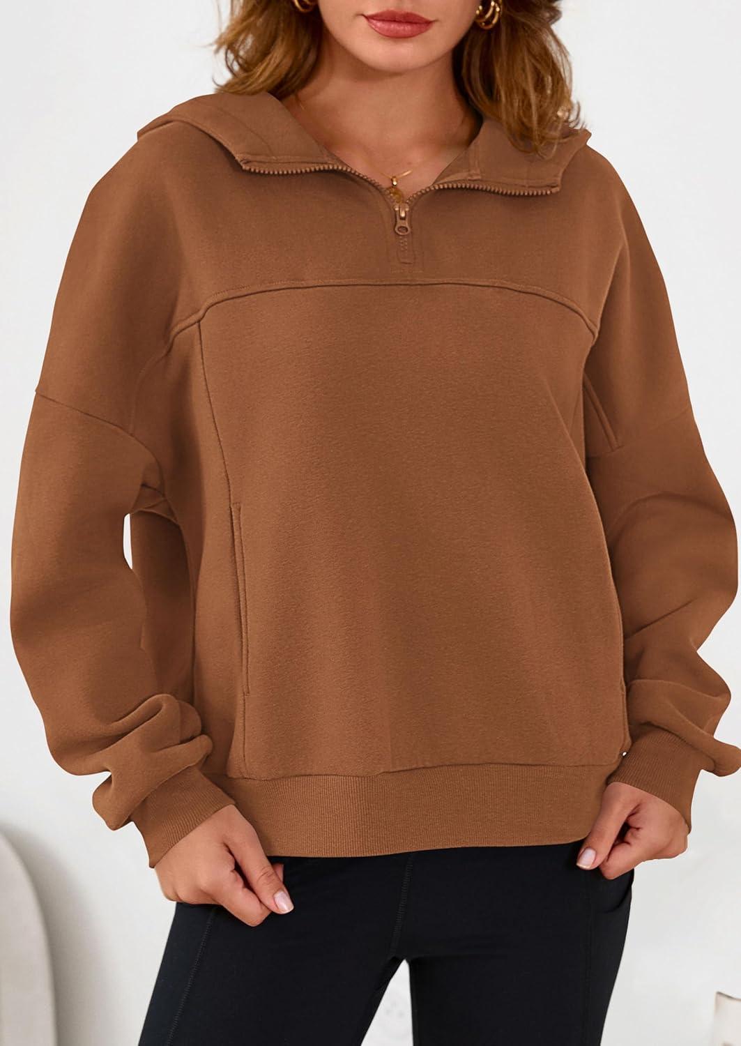 imagePRETTYGARDEN Womens Hoodies Cropped Fleece Sweatshirts 2025 Fall Fashion Quarter Zip Pullover Long Sleeve Tops Winter ClothesBrown
