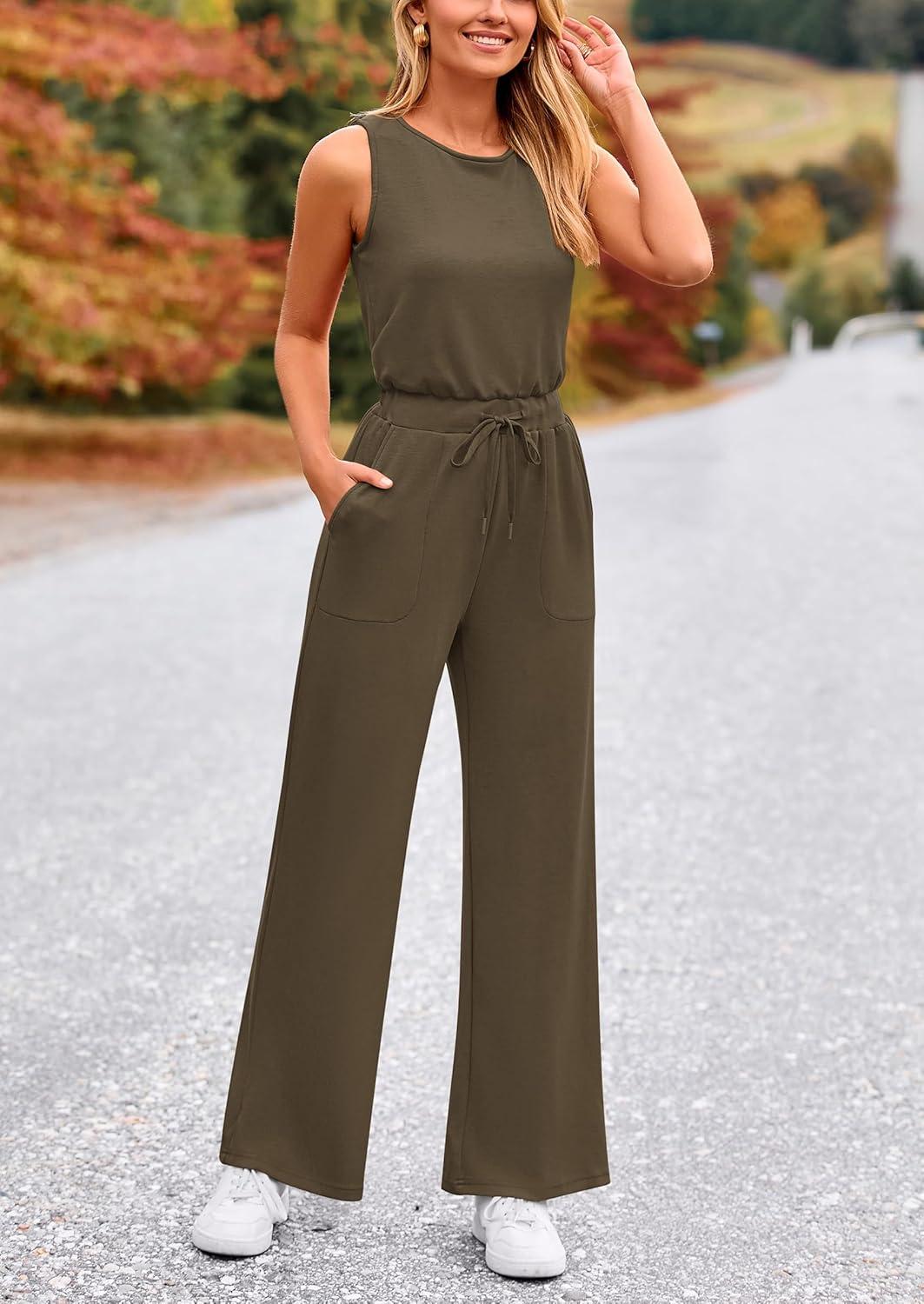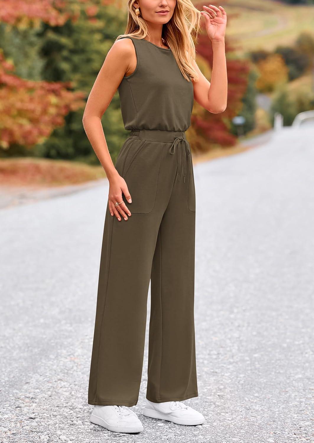 PRETTYGARDEN Womens Jumpsuits Summer Casual One Piece Outfits Sleeveless Wide Leg Long Pants Rompers(Army Green)
