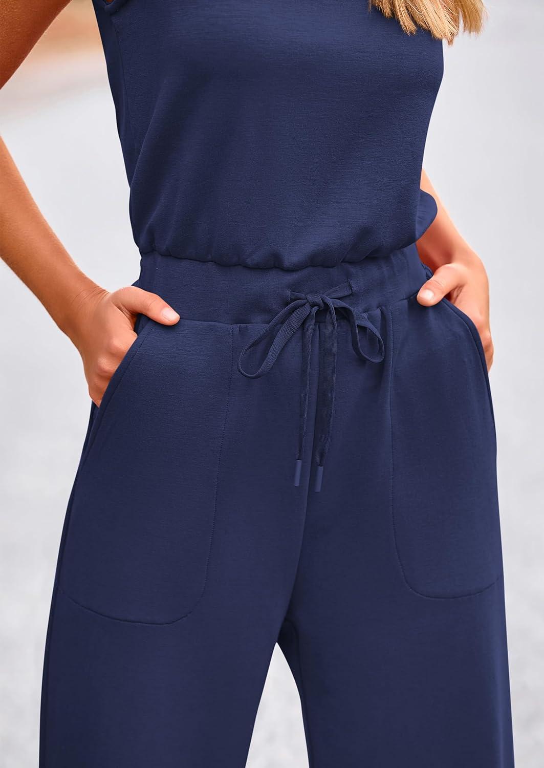 PRETTYGARDEN Womens Jumpsuits Summer Casual One Piece Outfits Sleeveless Wide Leg Long Pants Rompers(Dark Blue)