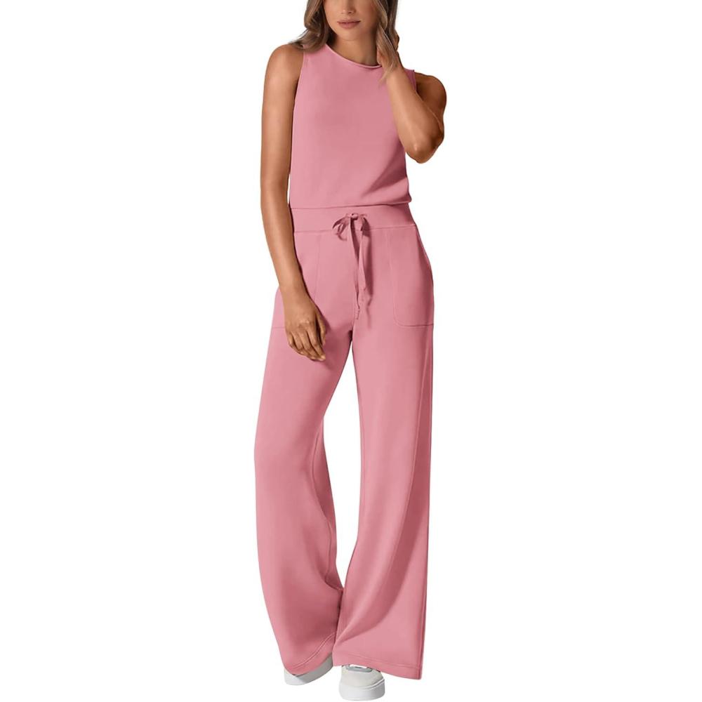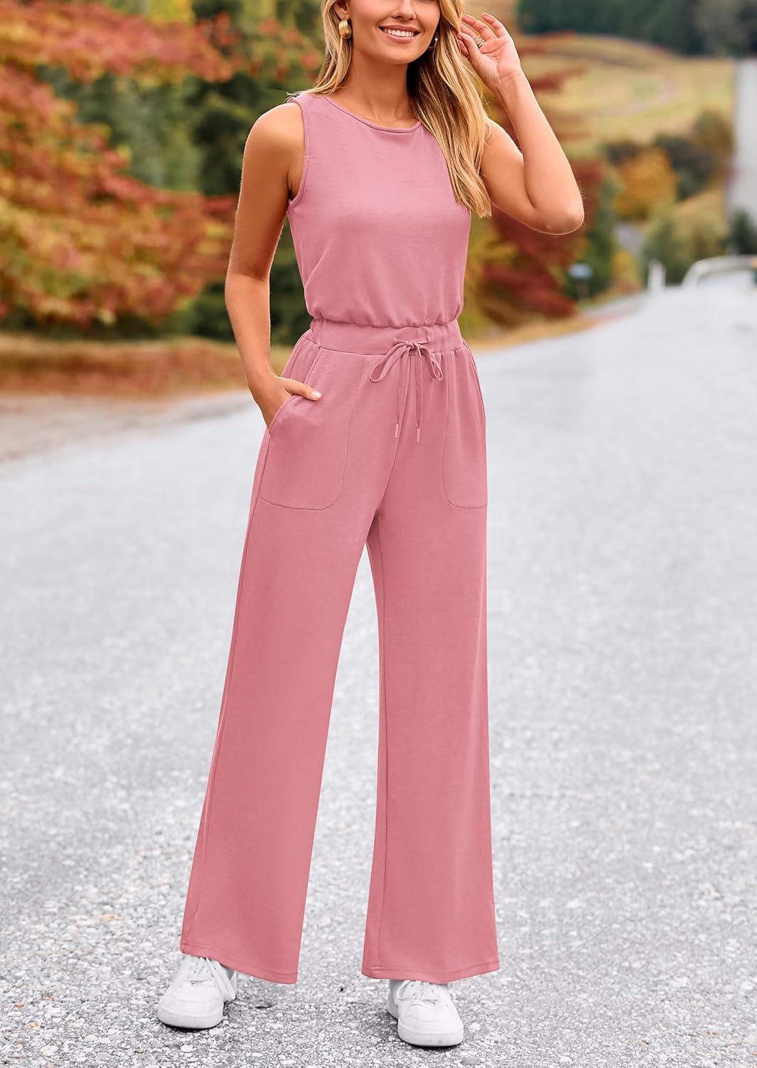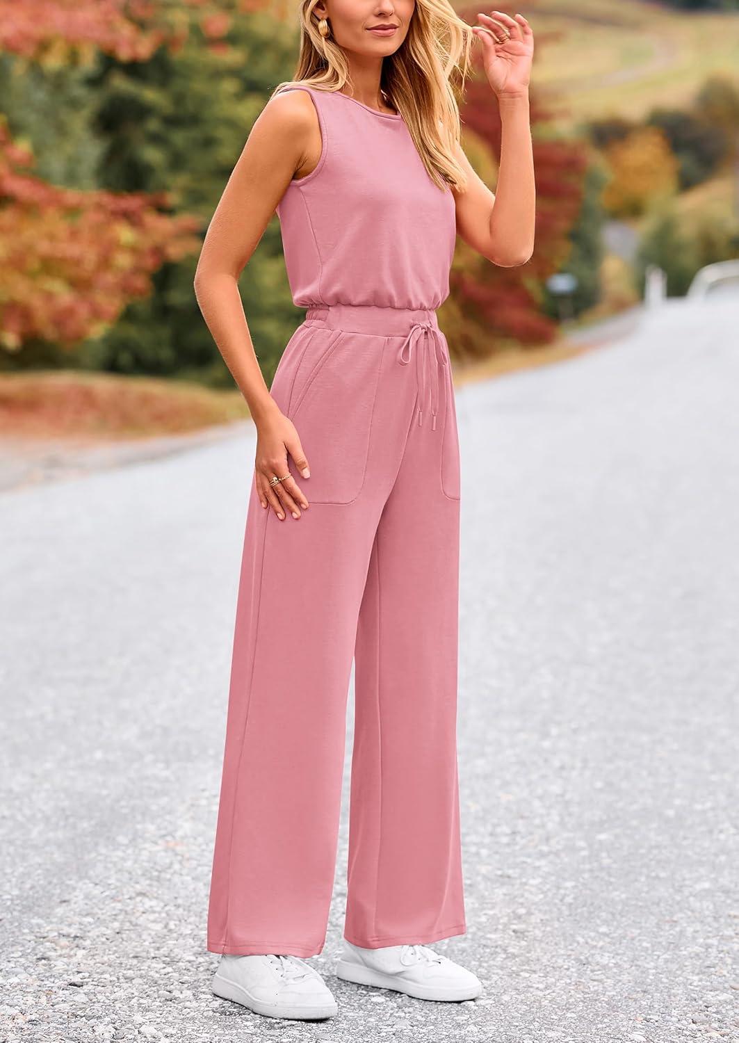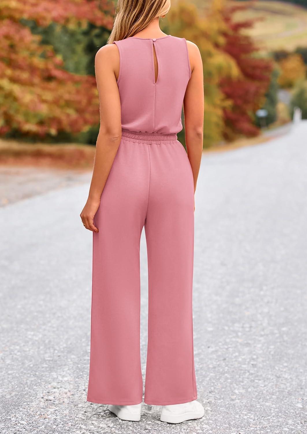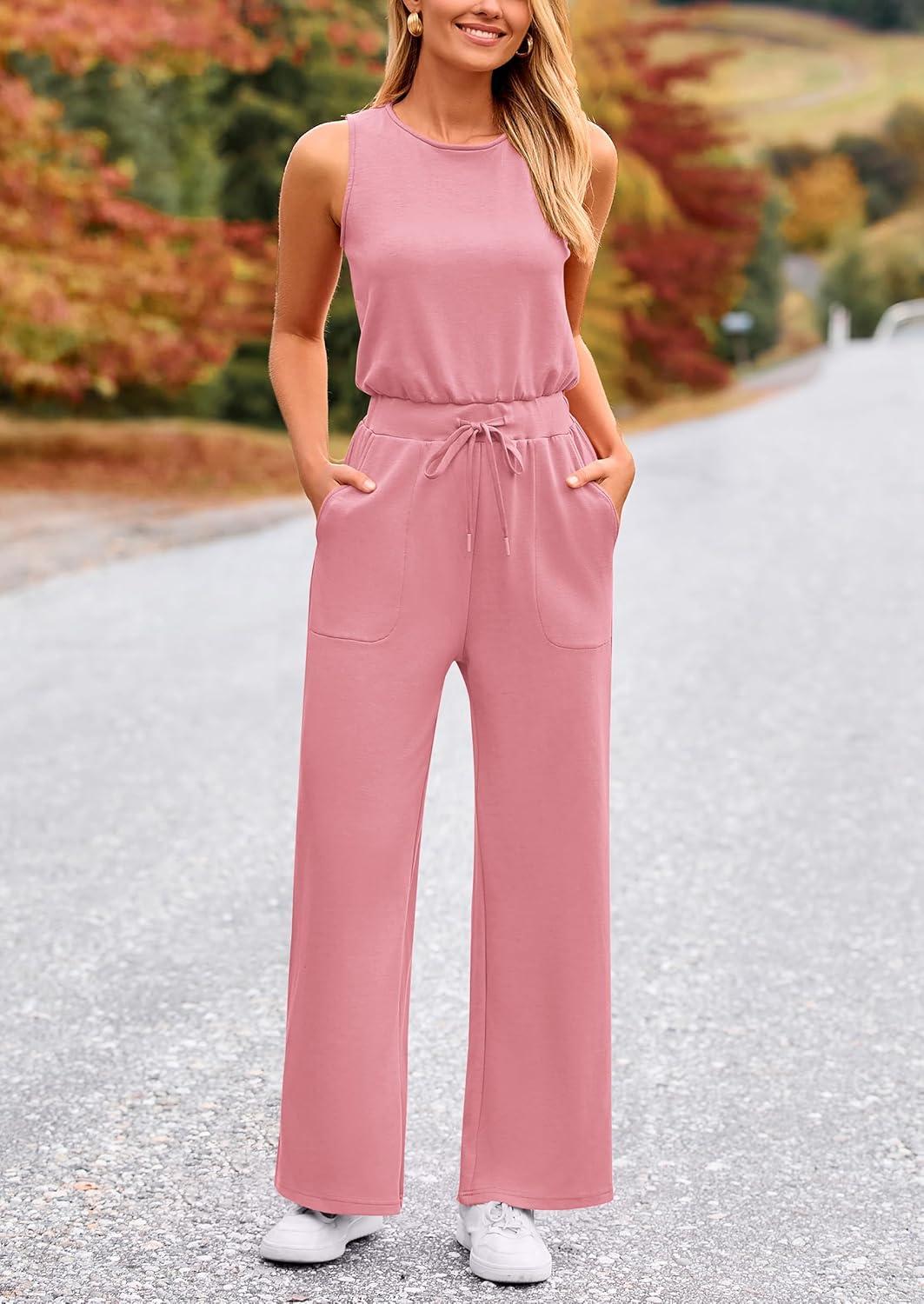 PRETTYGARDEN Womens Jumpsuits Summer Casual One Piece Outfits Sleeveless Wide Leg Long Pants Rompers(Dusty Pink)