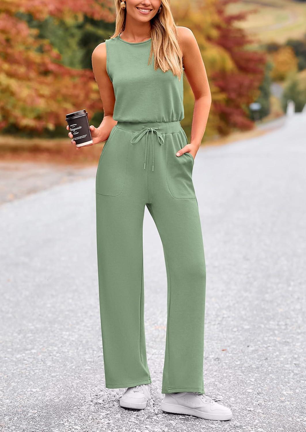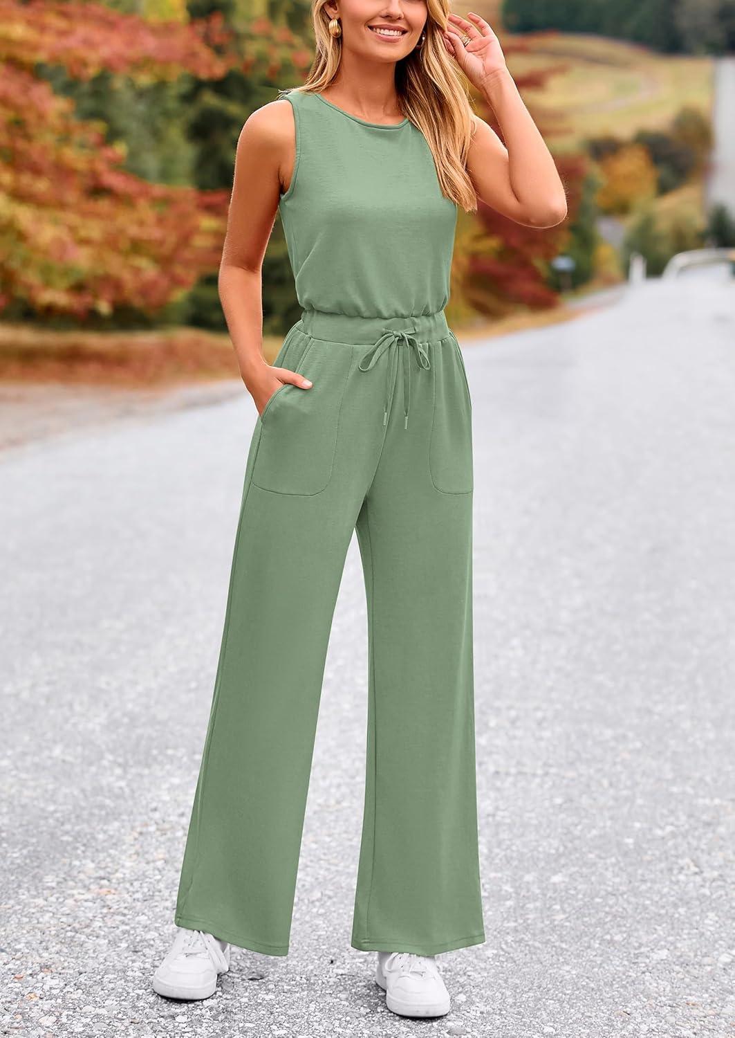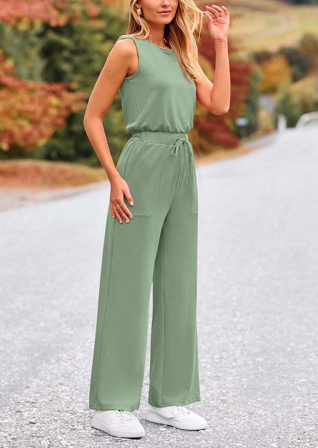 PRETTYGARDEN Womens Jumpsuits Summer Casual One Piece Outfits Sleeveless Wide Leg Long Pants Rompers(Grey Green)