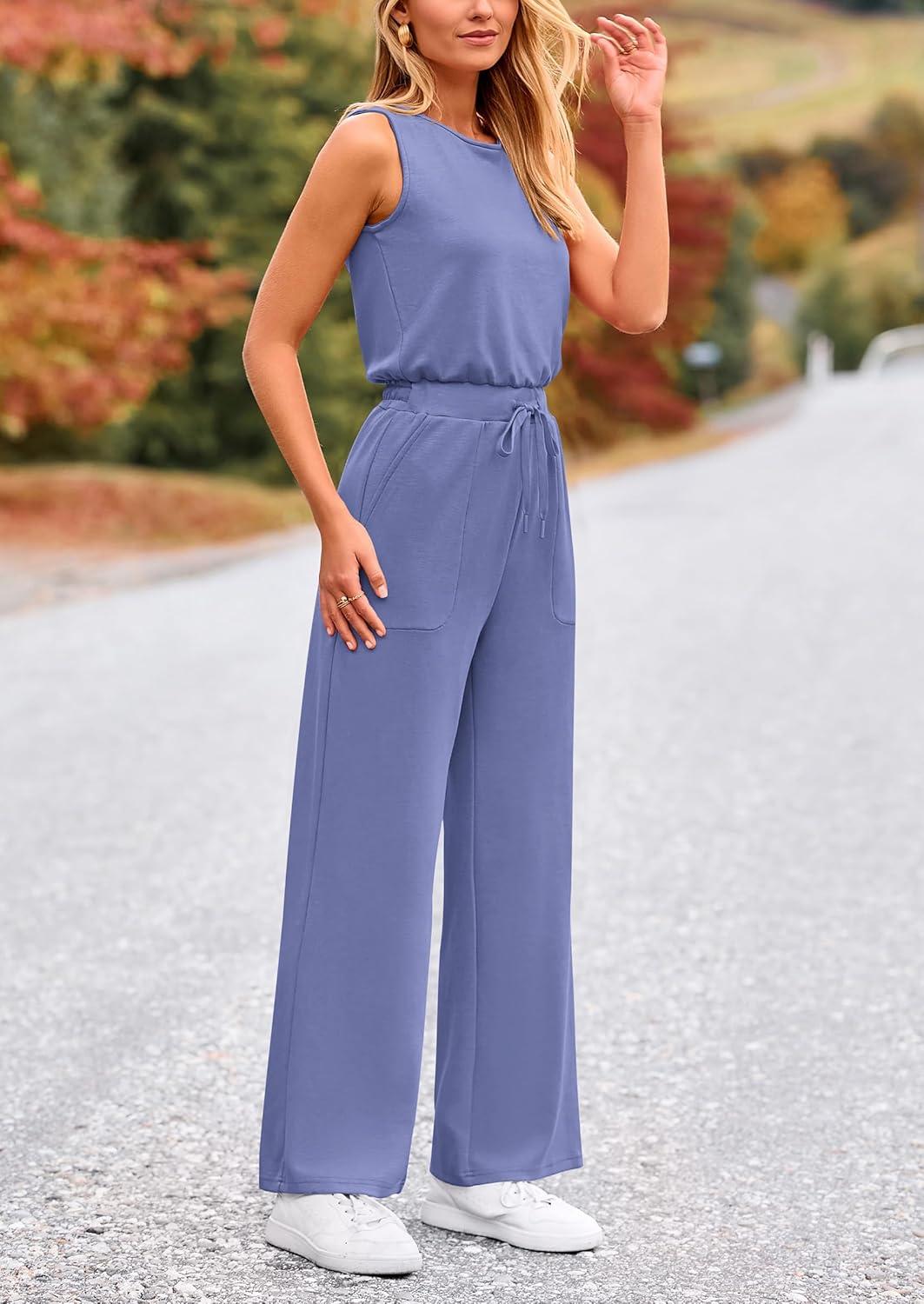 PRETTYGARDEN Womens Jumpsuits Summer Casual One Piece Outfits Sleeveless Wide Leg Long Pants Rompers(Haze Blue)