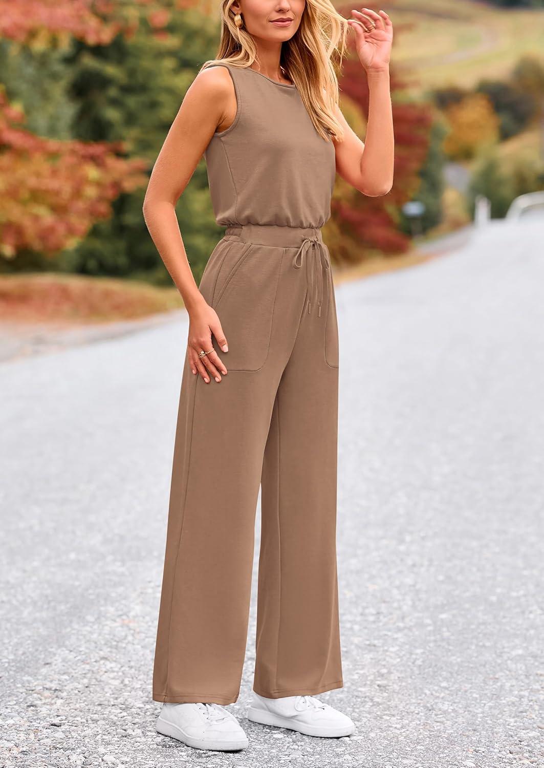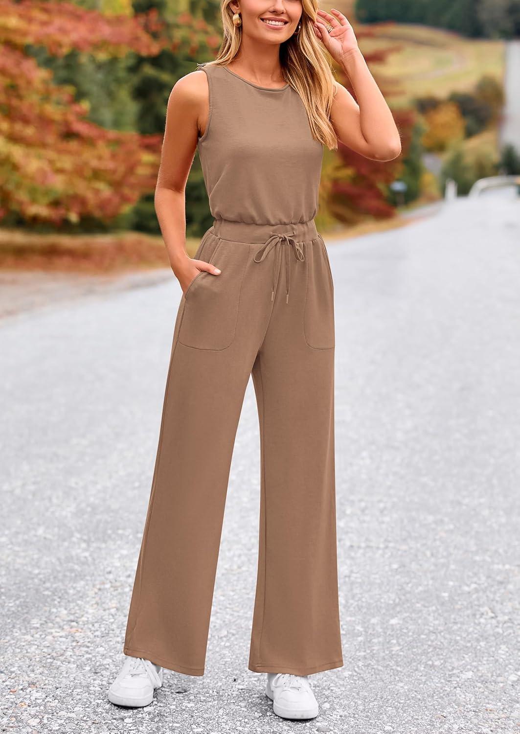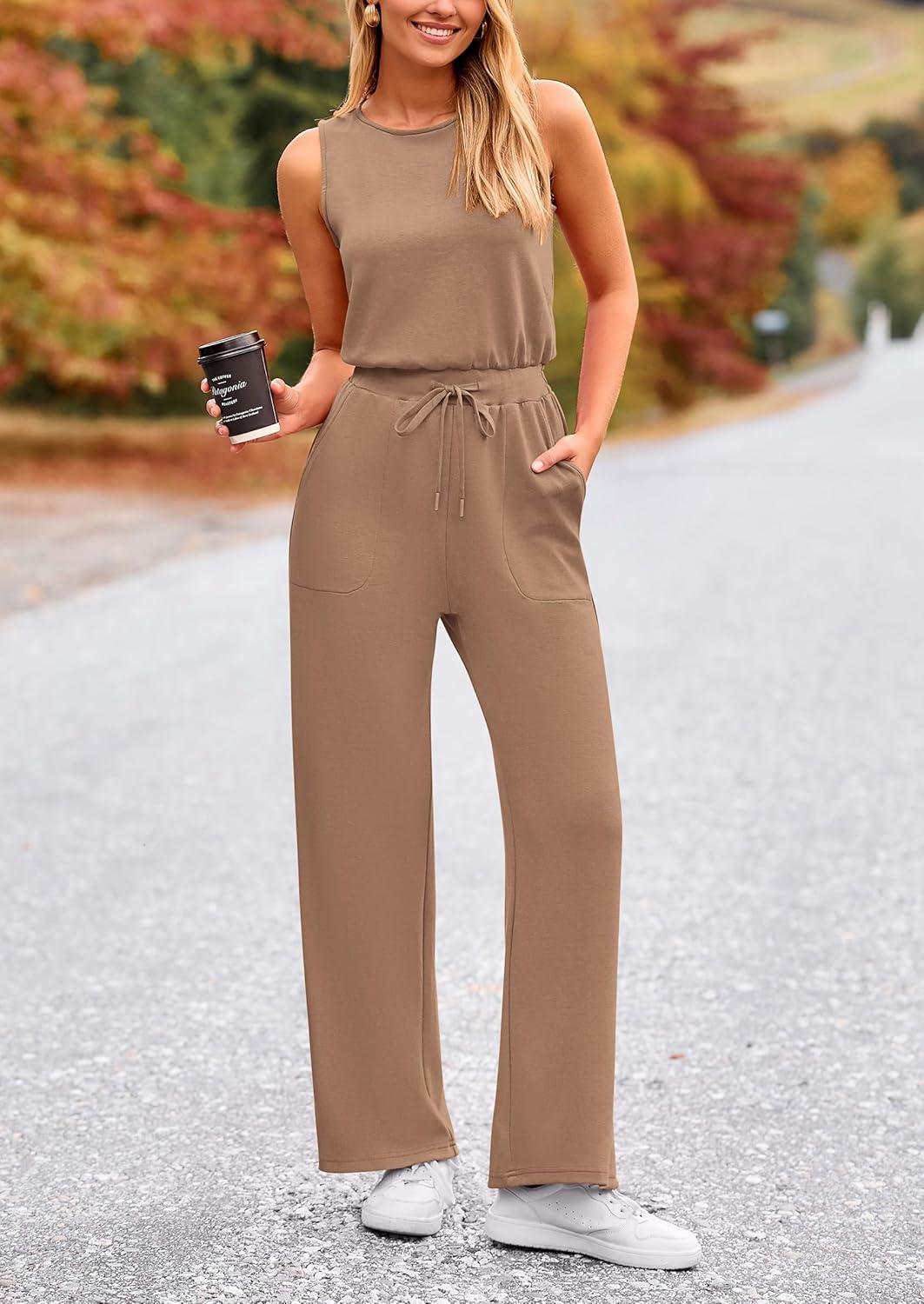 PRETTYGARDEN Womens Jumpsuits Summer Casual One Piece Outfits Sleeveless Wide Leg Long Pants Rompers(Khaki)