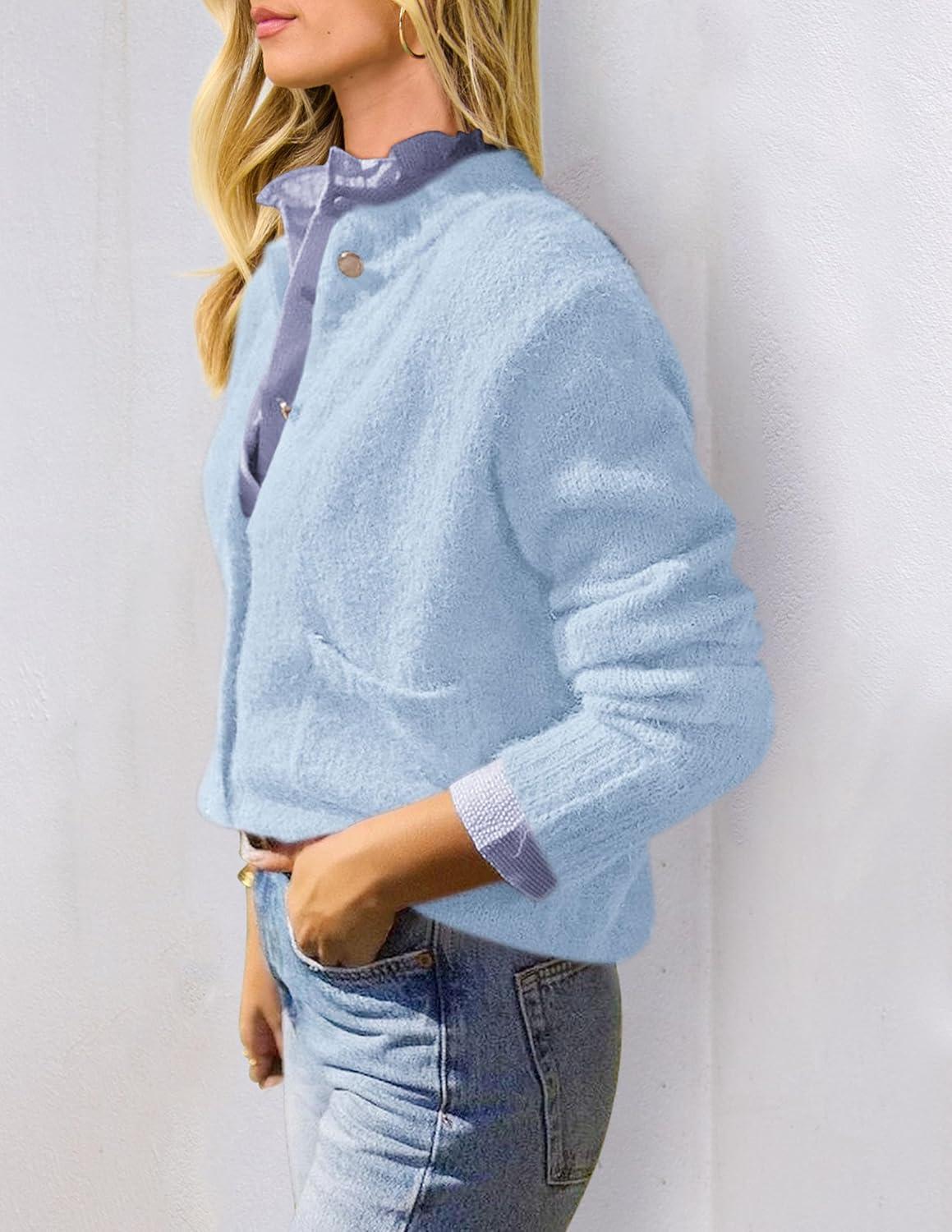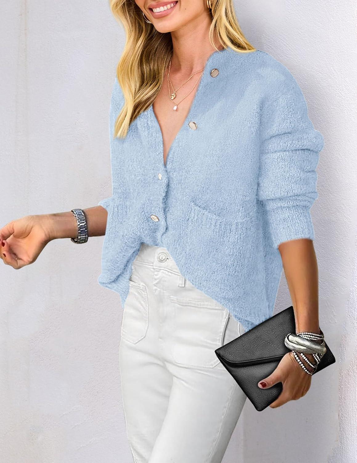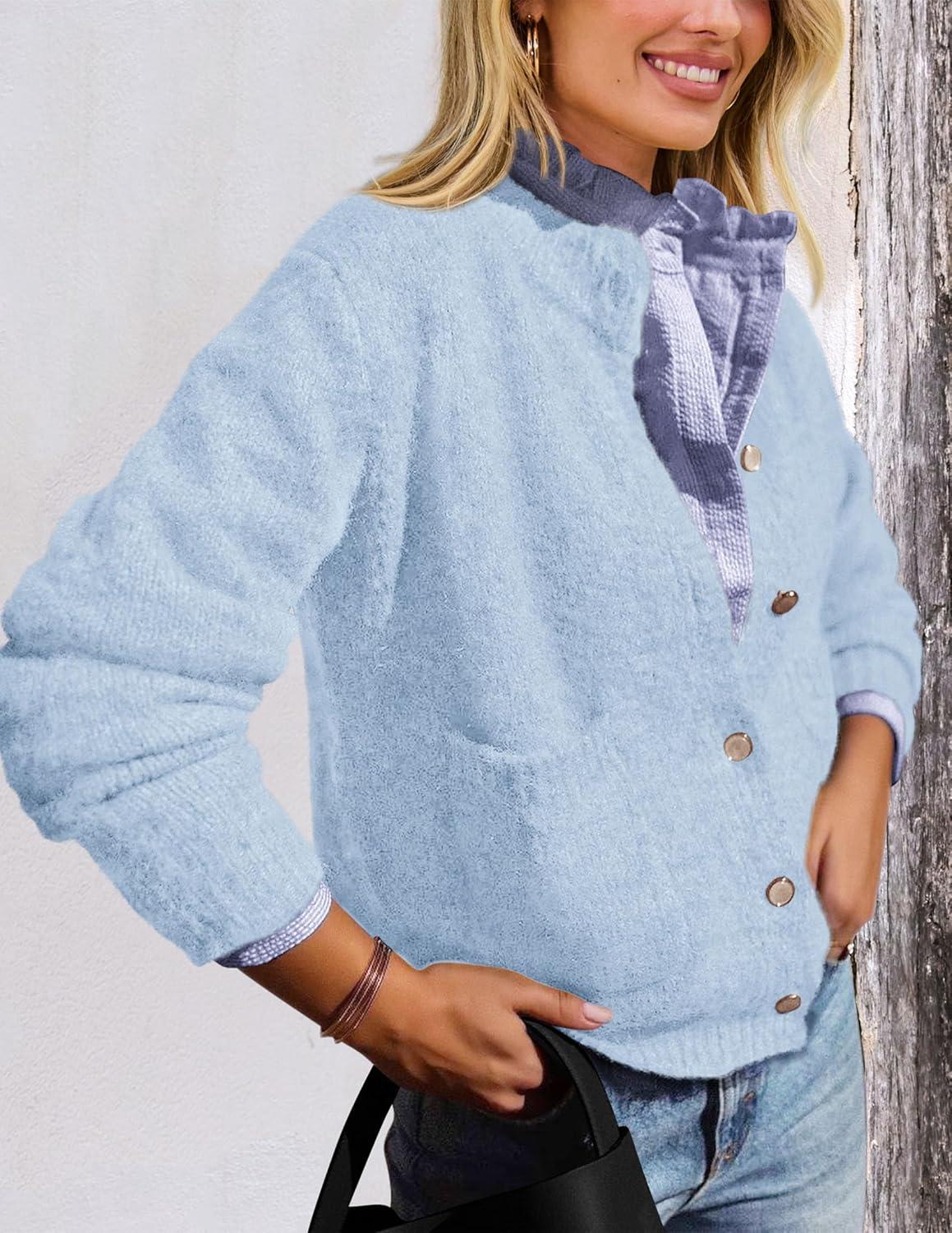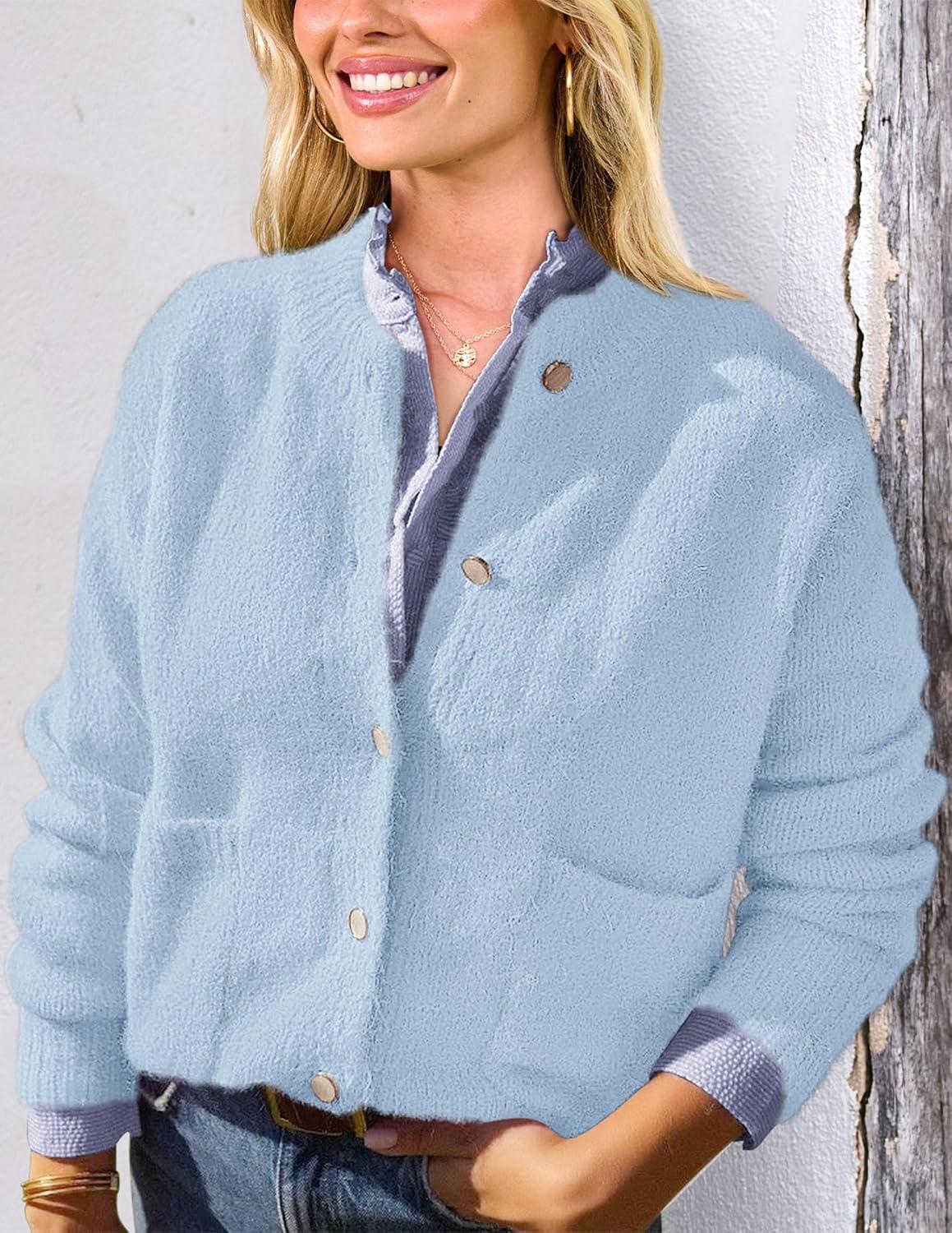 PRETTYGARDEN Women’s Knit Cardigan Sweaters Casual Long Sleeve Open Front Button Up Ribbed Fall Spring Sweater Jackets(Light Blue)