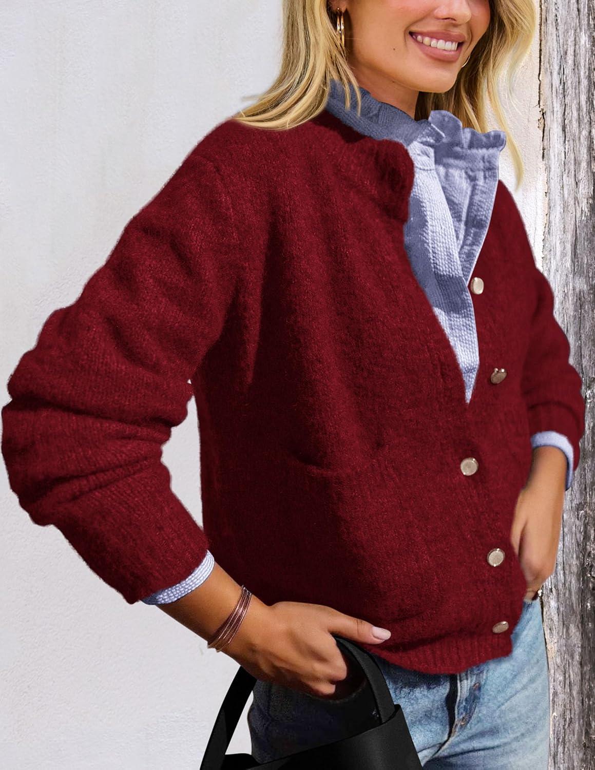PRETTYGARDEN Women’s Knit Cardigan Sweaters Casual Long Sleeve Open Front Button Up Ribbed Fall Spring Sweater Jackets(Wine Red)