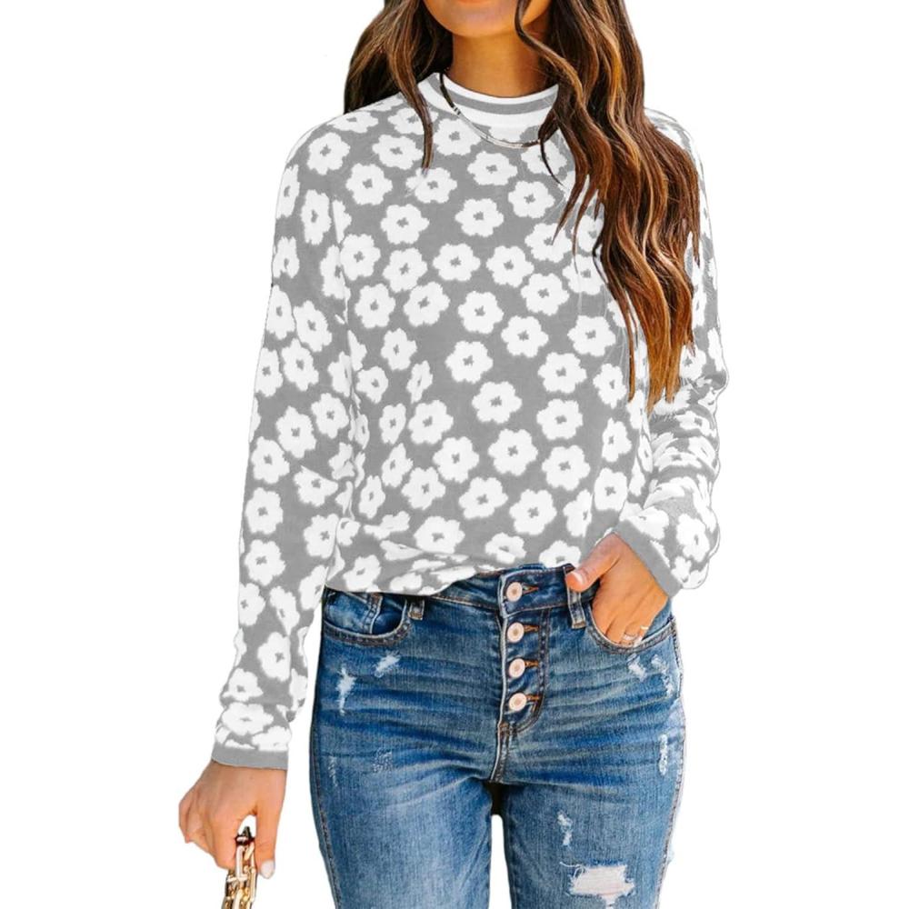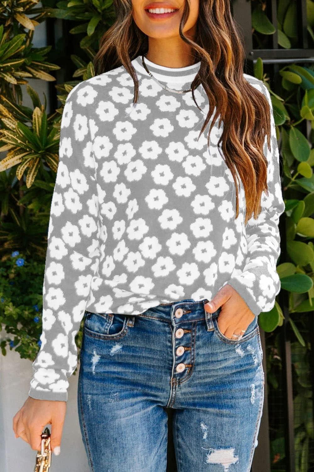 PRETTYGARDEN Women’s Knit Floral Print Sweater Crewneck Long Sleeve Lightweight Pullover Sweatshirt(Grey)