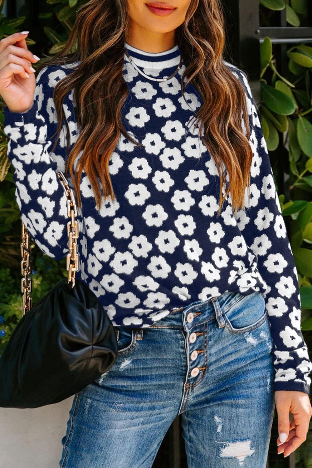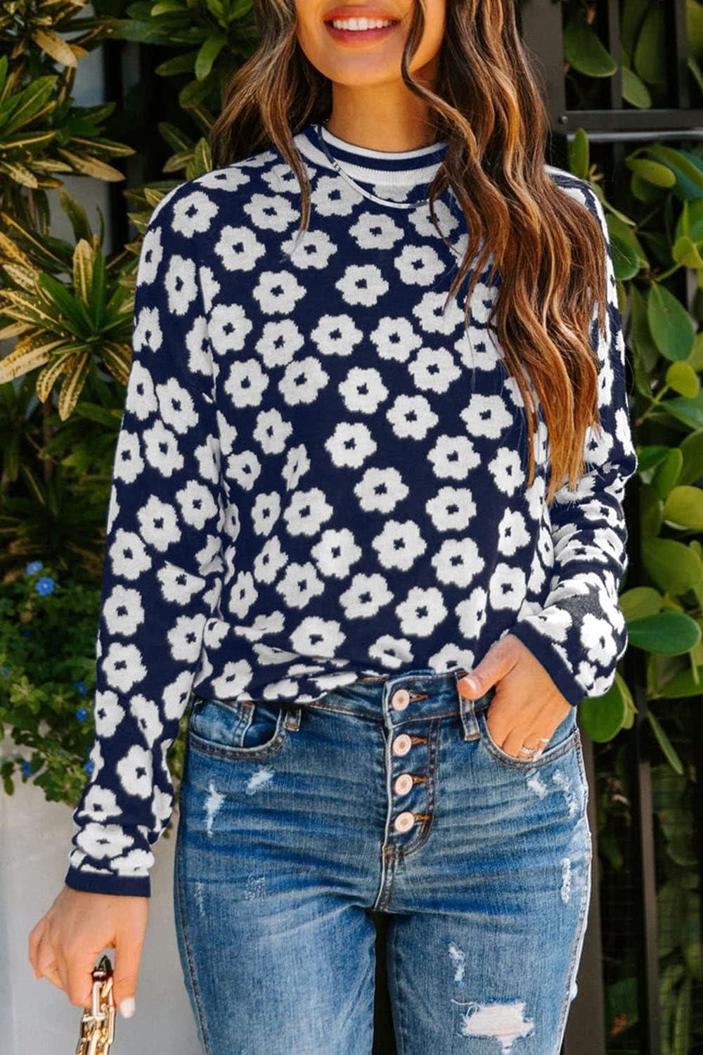 PRETTYGARDEN Women's Knit Floral Print Sweater Crewneck Long Sleeve Lightweight Pullover Sweatshirt(Navy)