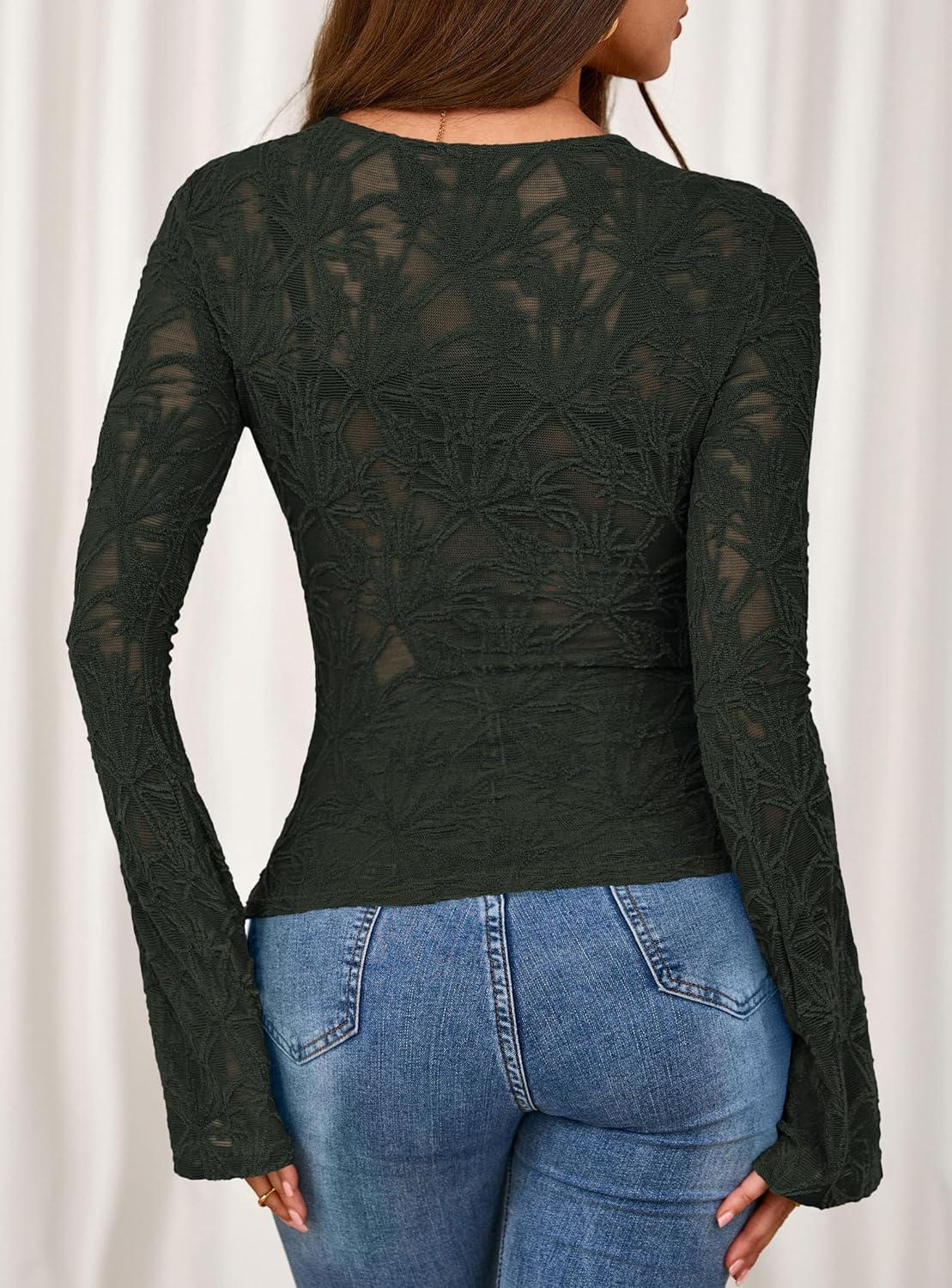 PRETTYGARDEN Womens Lace Long Bell Sleeve Tops 2025 Fall Sexy See Through Sheer Floral Blouse Shirt Fitted Going Out Outfits(Dark Green)