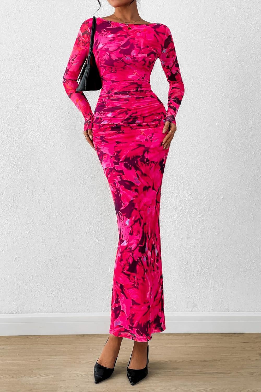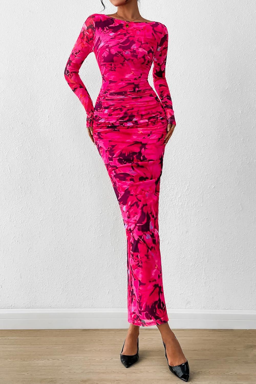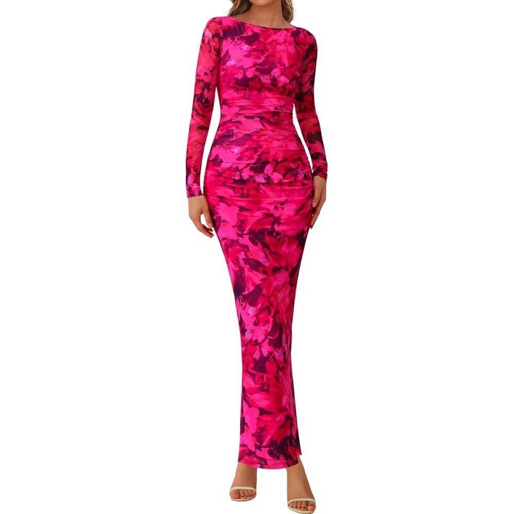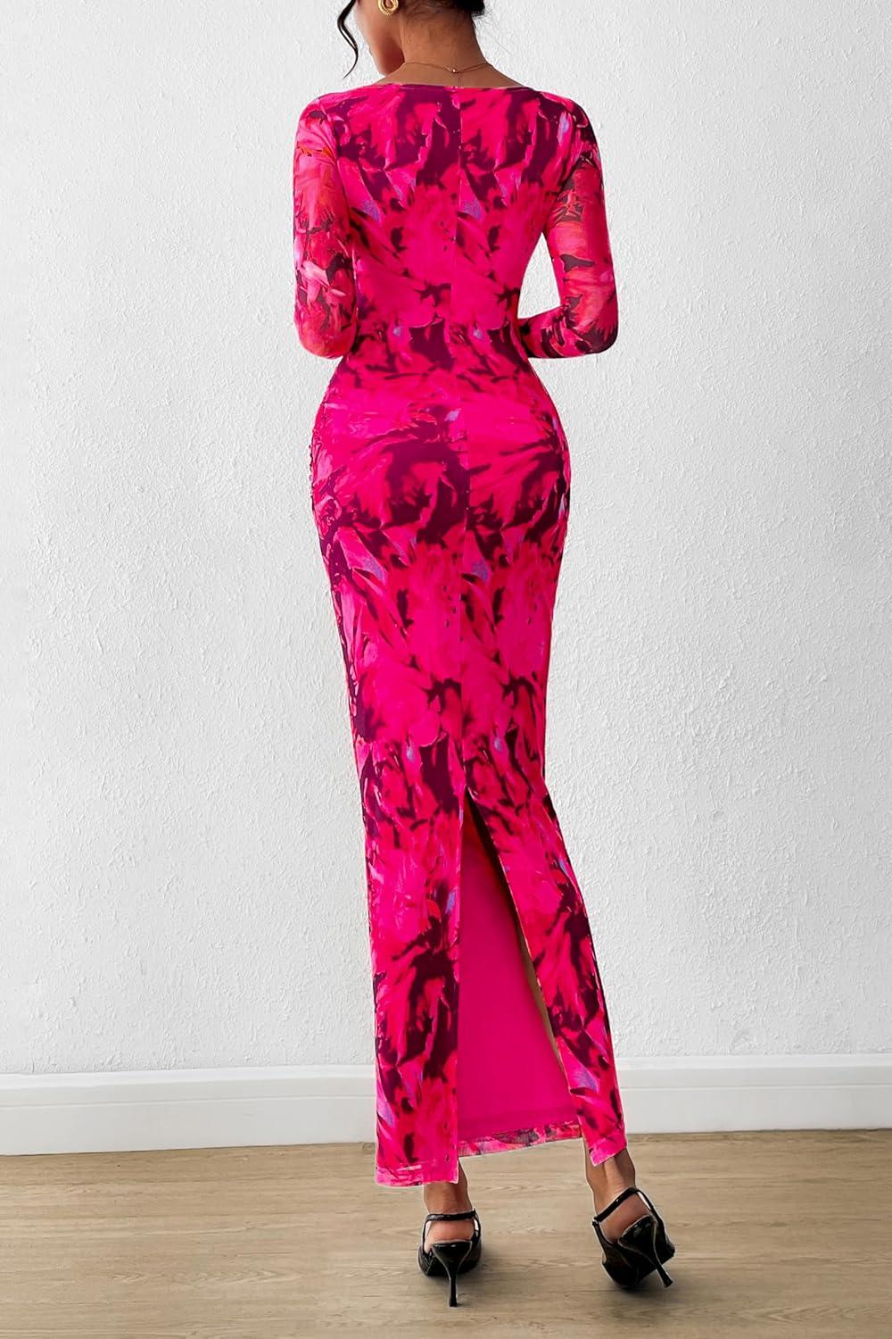 PRETTYGARDEN Women’s Long Sleeve Bodycon Dresses 2025 Fall Sexy Floral Mesh Slit Ruched Tight Maxi Wedding Guest Dress(Blue Pink Flower)