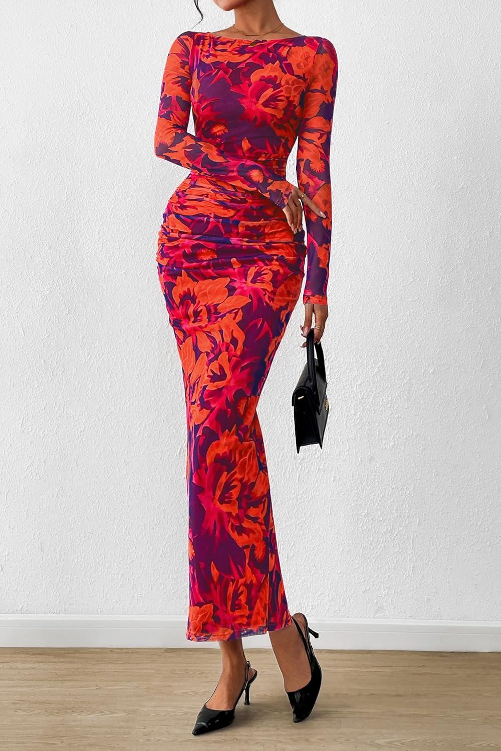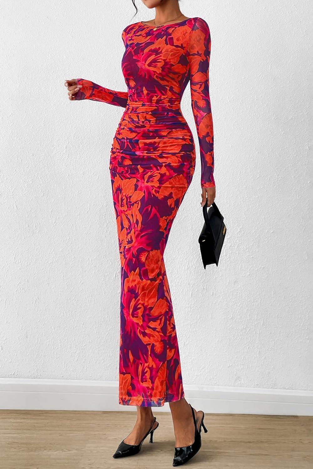 PRETTYGARDEN Women’s Long Sleeve Bodycon Dresses 2025 Fall Sexy Floral Mesh Slit Ruched Tight Maxi Wedding Guest Dress(Purple Orange)