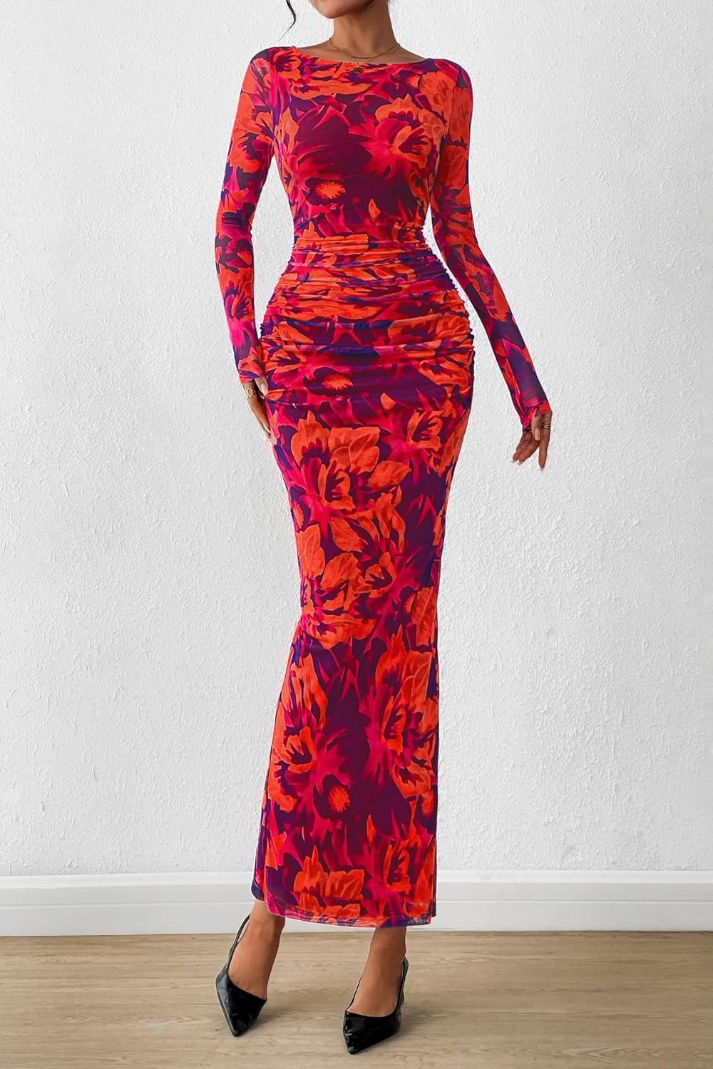PRETTYGARDEN Women’s Long Sleeve Bodycon Dresses 2025 Fall Sexy Floral Mesh Slit Ruched Tight Maxi Wedding Guest Dress(Red Flower)