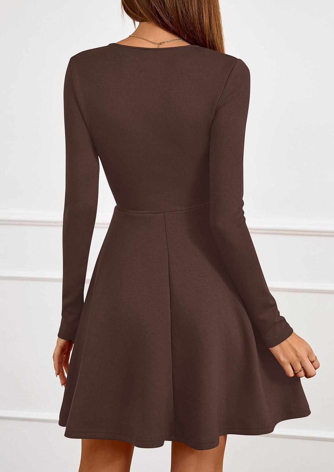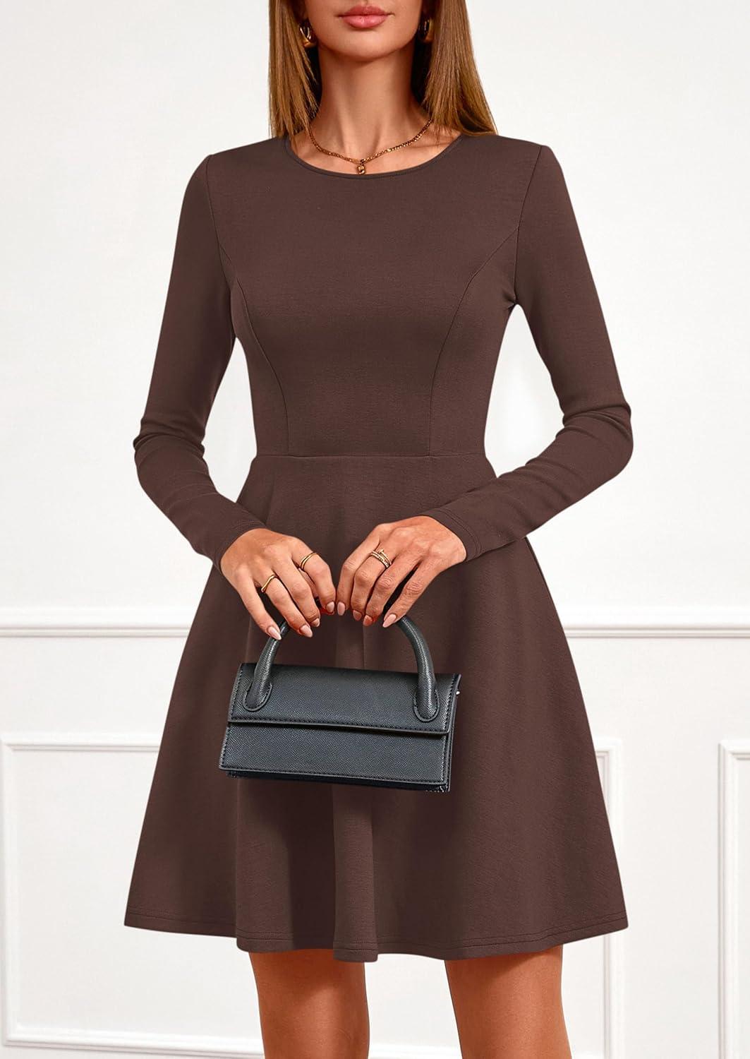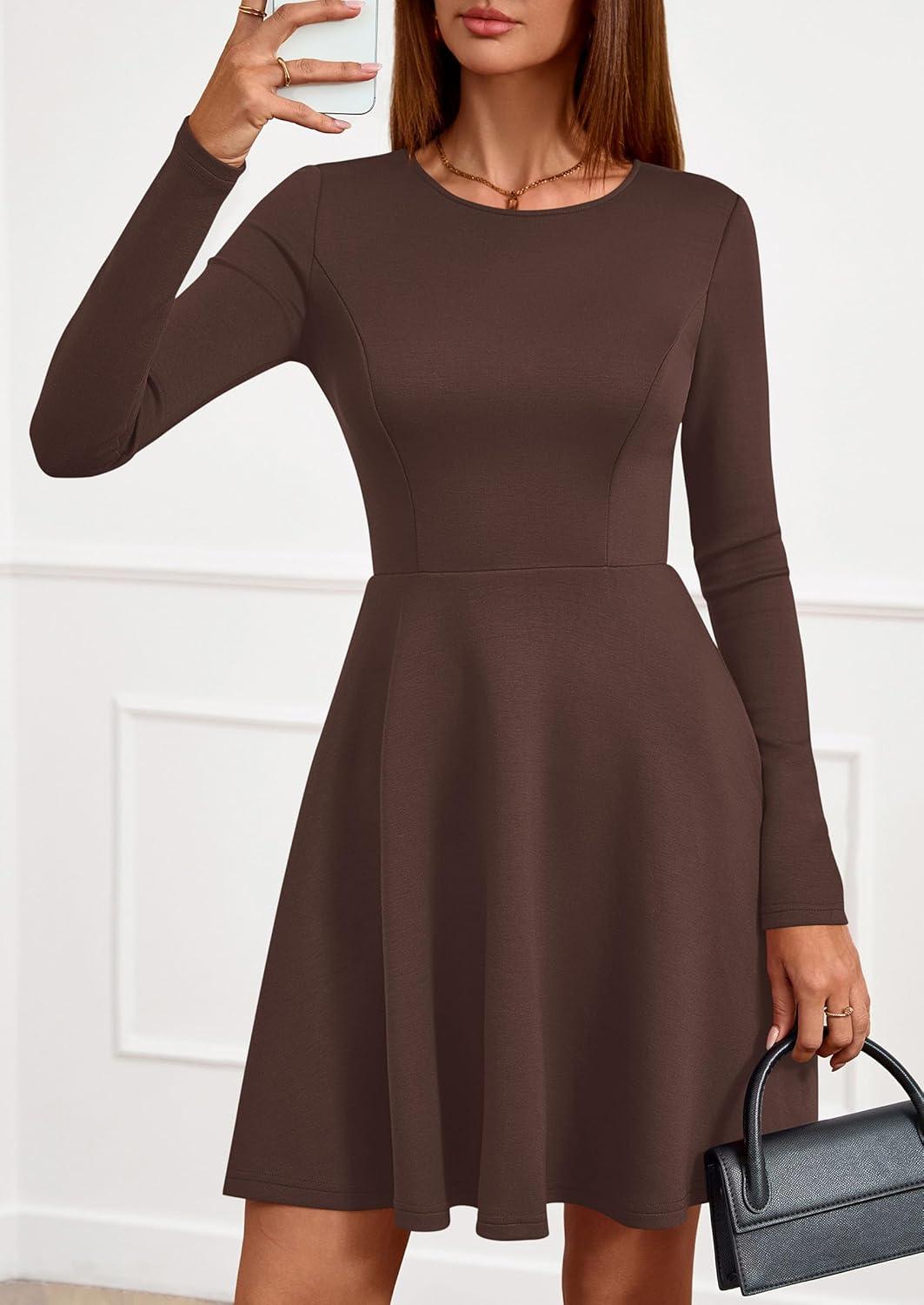 PRETTYGARDEN Womens Long Sleeve Cocktail Mini Dress 2025 Fall Crew Neck A Line Homecoming Party Short Dresses Elegant Classy(Brown)