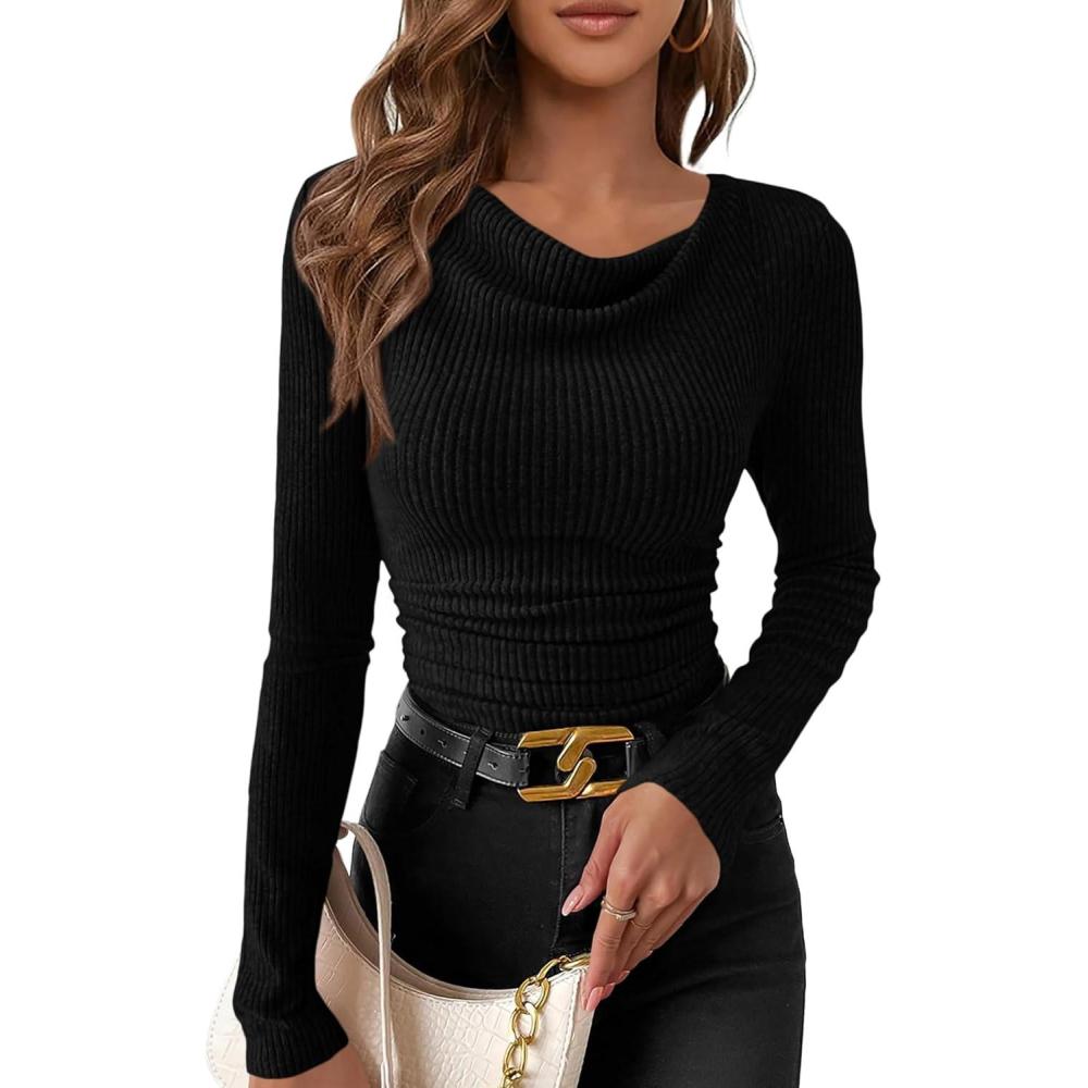 PRETTYGARDEN Women’s Long Sleeve Cowl Neck Ribbed Knit Fall Shirts Slim Fit Ruched Going Out Crop Tops Basic T-Shirts(Black)