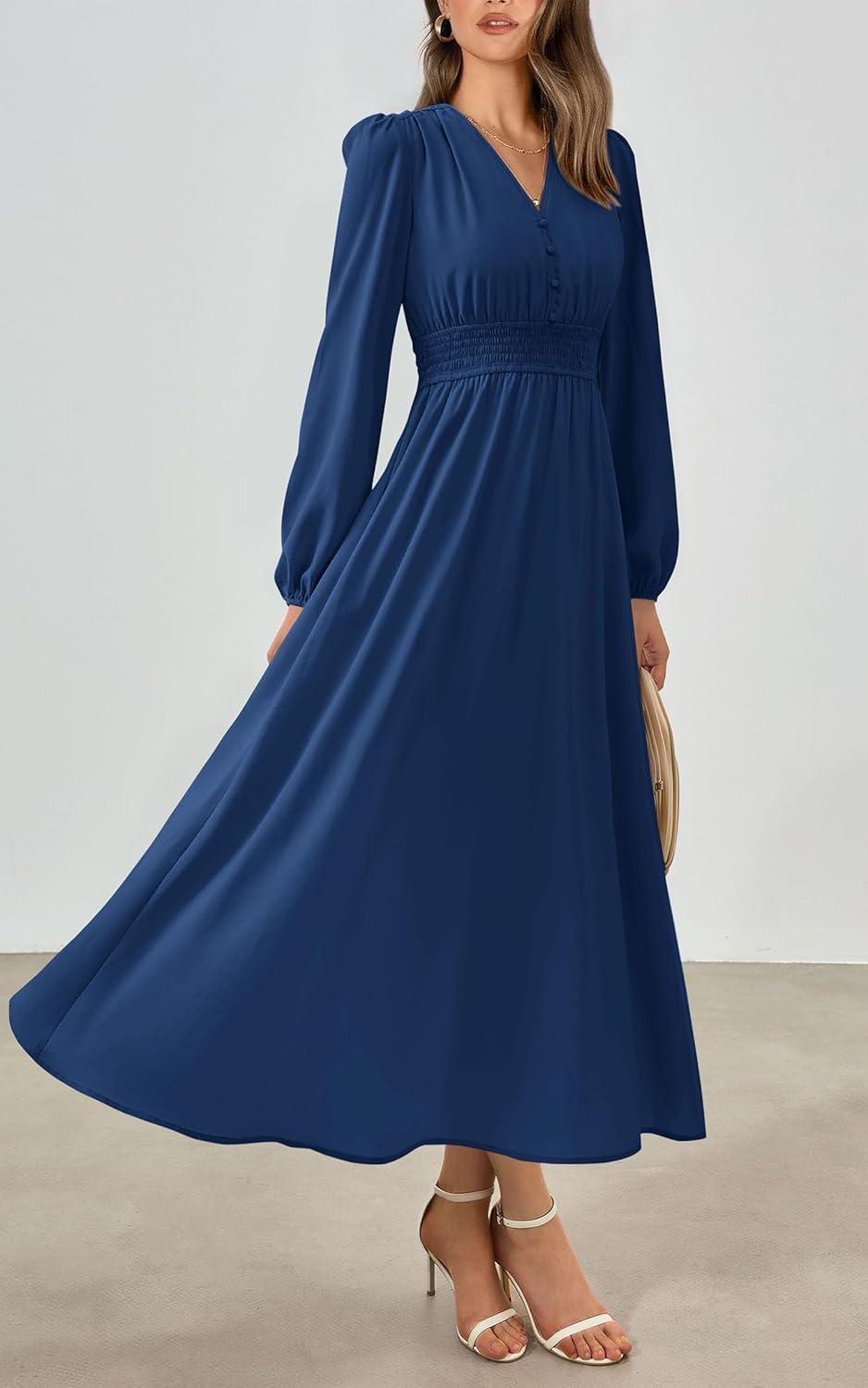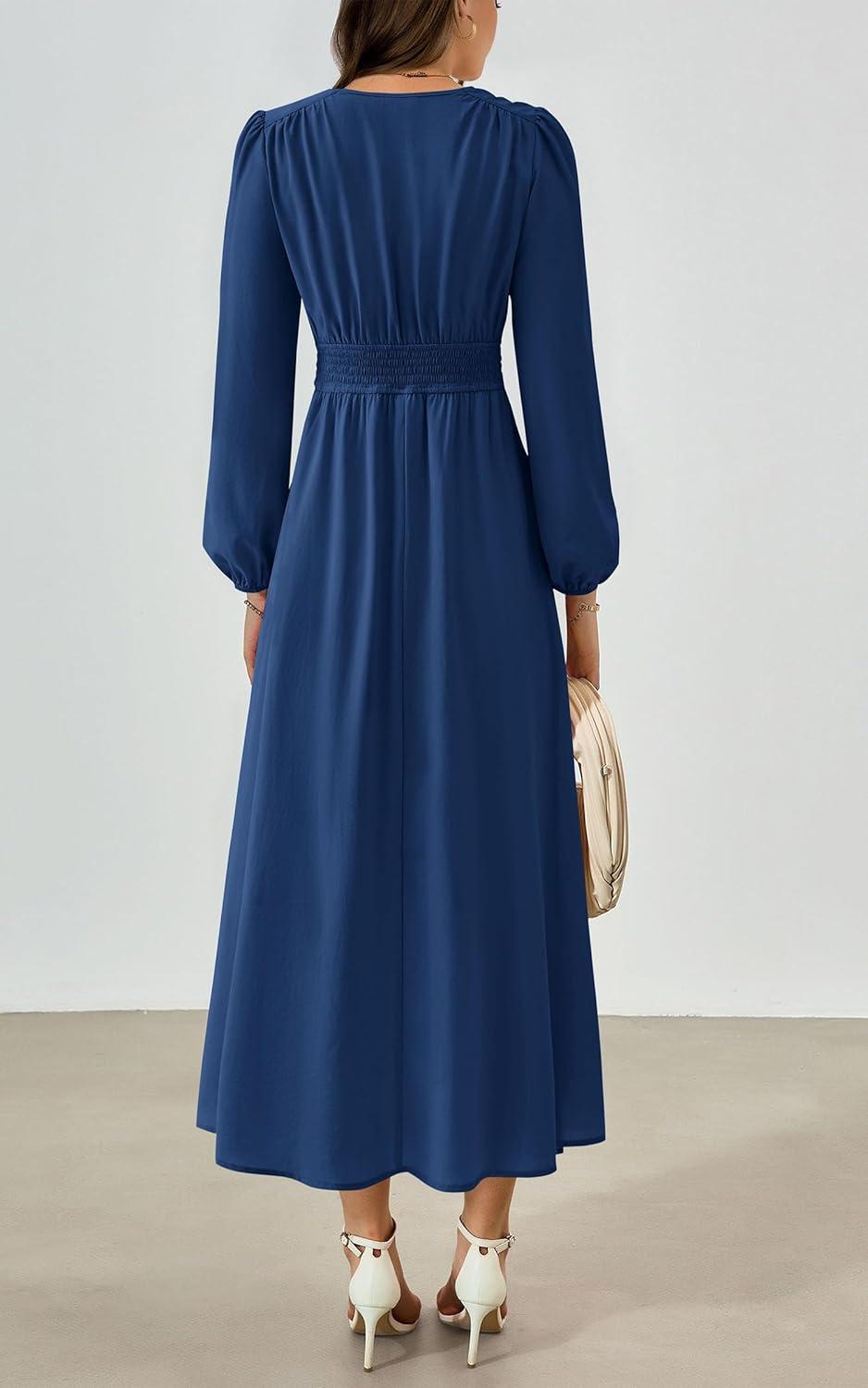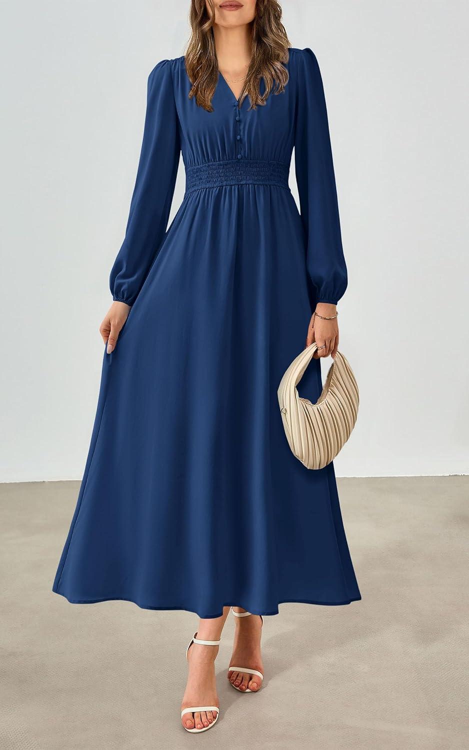 PRETTYGARDEN Womens Long Sleeve Maxi Dress 2025 Fall Trendy Elegant V Neck Flowy Wedding Guest Holiday Formal Long Dresses(Dark Blue)