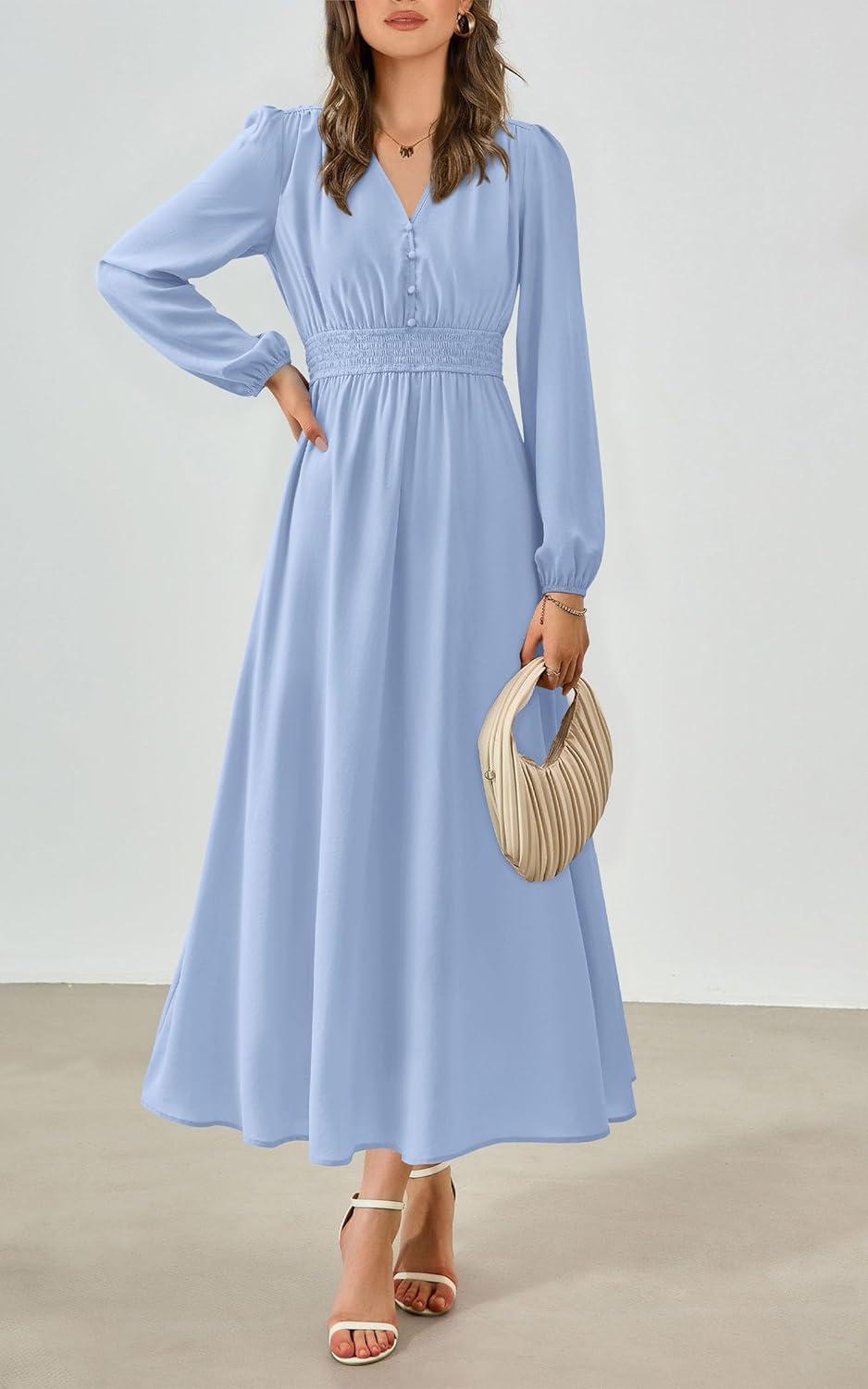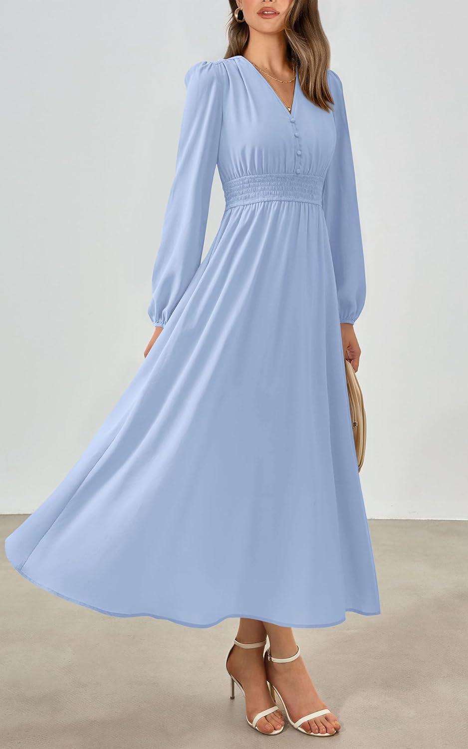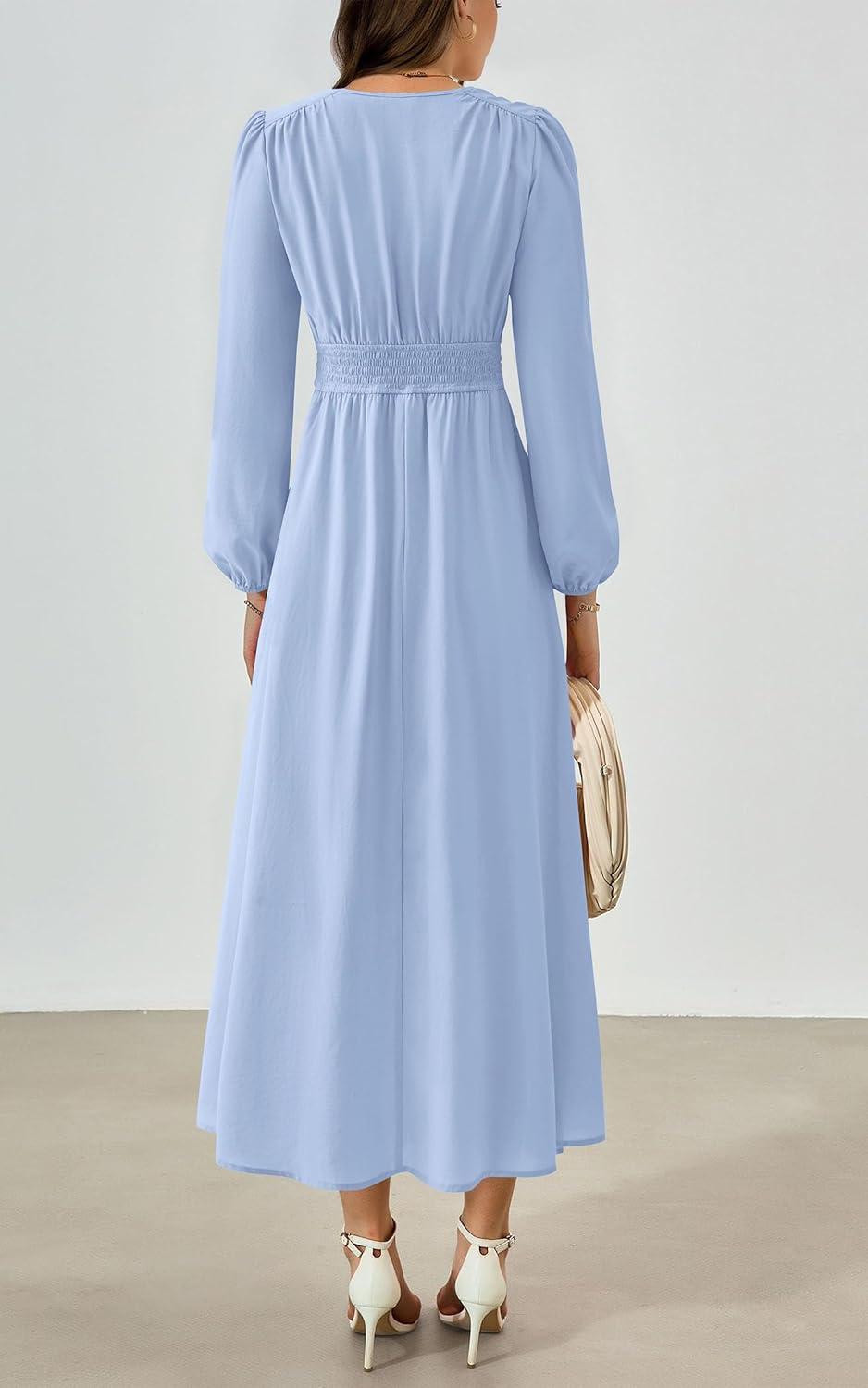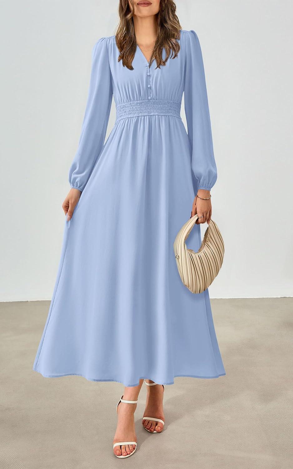 PRETTYGARDEN Womens Long Sleeve Maxi Dress 2025 Fall Trendy Elegant V Neck Flowy Wedding Guest Holiday Formal Long Dresses(Light Blue)
