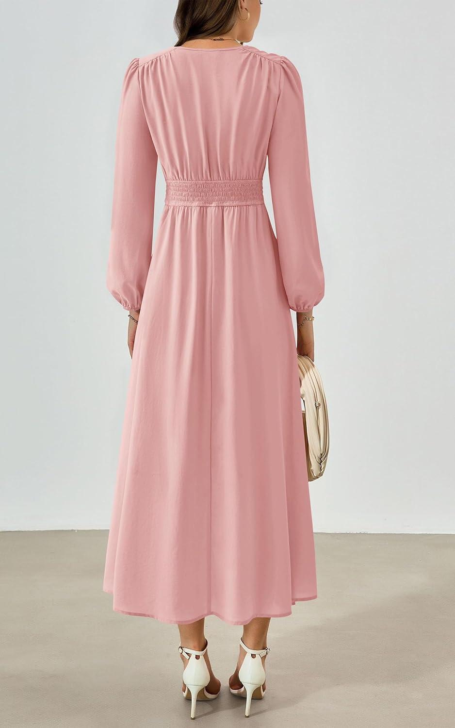 PRETTYGARDEN Womens Long Sleeve Maxi Dress 2025 Fall Trendy Elegant V Neck Flowy Wedding Guest Holiday Formal Long Dresses(Pink)