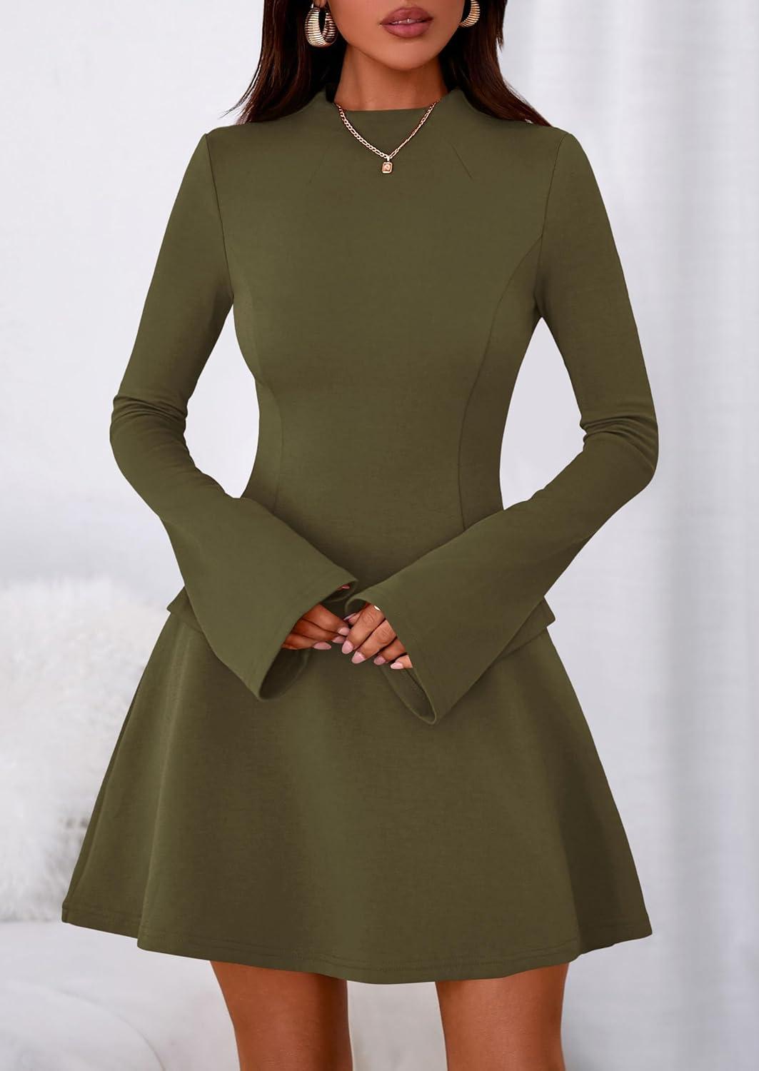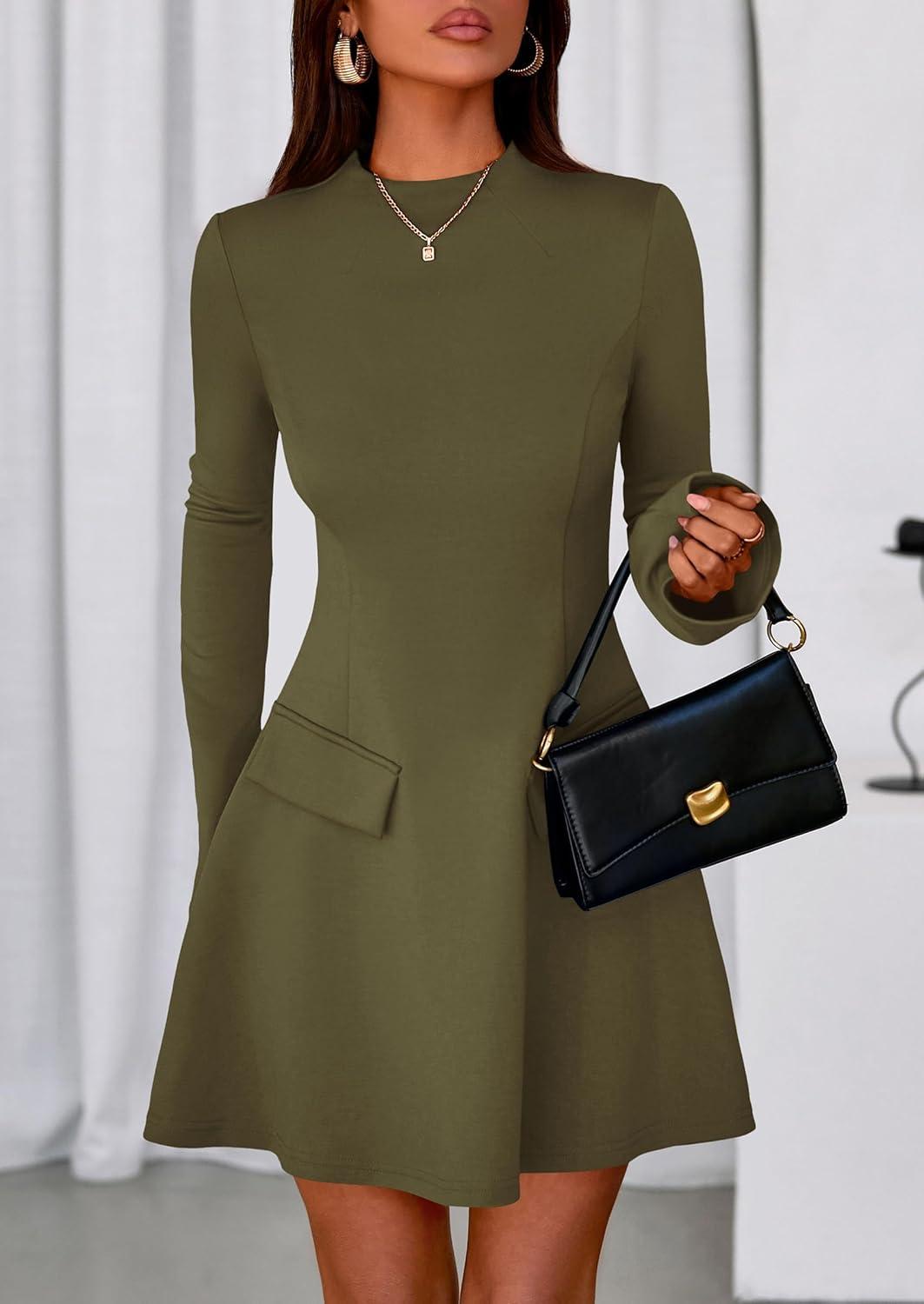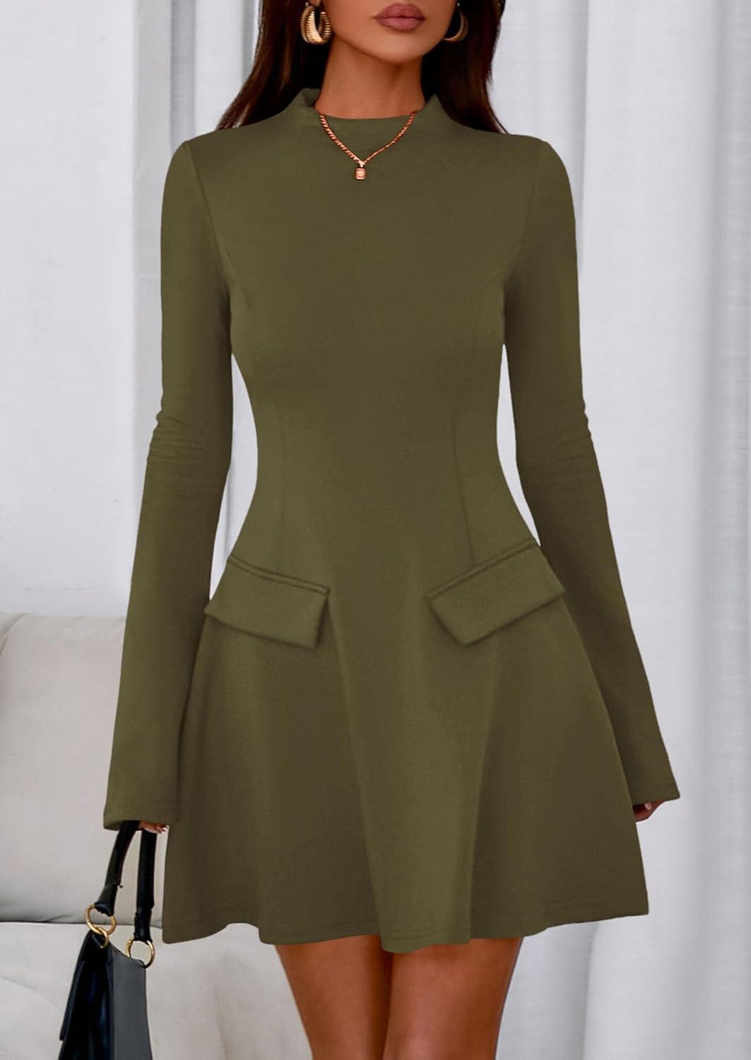 PRETTYGARDEN Women’s Long Sleeve Mini Dress 2025 Fall Bodycon Mock Neck Elegant Business Work Party Short Dresses(Army Green)