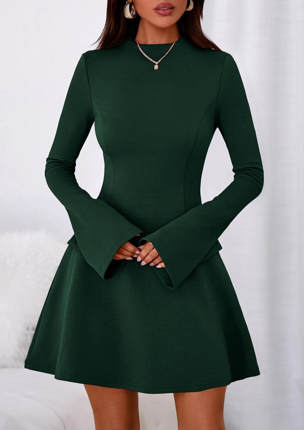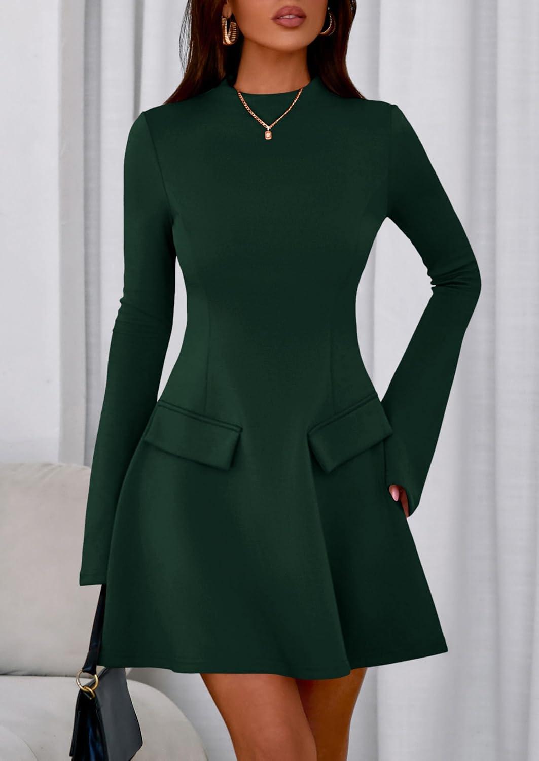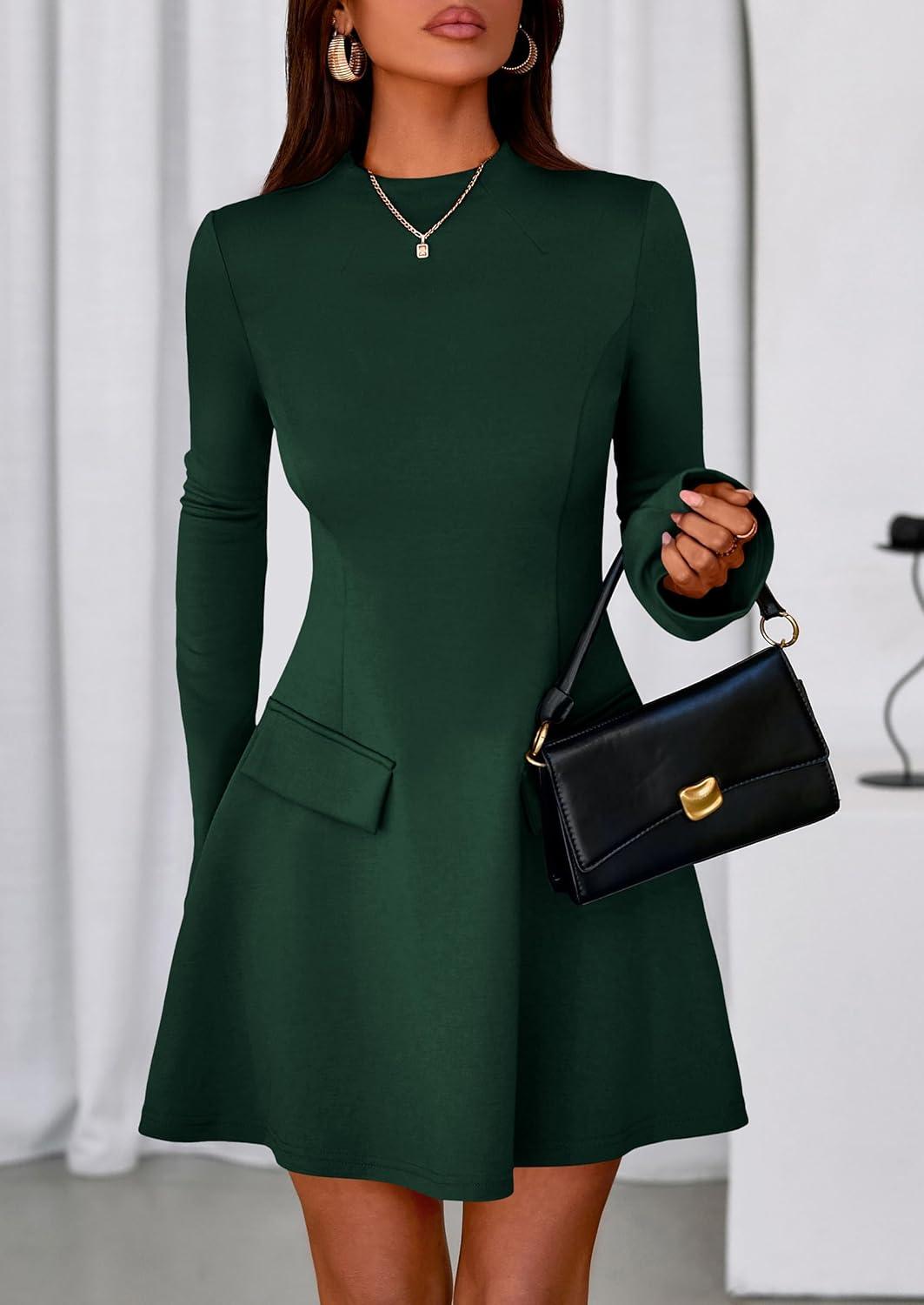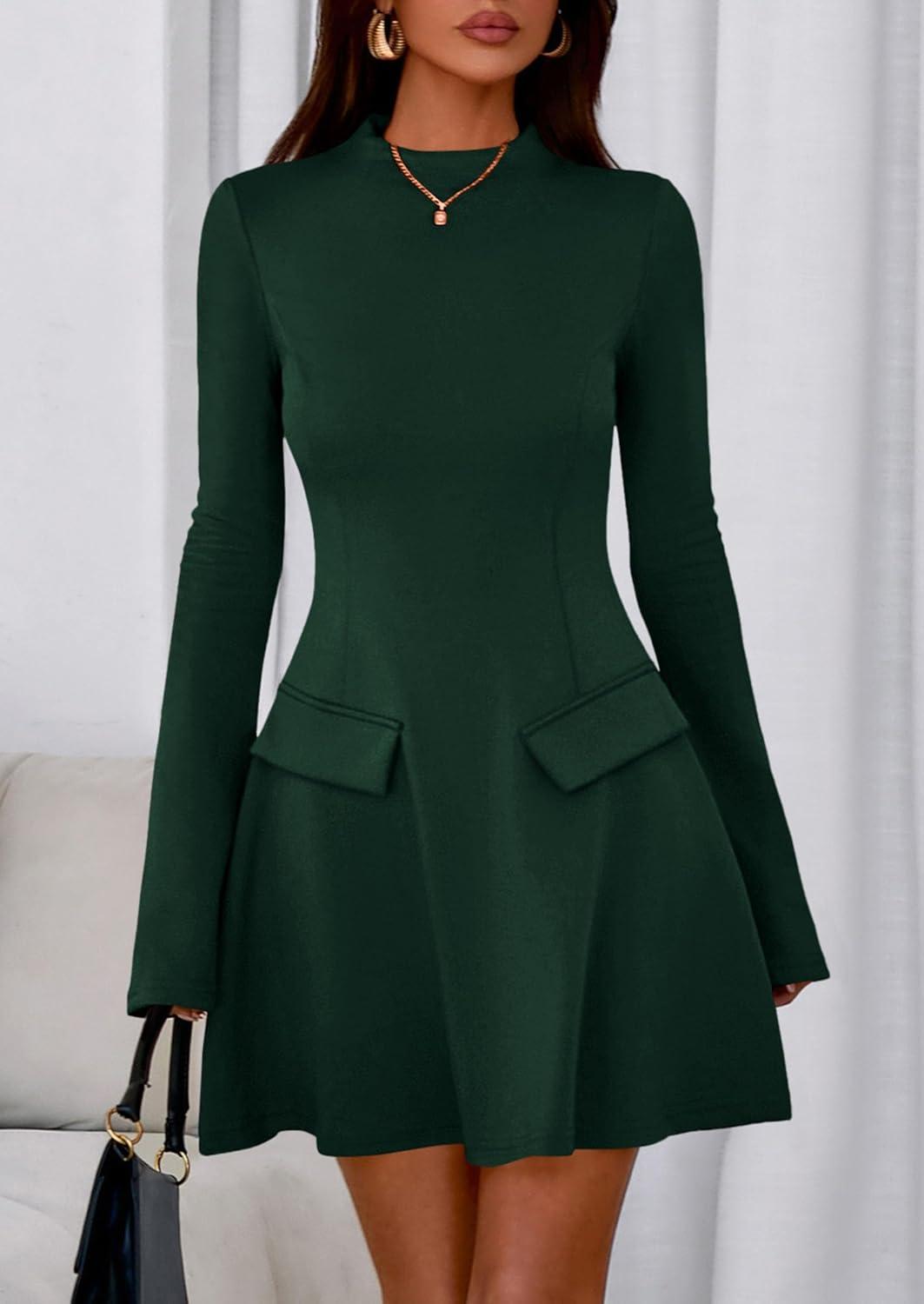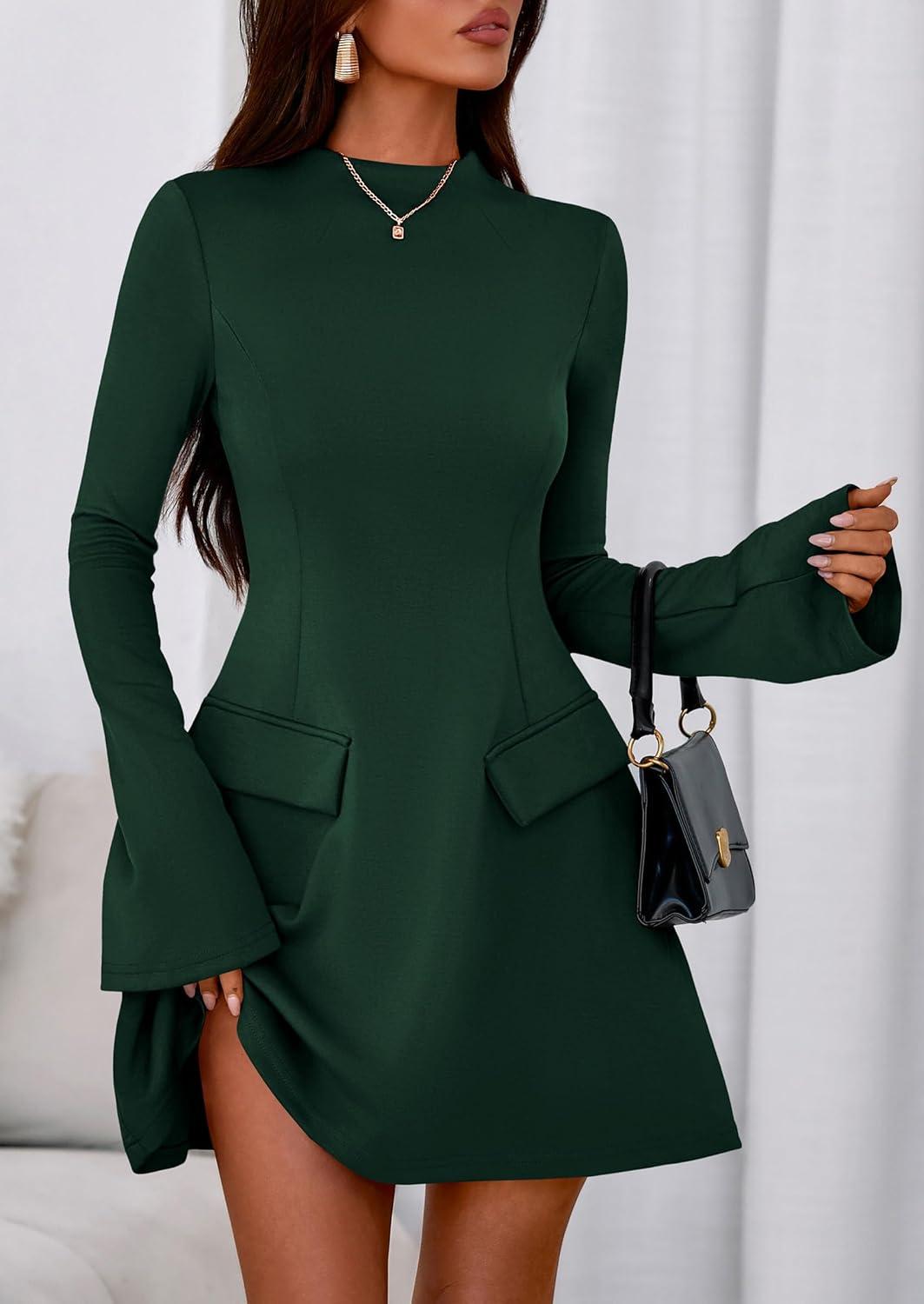 PRETTYGARDEN Women’s Long Sleeve Mini Dress 2025 Fall Bodycon Mock Neck Elegant Business Work Party Short Dresses(Dark Green)